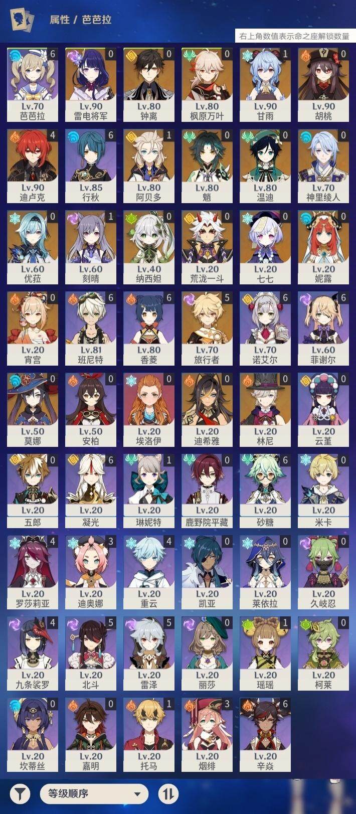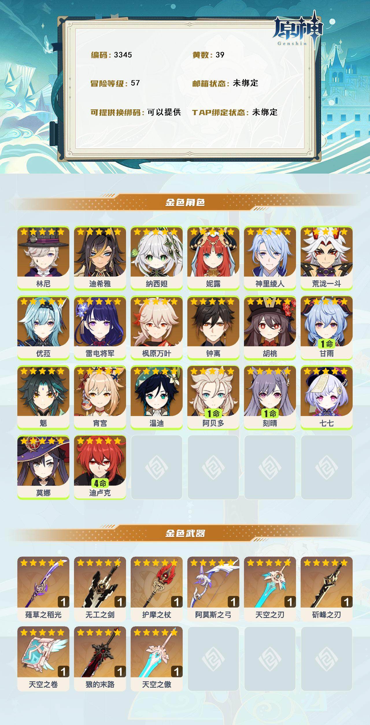 57级/39黄/男主/20个五星角色/12个五星武器 0命林尼0命迪希雅0命纳西妲0命妮露0命神里绫人0命荒泷一斗0命优菈0命雷电将军0命枫原万叶0命钟离0命胡桃1命甘雨0命魈0命宵宫0命温迪1命阿贝多1命刻晴0命七七0命莫娜4命迪卢克精1薙草之稻光精1无工之剑精1护摩之杖精1阿莫斯之弓精1天空之刃精1斫峰之刃精1天空之卷精1狼的末路精1天空之傲