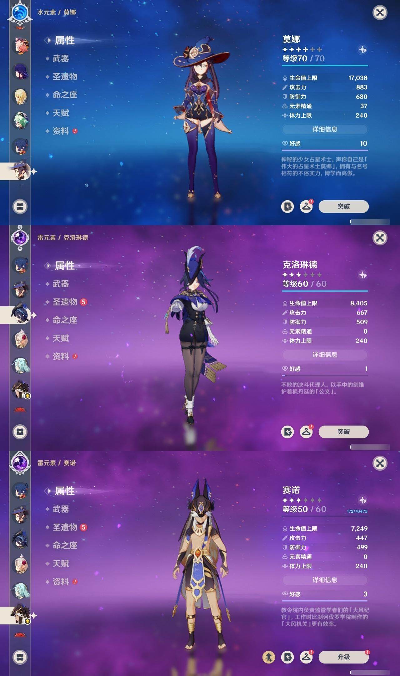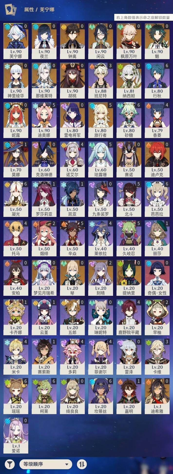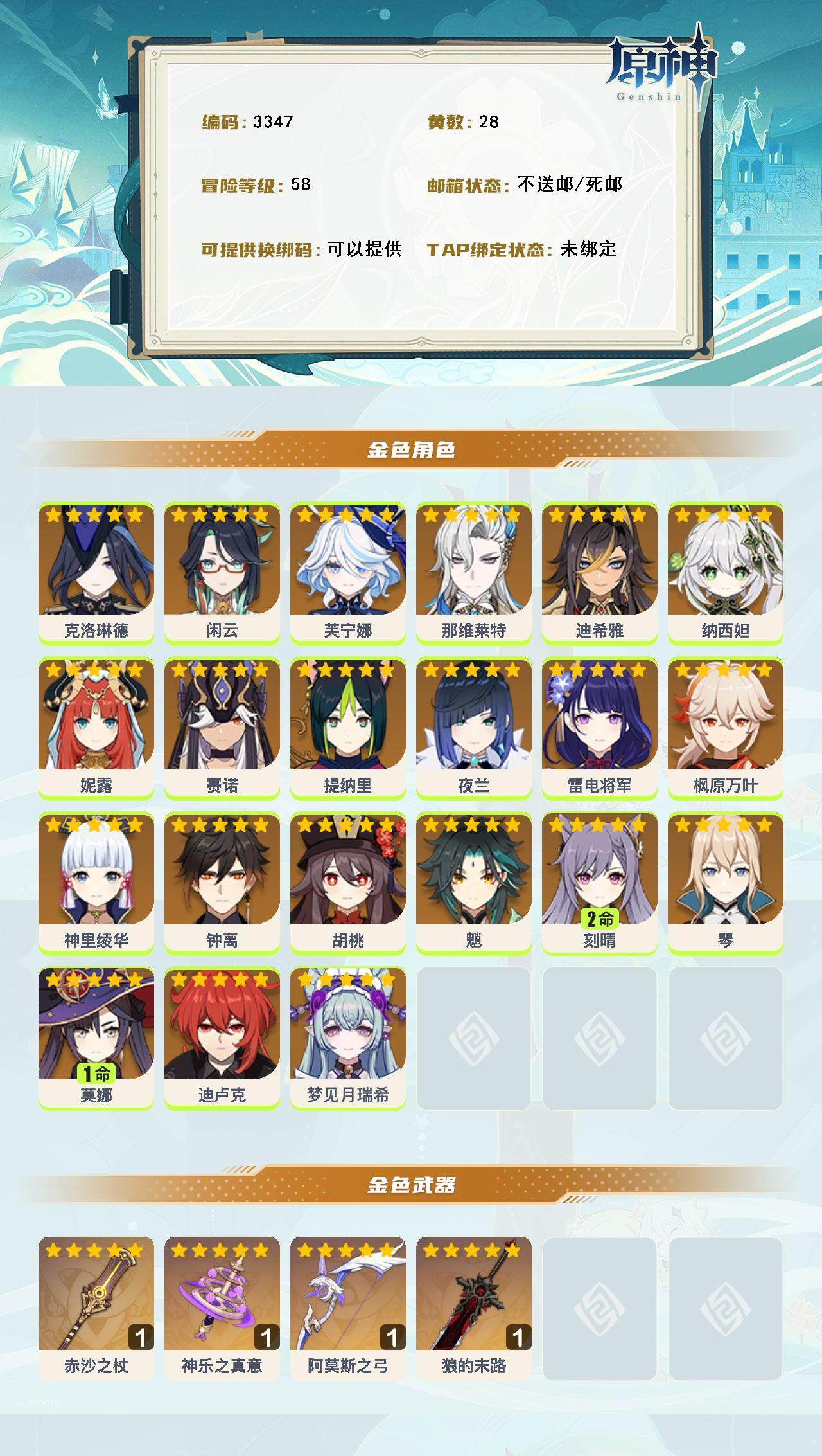 58级/28黄/女主/21个五星角色/4个五星武器 0命克洛琳德0命闲云0命芙宁娜0命那维莱特0命迪希雅0命纳西妲0命妮露0命赛诺0命提纳里0命夜兰0命雷电将军0命枫原万叶0命神里绫华0命钟离0命胡桃0命魈2命刻晴0命琴1命莫娜0命迪卢克0命梦见月瑞希精1赤沙之杖精1神乐之真意精1阿莫斯之弓精1狼的末路
