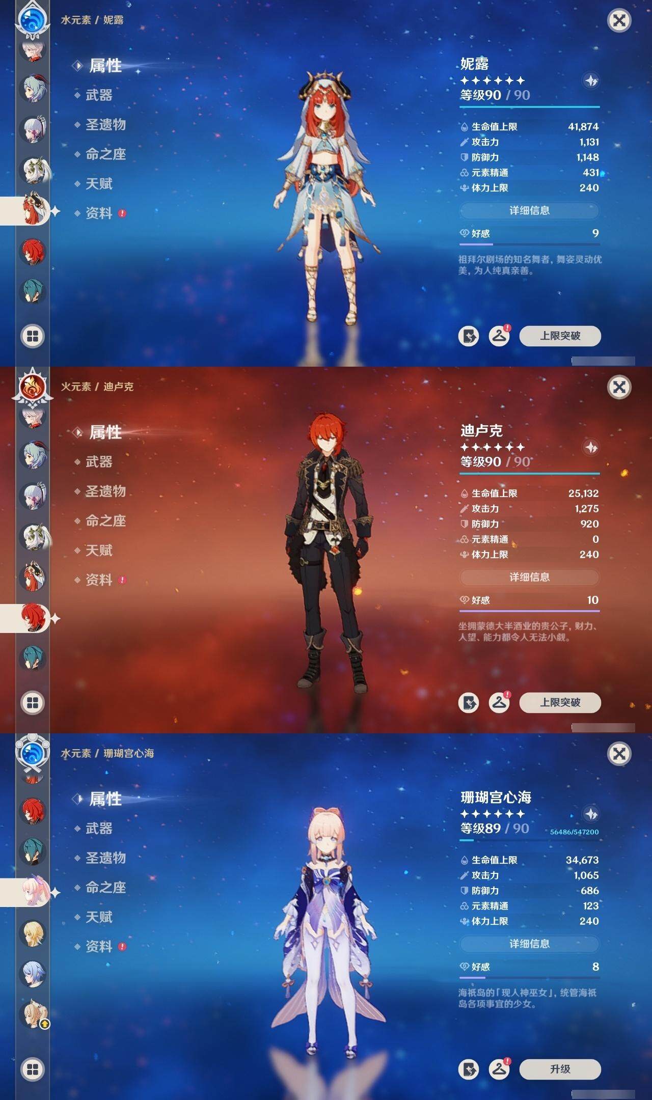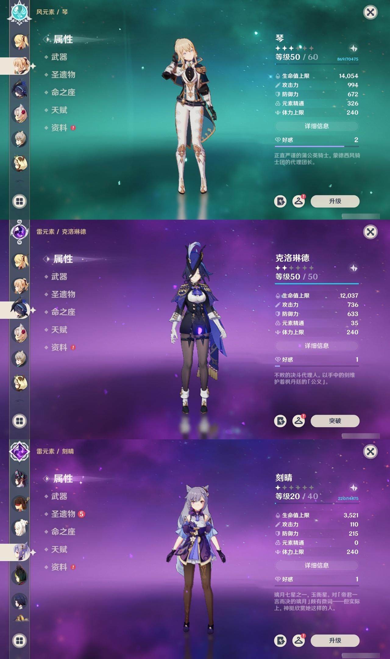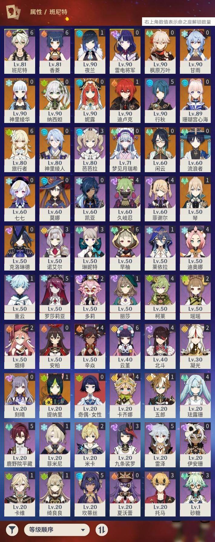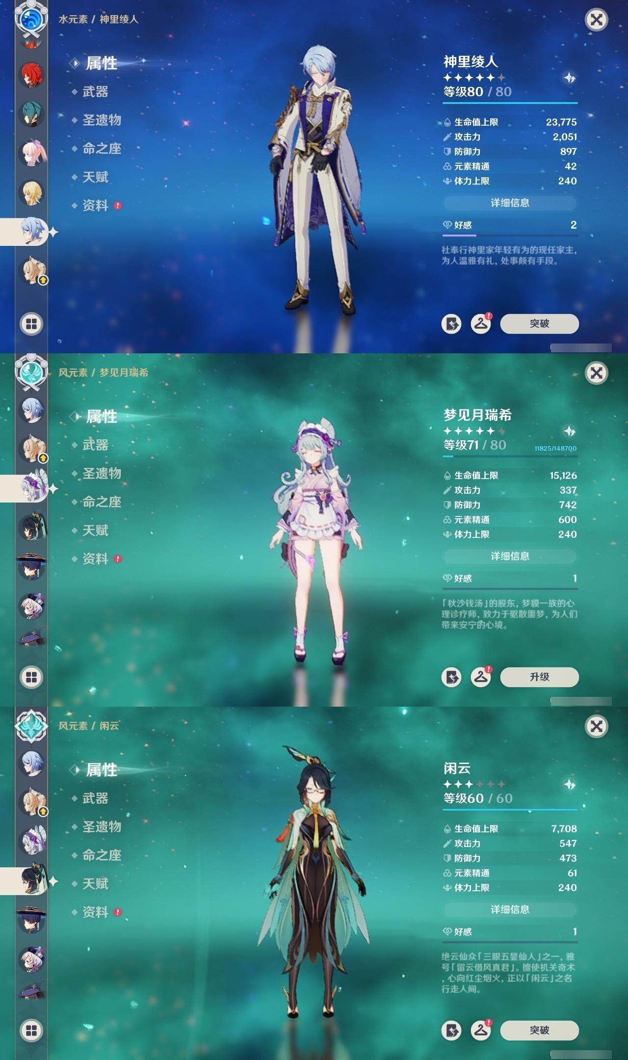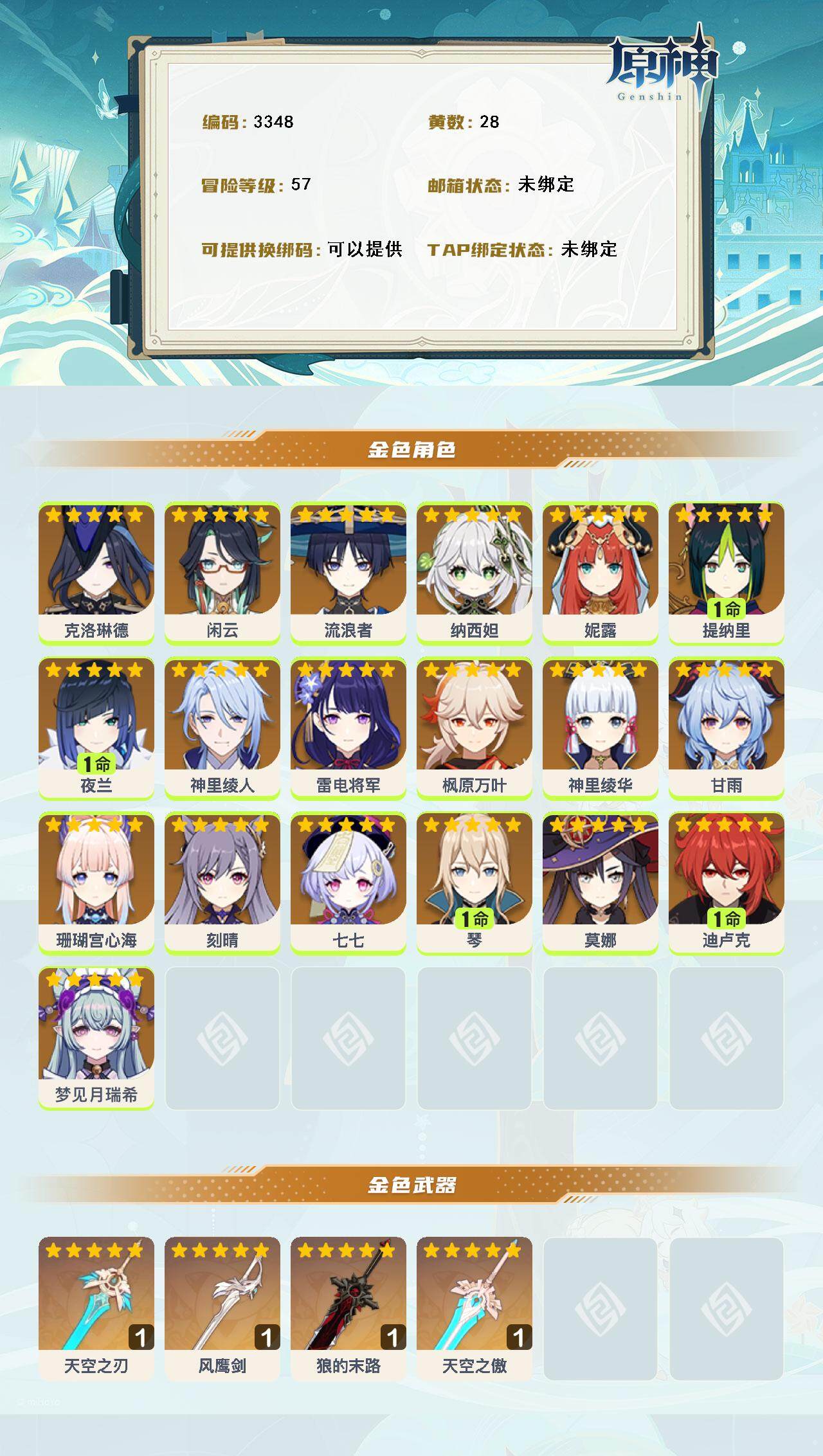 57级/28黄/女主/19个五星角色/5个五星武器 0命克洛琳德0命闲云0命流浪者0命纳西妲0命妮露1命提纳里1命夜兰0命神里绫人0命雷电将军0命枫原万叶0命神里绫华0命甘雨0命珊瑚宫心海0命刻晴0命七七1命琴0命莫娜1命迪卢克0命梦见月瑞希精1天空之刃精1风鹰剑精1狼的末路精1天空之傲