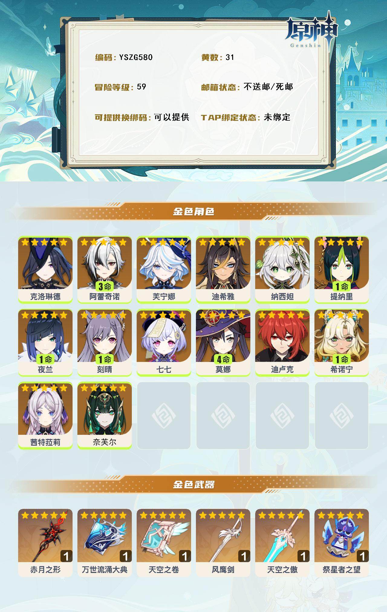 【yszg580】59级/31黄/女主/14个五星角色/6个五星武器/3命阿蕾奇诺/1命希诺宁/0命茜特菈莉/1命夜兰/0命克洛琳德/0命纳西妲/0命芙宁娜/4命莫娜/0命奈芙尔/1命刻晴/1命提纳里/0命七七/0命迪希雅/0命迪卢克/精1祭星者之望/精1天空之卷/精1赤月之形/精1风鹰剑/精1万世流涌大典/精1天空之傲