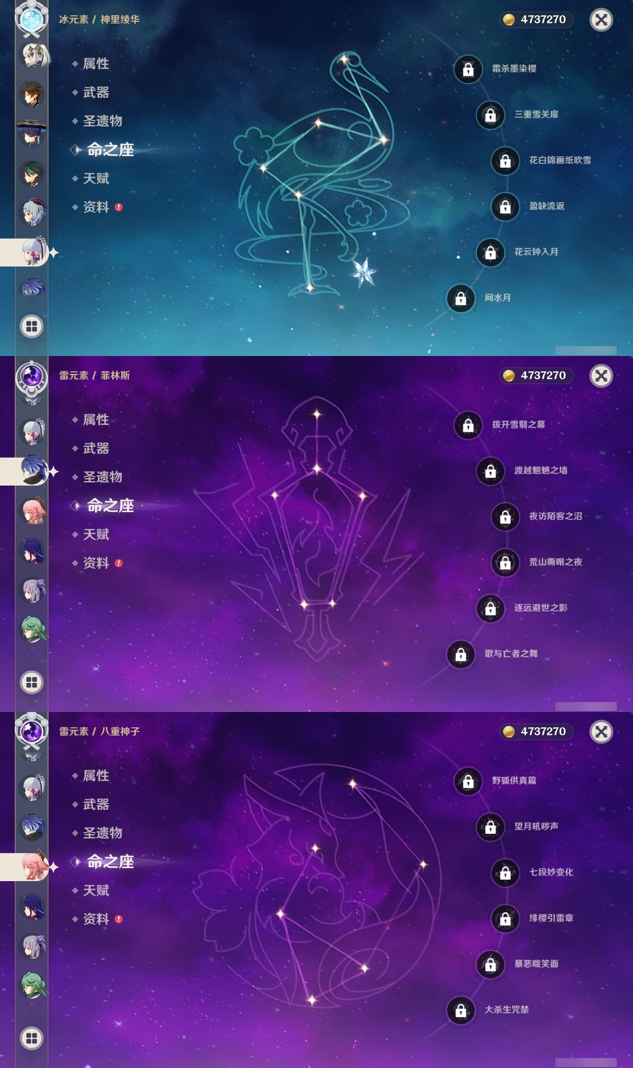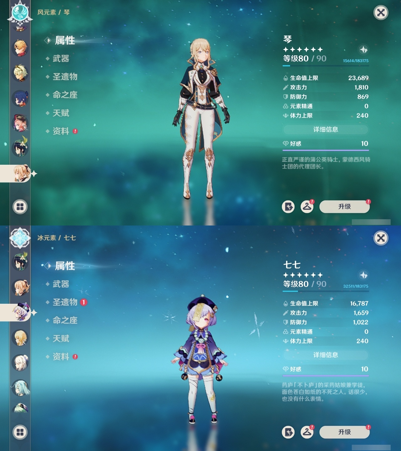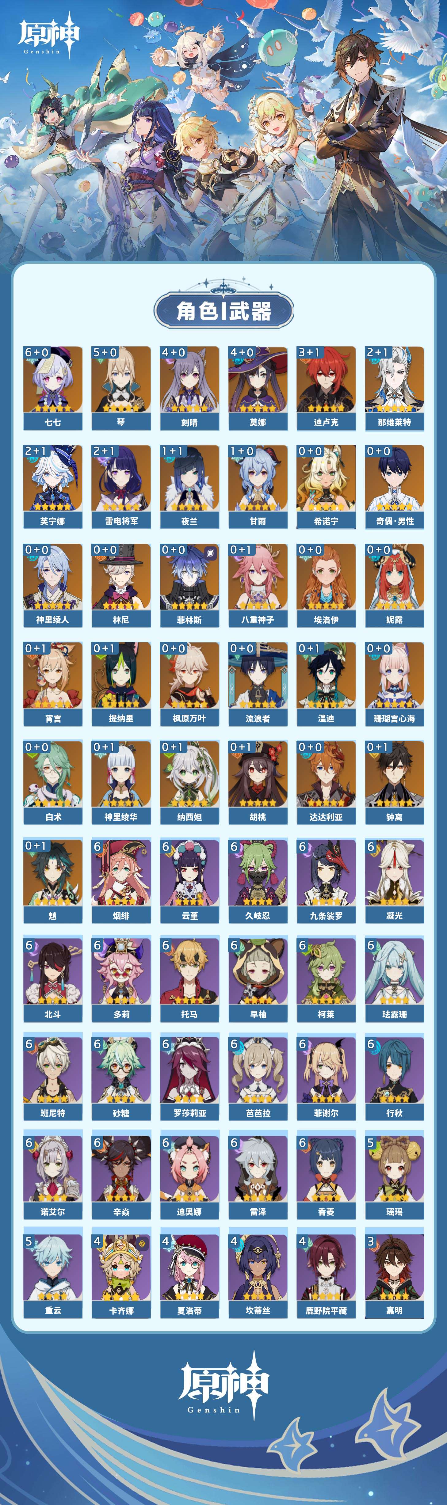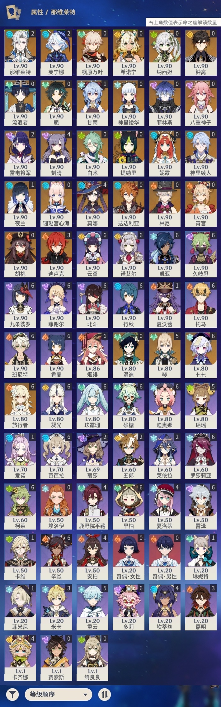 【原神】【lyys8070】冒险等级:60,五星数量:52,五星角色:七七 6命琴 5命刻晴 4命莫娜 4命迪卢克 3命那维莱特 2命芙宁娜 2命雷电将军 2命甘雨 1命夜兰 1命珊瑚宫心海希诺宁白术神里绫华温迪宵宫钟离达达利亚八重神子神里绫人林尼提纳里妮露纳西妲菲林斯流浪者枫原万叶魈胡桃__五星武器:天空之傲 2精万世流涌大典静水流涌之辉裁叶萃光飞雷之弦振和璞鸢护摩之杖狼的末路磐岩结绿天空之脊天空之卷天空之翼雾切之回光薙草之稻光终末嗟叹之诗神乐之真意贯虹之槊若水猎人之径千夜浮梦__四星角色:班尼特 6命行秋 6命九条裟罗 6命香菱 6命久岐忍 6命珐露珊 6命凝光 6命迪奥娜 6命砂糖 6命多莉 6命柯莱 6命芭芭拉 6命云堇 6命早柚 6命托马 6命烟绯 6命辛焱 6命诺艾尔 6命罗莎莉亚 6命雷泽 6命菲谢尔 6命北斗 6命瑶瑶 5命重云 5命卡齐娜 4命鹿野院平藏 4命坎蒂丝 4命夏洛蒂 4命米卡 3命嘉明 3命莱依拉 2命五郎 2命卡维 1命菲米尼 1命琳妮特 1命夏沃蕾 1命爱诺 1命埃洛伊奇偶·女性奇偶·男性绮良良赛索斯