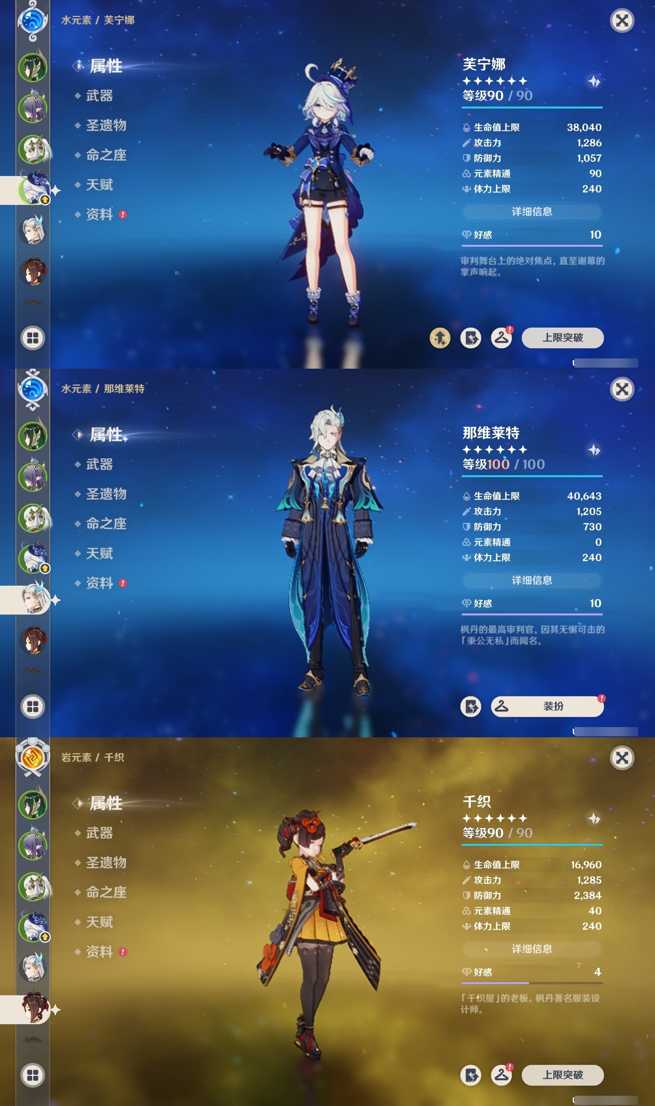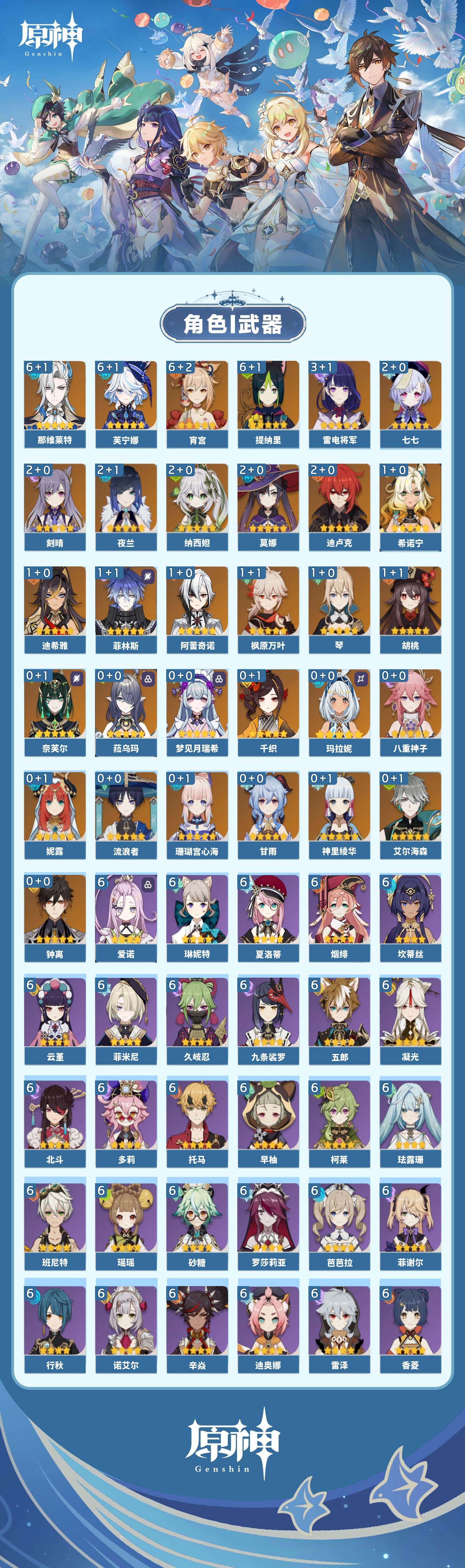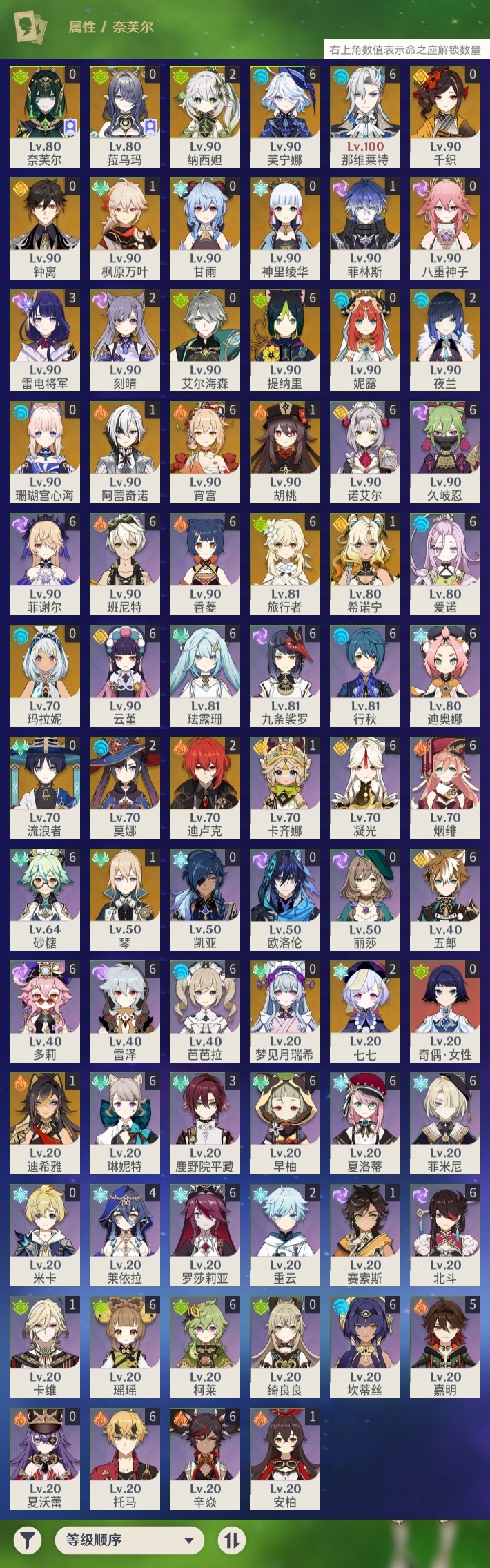 【原神】满命,冒险等级:60,五星数量:57,五星角色:那维莱特 6命芙宁娜 6命宵宫 6命提纳里 6命雷电将军 3命迪卢克 2命刻晴 2命莫娜 2命七七 2命夜兰 2命纳西妲 2命希诺宁 1命迪希雅 1命阿蕾奇诺 1命菲林斯 1命枫原万叶 1命胡桃 1命琴 1命玛拉妮珊瑚宫心海神里绫华钟离梦见月瑞希八重神子千织妮露菈乌玛艾尔海森奈芙尔流浪者甘雨__五星武器:飞雷之弦振 2精最初的大魔术万世流涌大典静水流涌之辉有乐御簾切血染荒城真语秘匣裁叶萃光不灭月华苍古自由之誓护摩之杖四风原典天空之傲天空之卷天空之刃天空之翼雾切之回光薙草之稻光斫峰之刃赤角石溃杵波乱月白经津若水猎人之径赤沙之杖圣显之钥__四星角色:班尼特 6命行秋 6命九条裟罗 6命香菱 6命久岐忍 6命珐露珊 6命凝光 6命迪奥娜 6命砂糖 6命瑶瑶 6命坎蒂丝 6命多莉 6命柯莱 6命芭芭拉 6命云堇 6命早柚 6命托马 6命五郎 6命烟绯 6命辛焱 6命诺艾尔 6命罗莎莉亚 6命雷泽 6命菲谢尔 6命北斗 6命菲米尼 6命琳妮特 6命夏洛蒂 6命爱诺 6命嘉明 5命莱依拉 4命鹿野院平藏 3命重云 2命卡齐娜 1命卡维 1命赛索斯 1命奇偶·女性绮良良米卡欧洛伦夏沃蕾