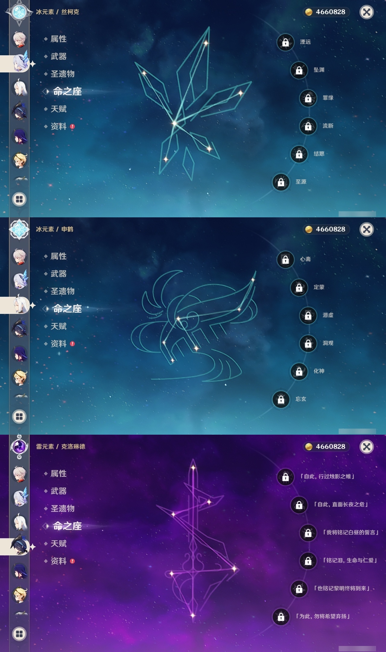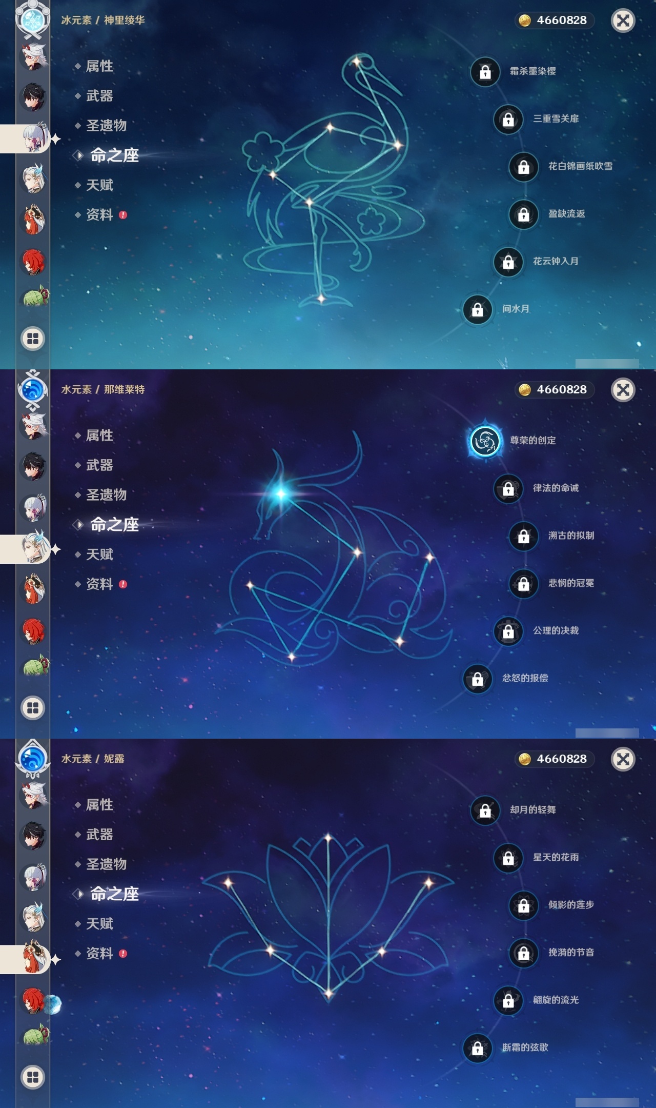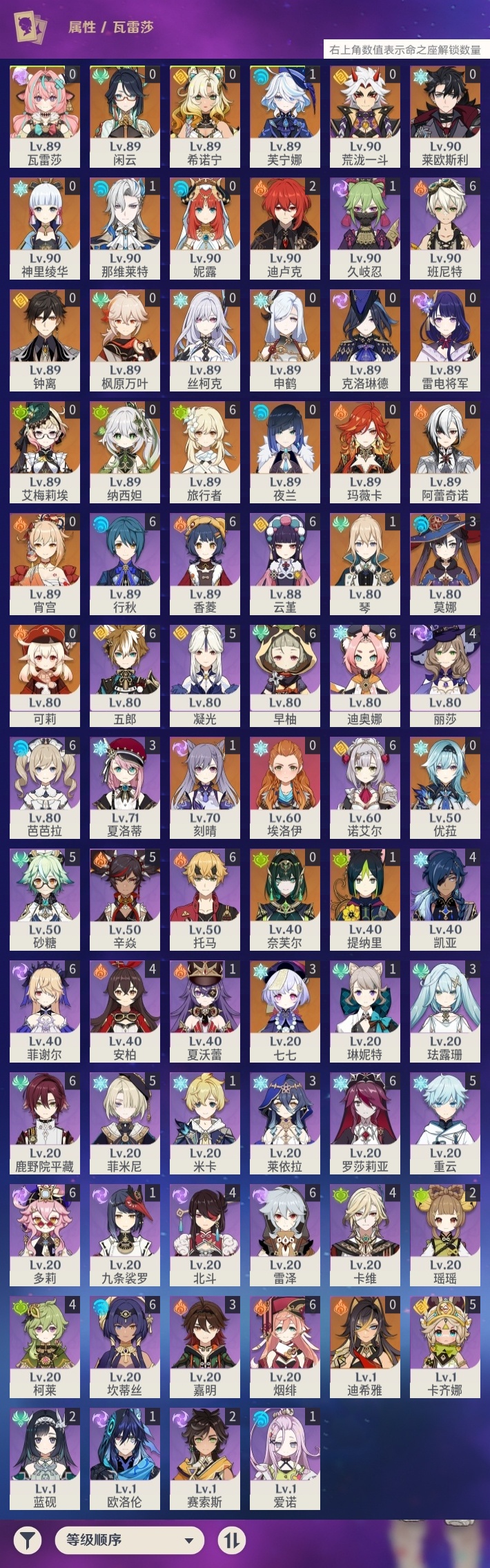【原神】【lyys8083】冒险等级:60,五星数量:46,五星角色:莫娜 3命七七 3命迪卢克 2命那维莱特 1命芙宁娜 1命刻晴 1命琴 1命提纳里 1命艾梅莉埃希诺宁神里绫华玛薇卡宵宫优菈迪希雅钟离荒泷一斗申鹤瓦雷莎莱欧斯利夜兰闲云阿蕾奇诺丝柯克妮露纳西妲奈芙尔枫原万叶克洛琳德可莉雷电将军__五星武器:星鹫赤羽万世流涌大典飞雷之弦振风鹰剑和璞鸢狼的末路天空之脊天空之卷天空之刃天空之翼无工之剑薙草之稻光赤角石溃杵圣显之钥__四星角色:班尼特 6命行秋 6命香菱 6命鹿野院平藏 6命迪奥娜 6命坎蒂丝 6命多莉 6命芭芭拉 6命云堇 6命早柚 6命托马 6命五郎 6命烟绯 6命诺艾尔 6命罗莎莉亚 6命雷泽 6命菲谢尔 6命卡齐娜 5命凝光 5命砂糖 5命重云 5命辛焱 5命菲米尼 5命柯莱 4命卡维 4命北斗 4命珐露珊 3命莱依拉 3命夏洛蒂 3命嘉明 3命瑶瑶 2命蓝砚 2命赛索斯 2命九条裟罗 1命久岐忍 1命米卡 1命欧洛伦 1命琳妮特 1命夏沃蕾 1命爱诺 1命埃洛伊