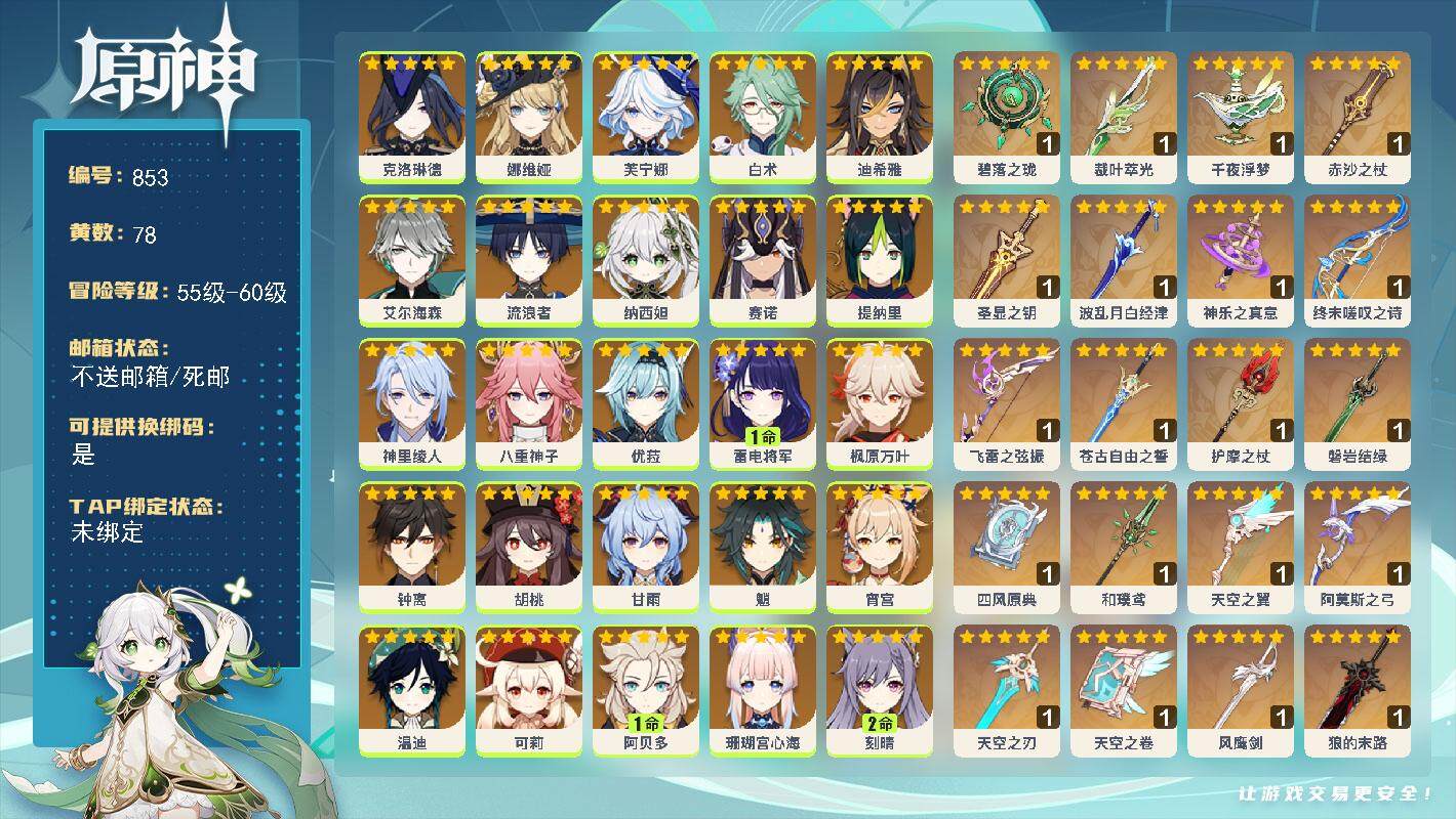[13888597]60级/78黄/男主/33个五星角色/28个五星武器 0命克洛琳德0命娜维娅0命芙宁娜0命白术0命迪希雅0命艾尔海森0命流浪者0命纳西妲0命赛诺0命提纳里0命神里绫人0命八重神子0命优菈1命雷电将军0命枫原万叶0命钟离0命胡桃0命甘雨0命魈0命宵宫0命温迪0命可莉1命阿贝多0命珊瑚宫心海2命刻晴2命七七4命琴2命莫娜5命迪卢克0命玛拉妮0命玛薇卡0命茜特菈莉0命梦见月瑞希精1碧落之珑精1裁叶萃光精1千夜浮梦精1赤沙之杖精1圣显之钥精1波乱月白经津精1神乐之真意精1终末嗟叹之诗精1飞雷之弦振精1苍古自由之誓精1护摩之杖精1磐岩结绿精1四风原典精1和璞鸢精1天空之翼精1阿莫斯之弓精1天空之刃精1天空之卷精1风鹰剑精1狼的末路