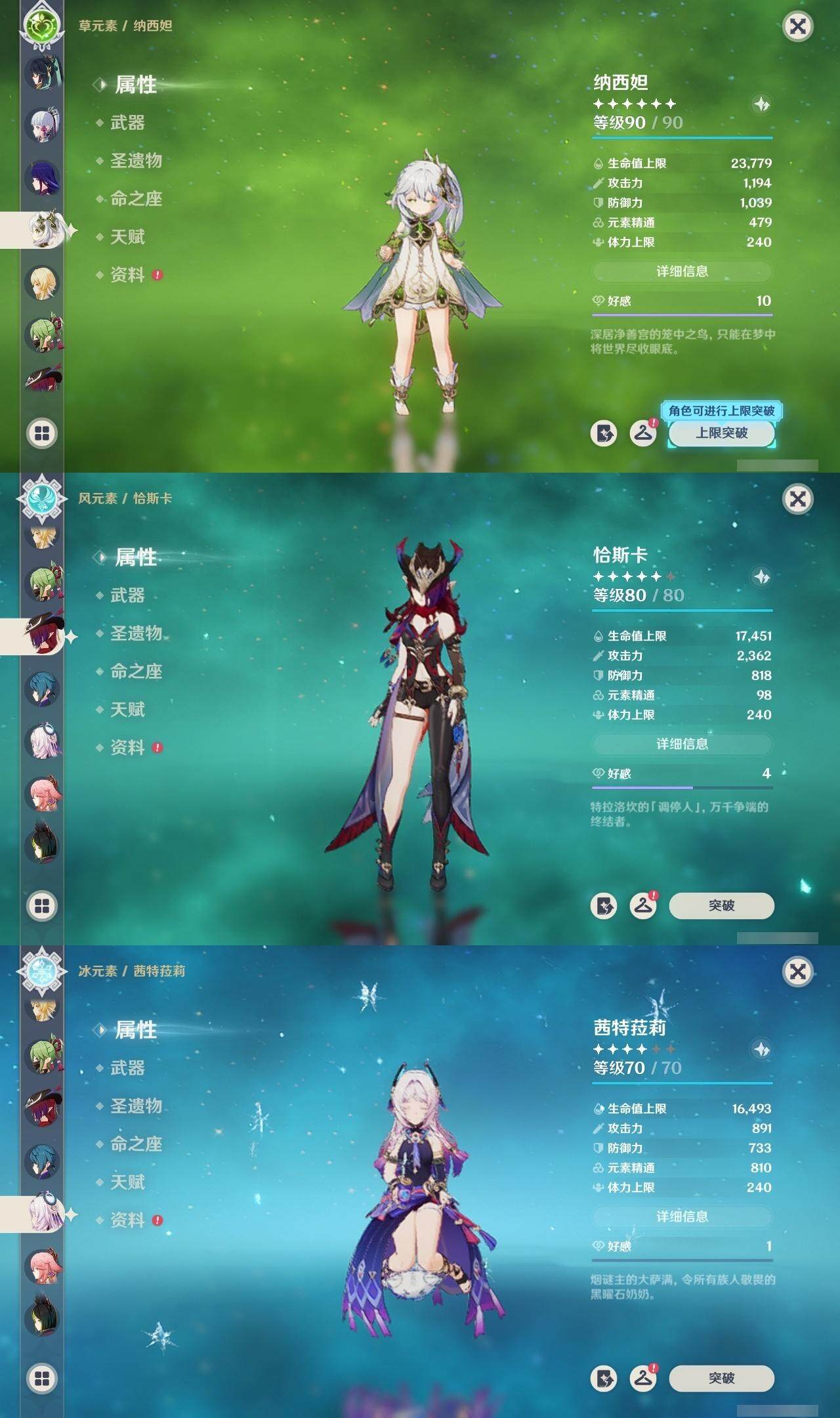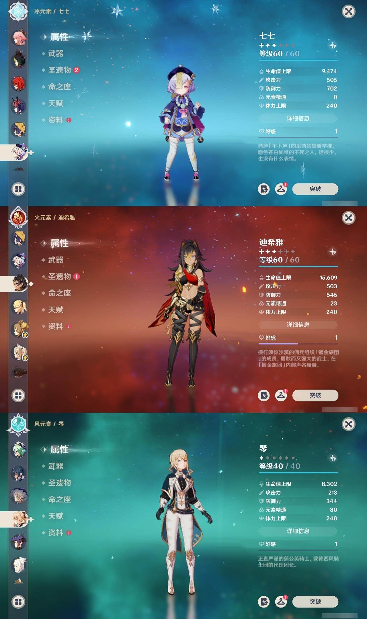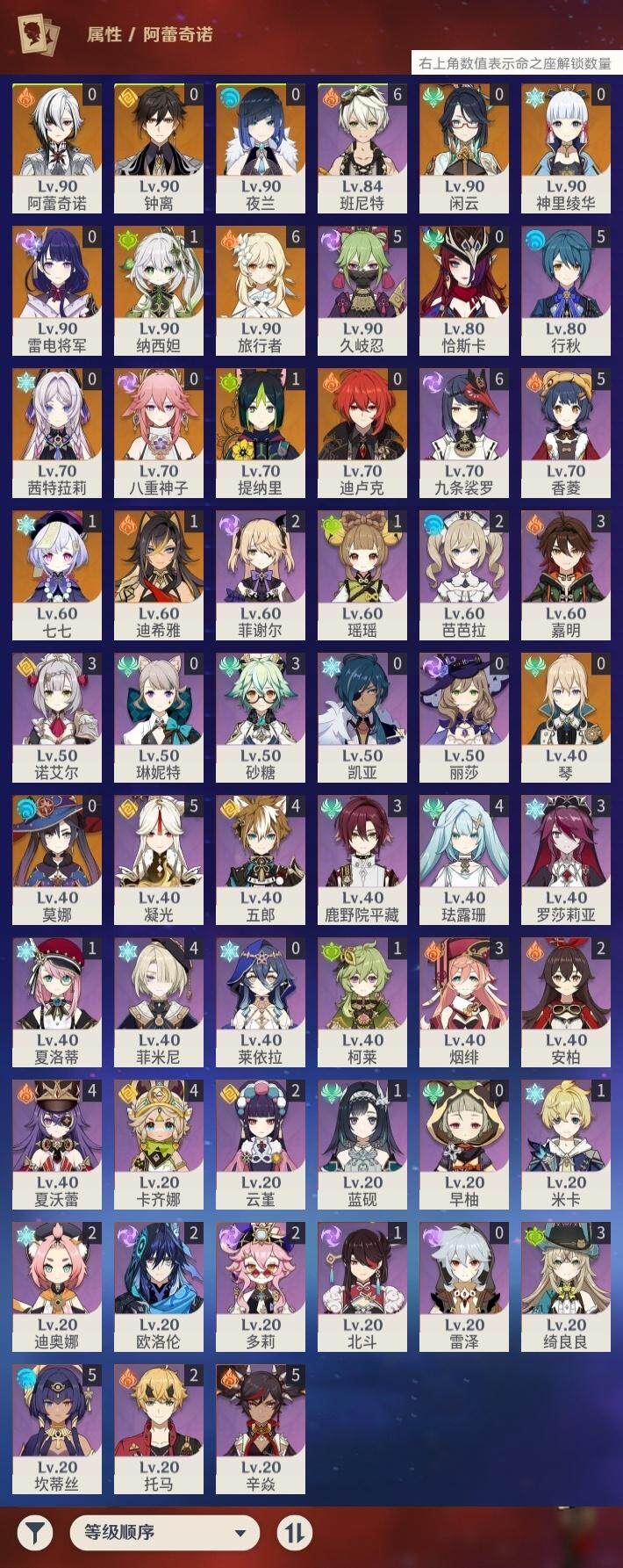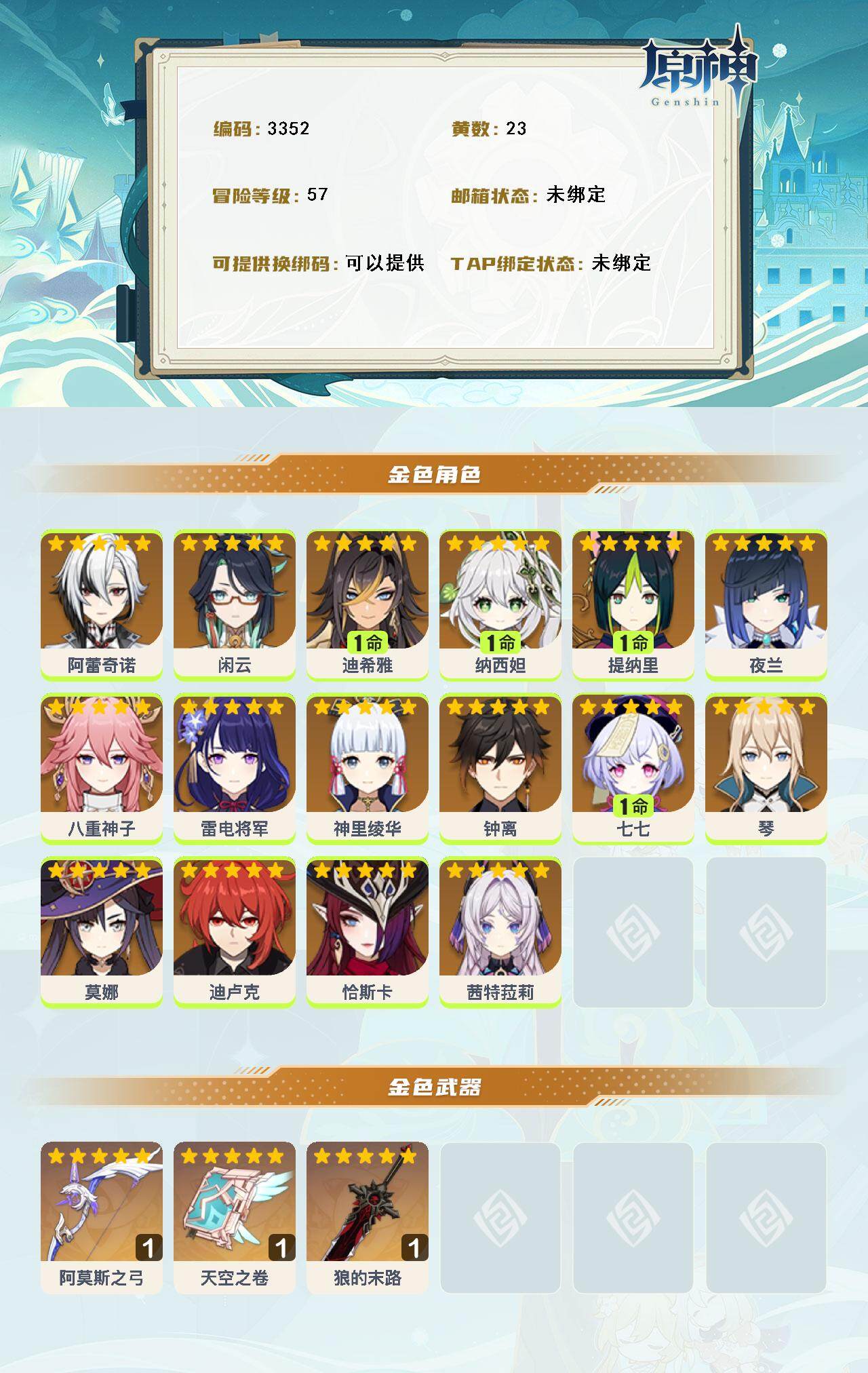 57级/23黄/女主/16个五星角色/3个五星武器 0命阿蕾奇诺0命闲云1命迪希雅1命纳西妲1命提纳里0命夜兰0命八重神子0命雷电将军0命神里绫华0命钟离1命七七0命琴0命莫娜0命迪卢克0命恰斯卡0命茜特菈莉精1阿莫斯之弓精1天空之卷精1狼的末路