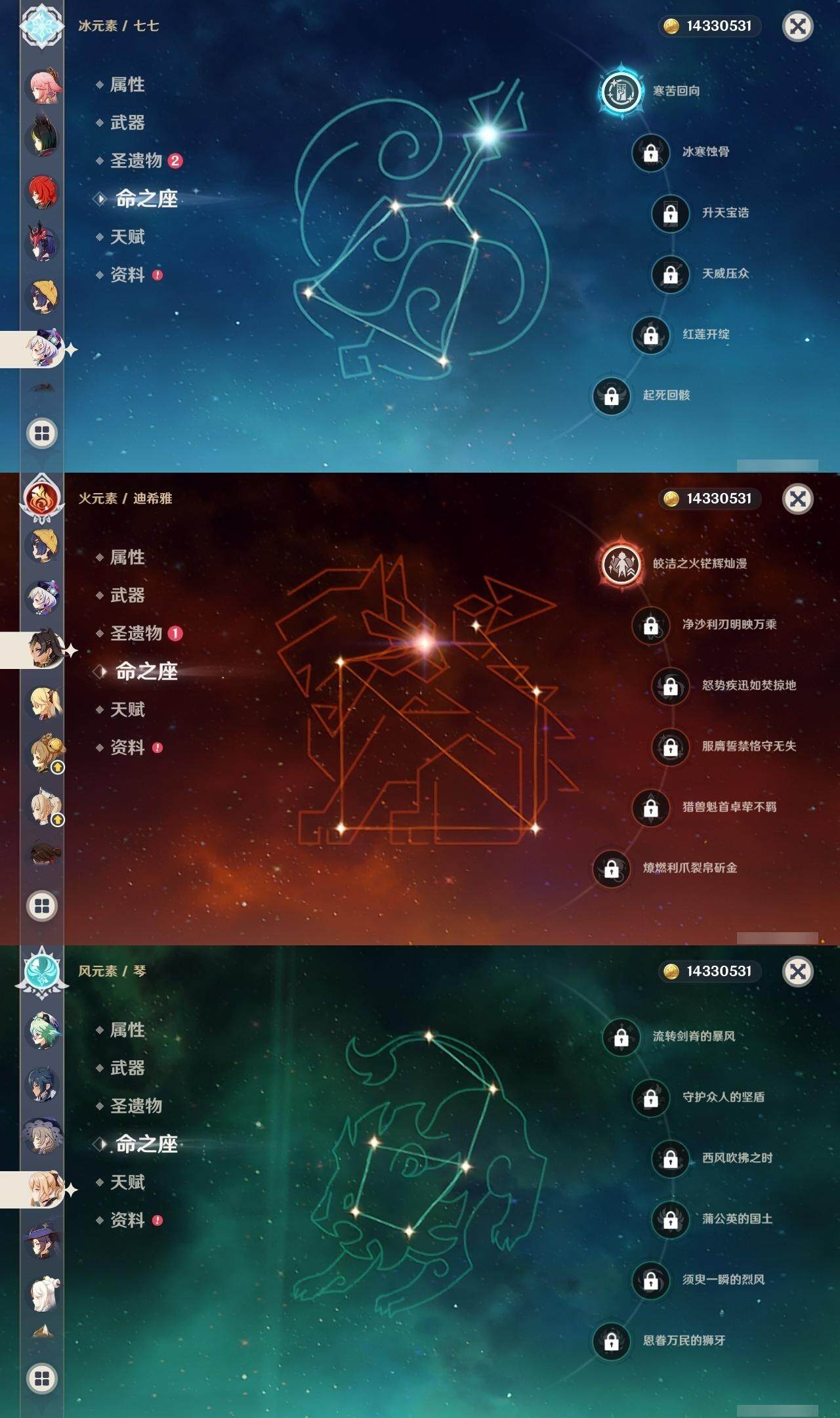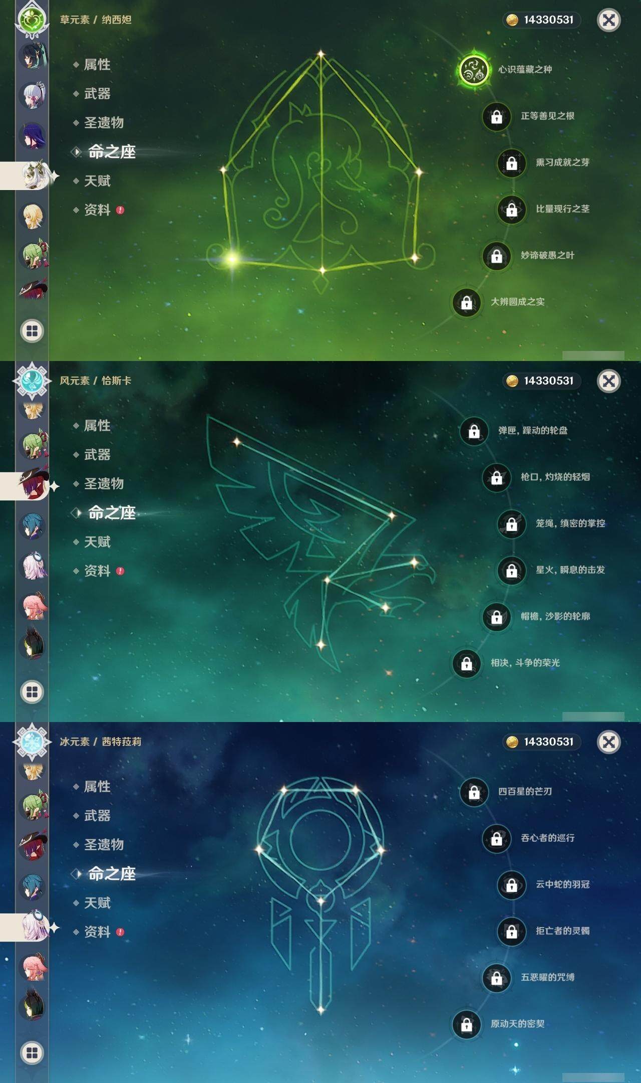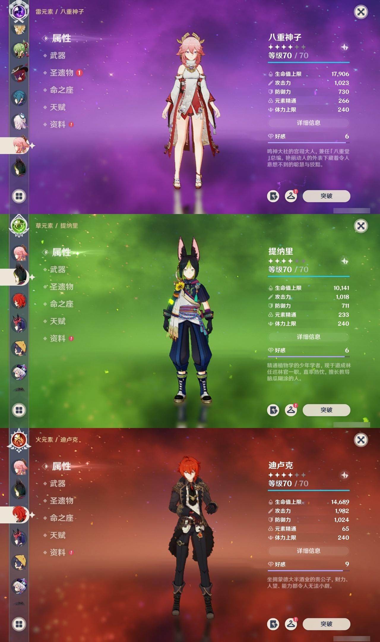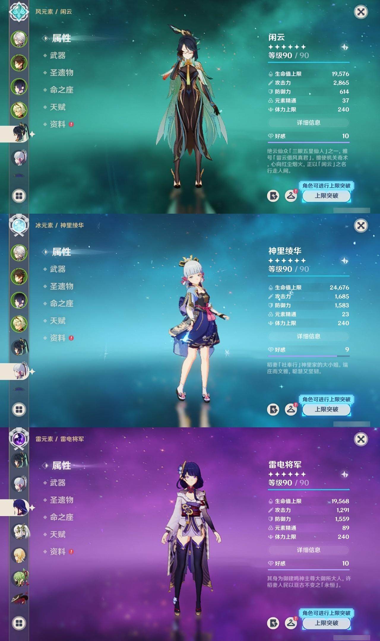 57级/23黄/女主/16个五星角色/3个五星武器 0命阿蕾奇诺0命闲云1命迪希雅1命纳西妲1命提纳里0命夜兰0命八重神子0命雷电将军0命神里绫华0命钟离1命七七0命琴0命莫娜0命迪卢克0命恰斯卡0命茜特菈莉精1阿莫斯之弓精1天空之卷精1狼的末路