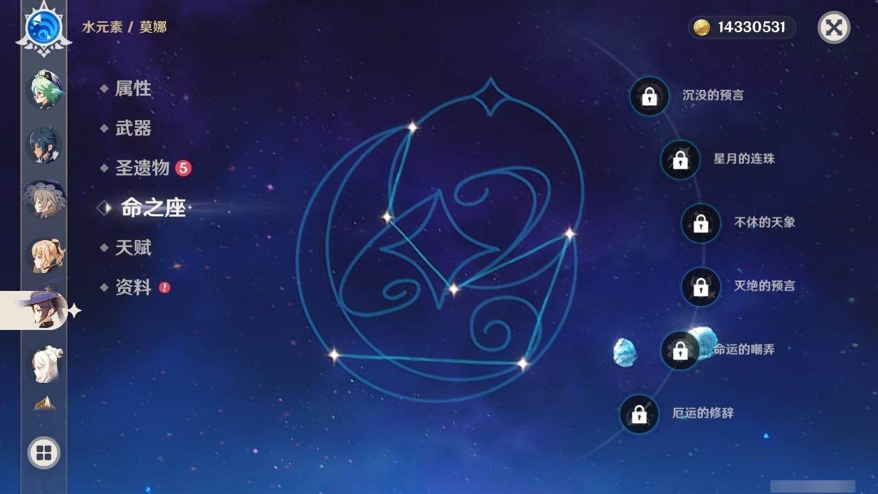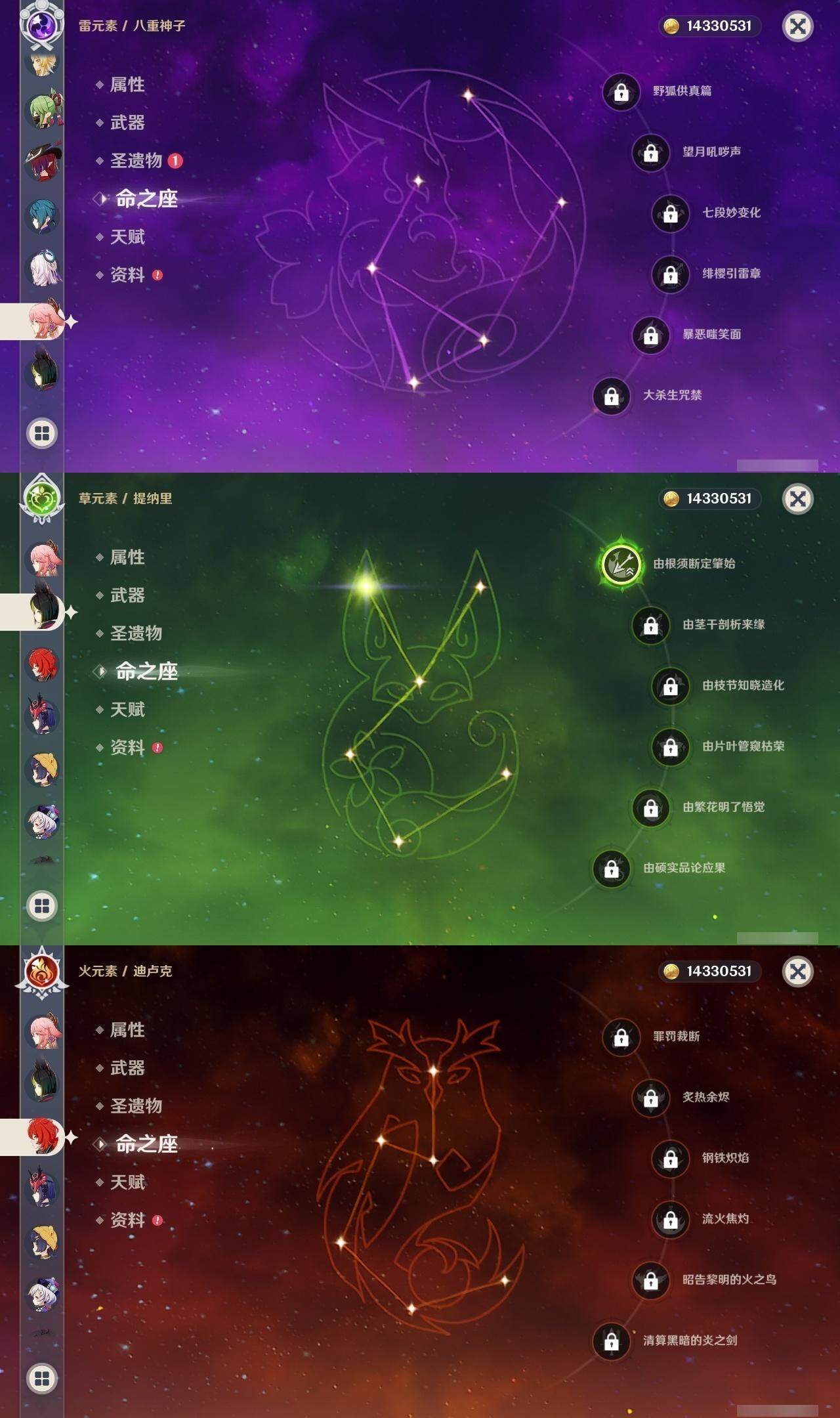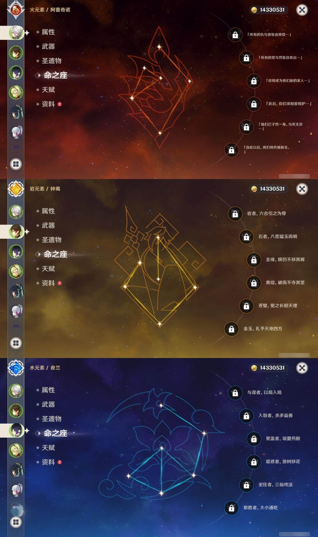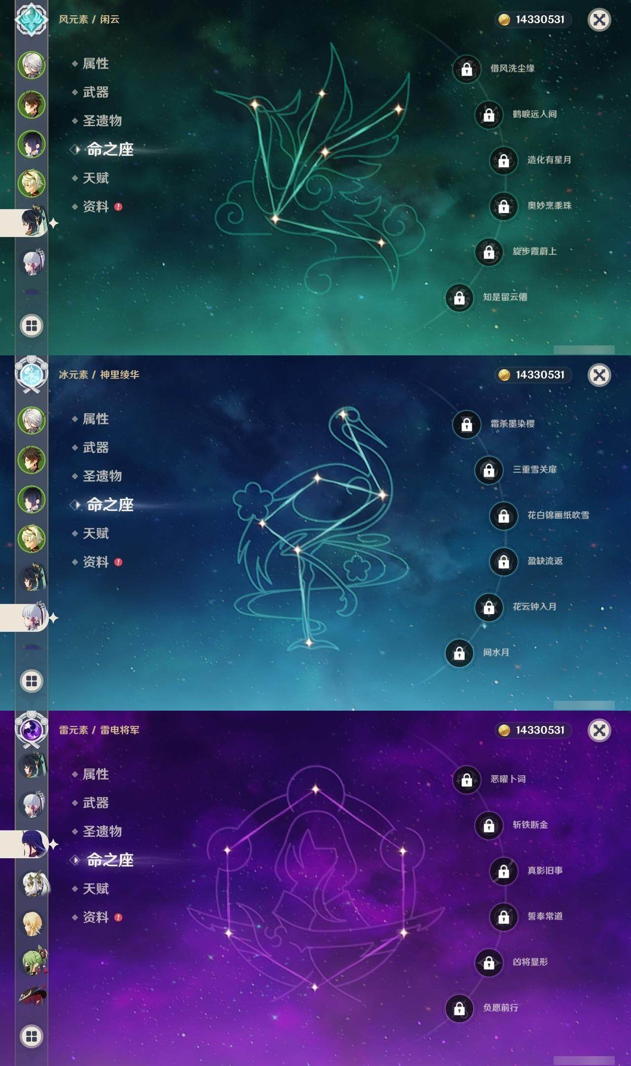 57级/23黄/女主/16个五星角色/3个五星武器 0命阿蕾奇诺0命闲云1命迪希雅1命纳西妲1命提纳里0命夜兰0命八重神子0命雷电将军0命神里绫华0命钟离1命七七0命琴0命莫娜0命迪卢克0命恰斯卡0命茜特菈莉精1阿莫斯之弓精1天空之卷精1狼的末路