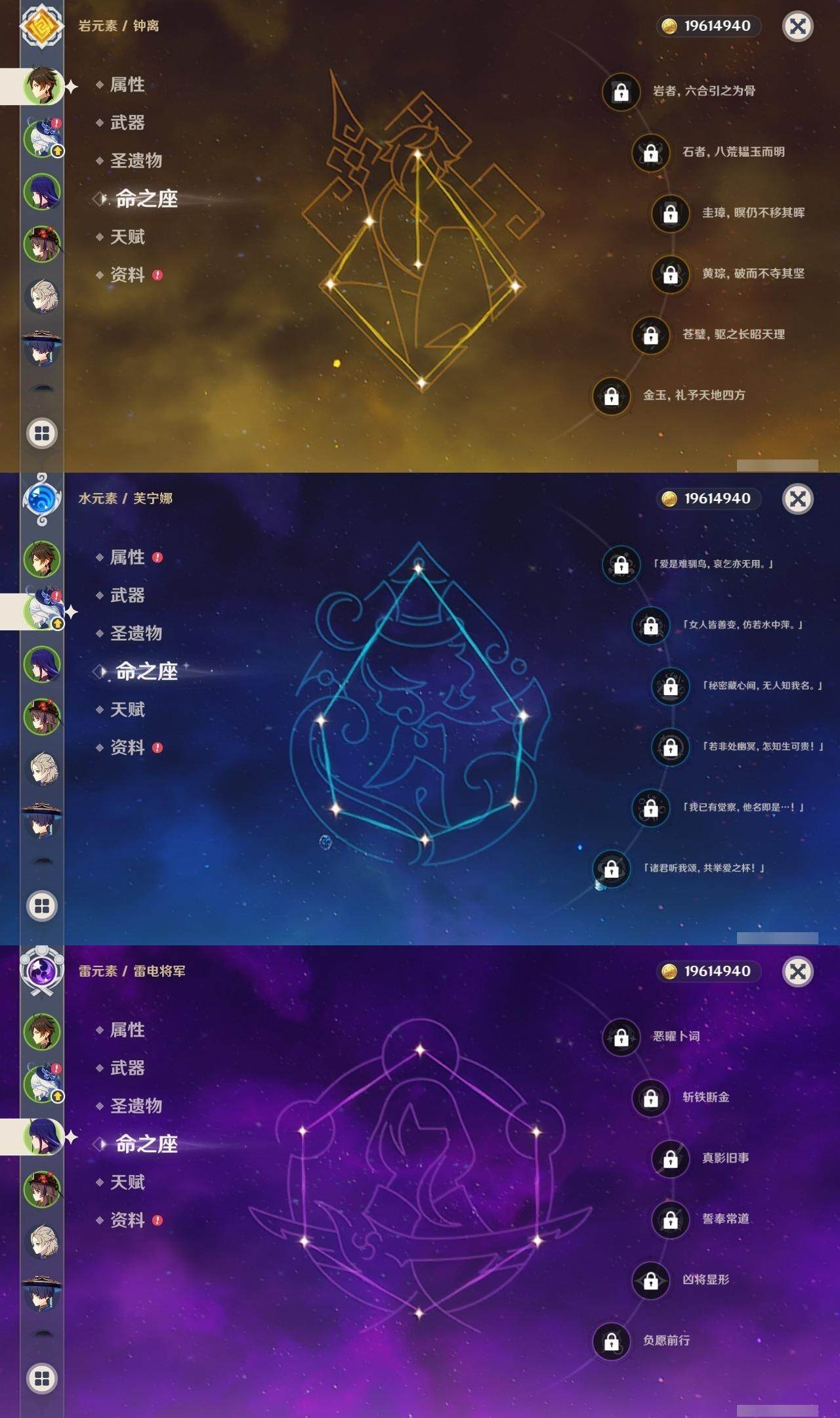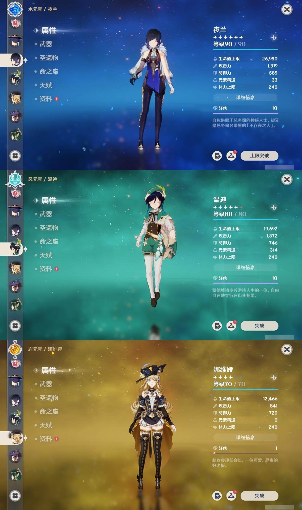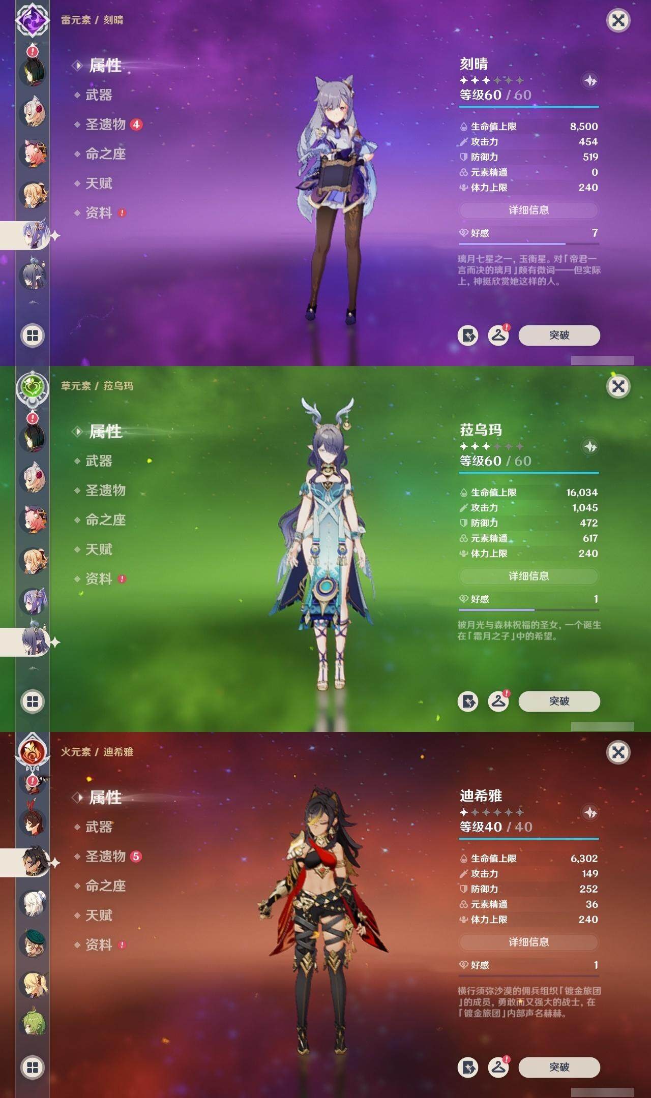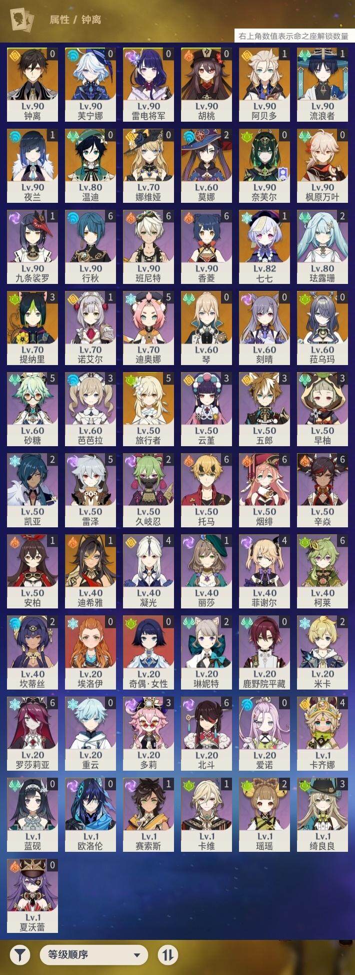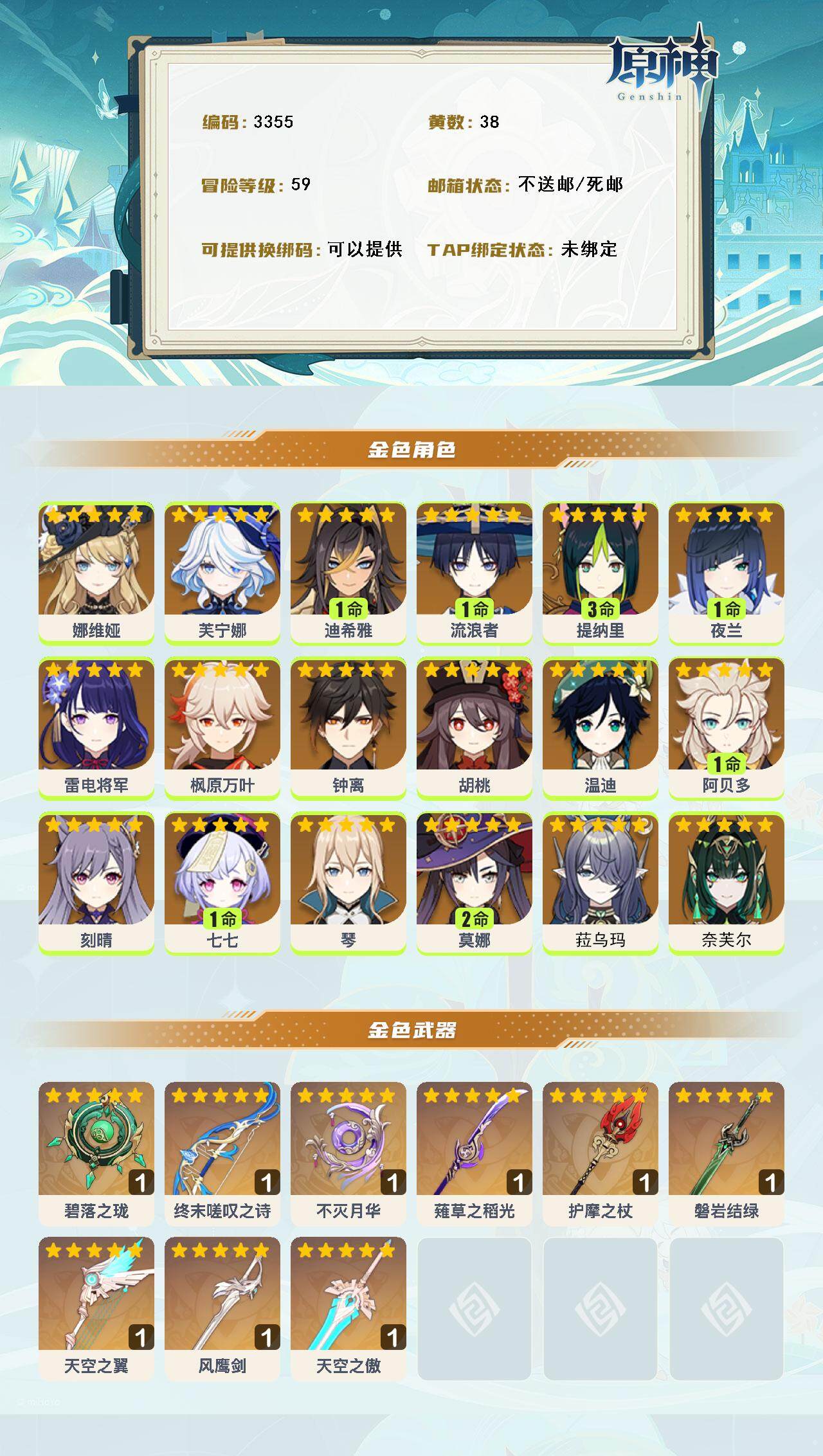 59级/38黄/女主/18个五星角色/10个五星武器 0命娜维娅0命芙宁娜1命迪希雅1命流浪者3命提纳里1命夜兰0命雷电将军0命枫原万叶0命钟离0命胡桃0命温迪1命阿贝多0命刻晴1命七七0命琴2命莫娜0命菈乌玛0命奈芙尔精1碧落之珑精1终末嗟叹之诗精1不灭月华精1薙草之稻光精1护摩之杖精1磐岩结绿精1天空之翼精1风鹰剑精1天空之傲