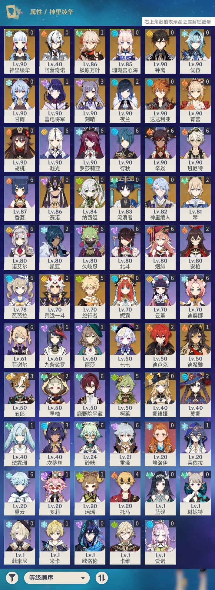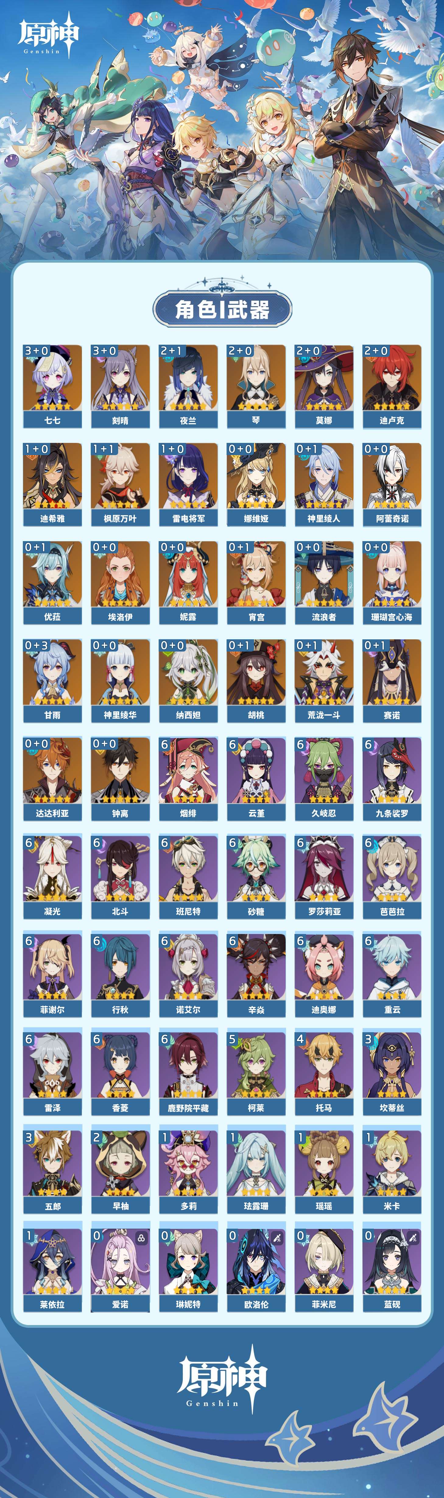 【原神】【lyys7835】冒险等级:59,五星数量:40,五星角色:刻晴 3命七七 3命迪卢克 2命莫娜 2命琴 2命夜兰 2命迪希雅 1命枫原万叶 1命雷电将军 1命珊瑚宫心海神里绫华宵宫优菈钟离荒泷一斗达达利亚神里绫人娜维娅赛诺阿蕾奇诺妮露纳西妲流浪者甘雨胡桃__五星武器:阿莫斯之弓 3精苍古自由之誓尘世之锁飞雷之弦振护摩之杖松籁响起之时天空之傲天空之卷天空之刃赤角石溃杵波乱月白经津若水猎人之径赤沙之杖__四星角色:班尼特 6命行秋 6命九条裟罗 6命香菱 6命久岐忍 6命鹿野院平藏 6命凝光 6命迪奥娜 6命砂糖 6命芭芭拉 6命云堇 6命烟绯 6命重云 6命辛焱 6命诺艾尔 6命罗莎莉亚 6命雷泽 6命菲谢尔 6命北斗 6命柯莱 5命托马 4命坎蒂丝 3命五郎 3命早柚 2命珐露珊 1命瑶瑶 1命莱依拉 1命米卡 1命多莉 1命埃洛伊卡维欧洛伦蓝砚菲米尼琳妮特爱诺