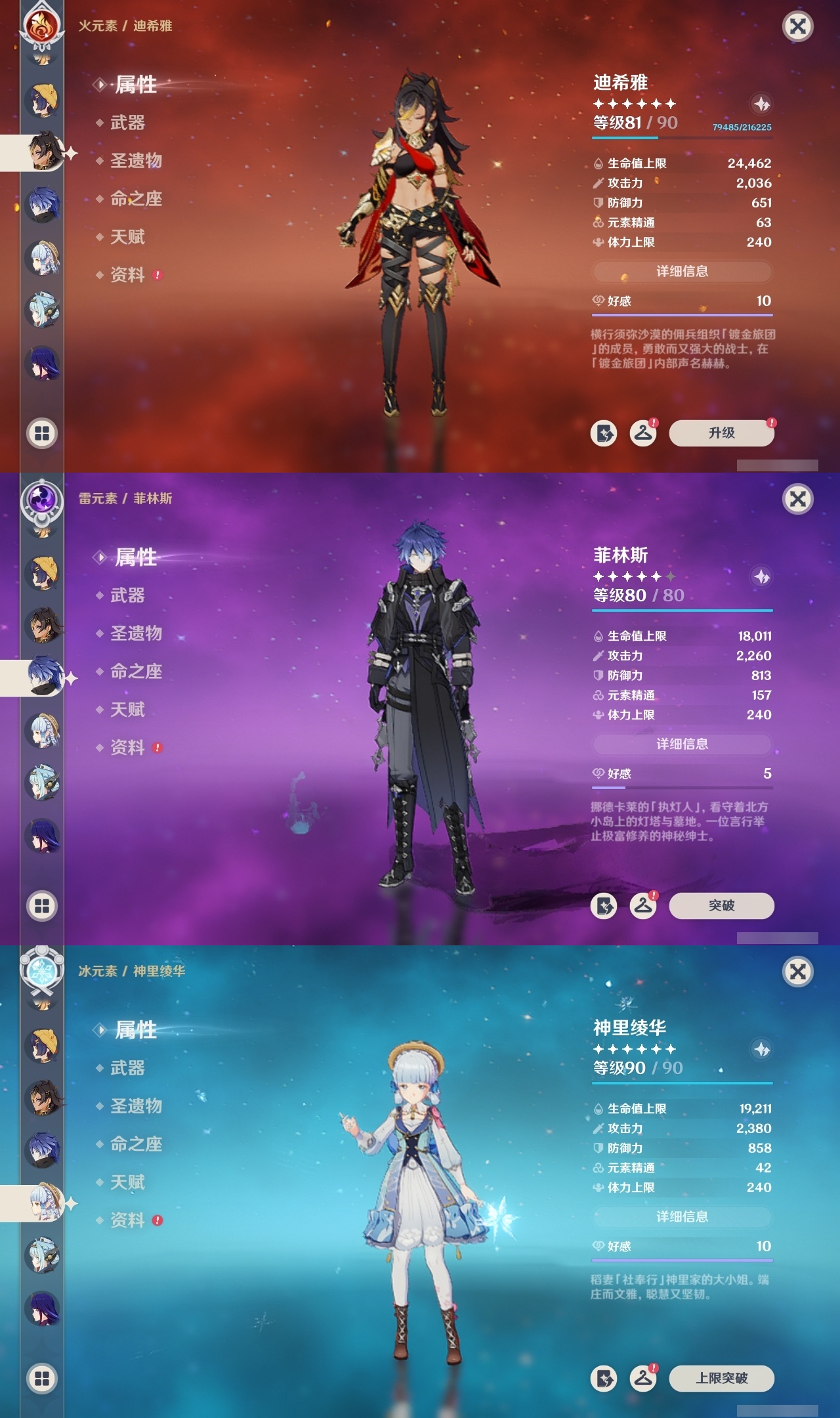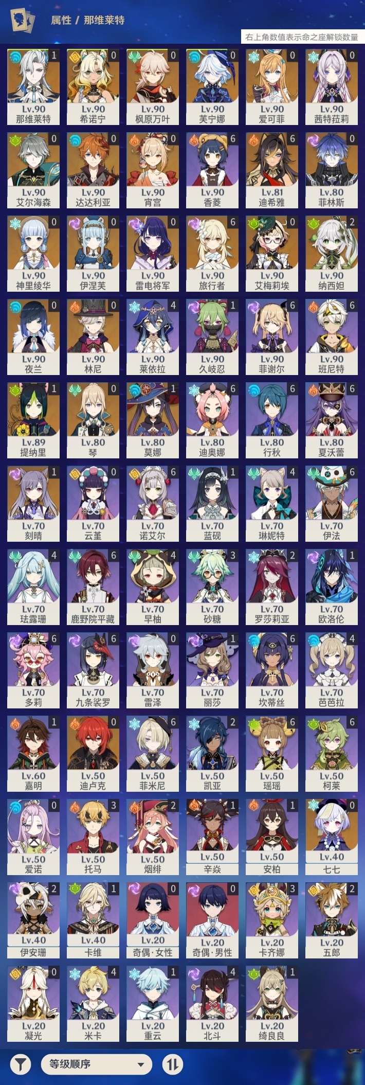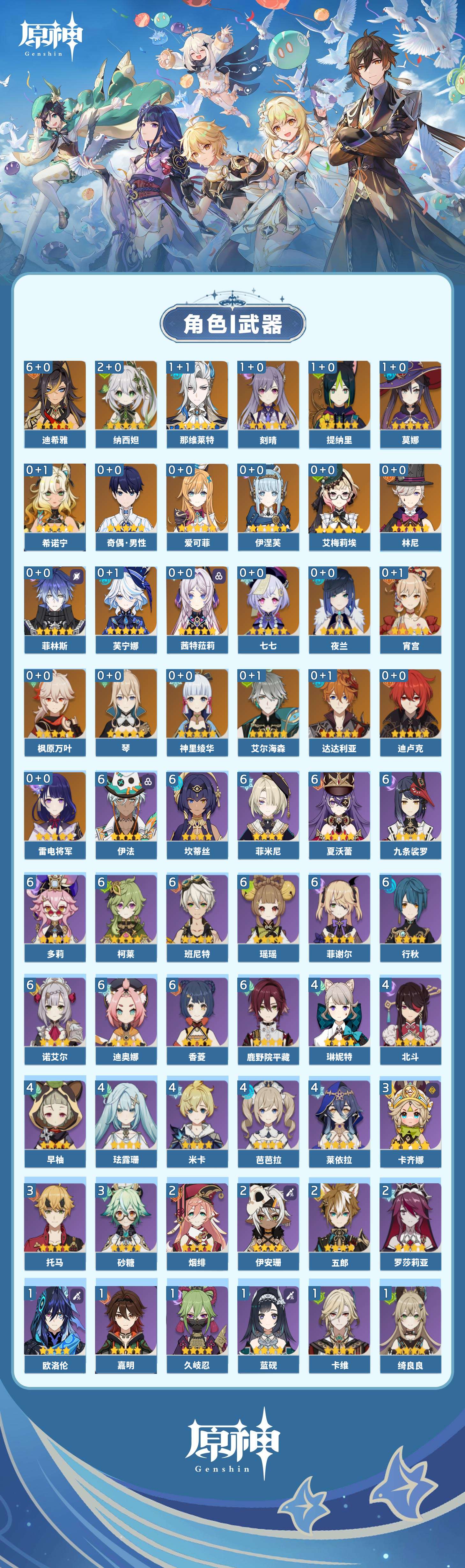 【原神】【lyys8115】冒险等级:60,五星数量:37,五星角色:迪希雅 6命纳西妲 2命那维莱特 1命刻晴 1命莫娜 1命提纳里 1命七七艾梅莉埃琴希诺宁神里绫华茜特菈莉宵宫达达利亚林尼夜兰芙宁娜爱可菲伊涅芙菲林斯艾尔海森迪卢克枫原万叶雷电将军__五星武器:阿莫斯之弓 2精风鹰剑 2精岩峰巡歌万世流涌大典静水流涌之辉裁叶萃光飞雷之弦振和璞鸢四风原典天空之卷冬极白星__四星角色:班尼特 6命行秋 6命九条裟罗 6命香菱 6命鹿野院平藏 6命迪奥娜 6命瑶瑶 6命坎蒂丝 6命多莉 6命柯莱 6命诺艾尔 6命菲谢尔 6命菲米尼 6命夏沃蕾 6命伊法 6命珐露珊 4命莱依拉 4命米卡 4命芭芭拉 4命早柚 4命北斗 4命琳妮特 4命卡齐娜 3命砂糖 3命托马 3命五郎 2命烟绯 2命罗莎莉亚 2命伊安珊 2命久岐忍 1命绮良良 1命卡维 1命欧洛伦 1命蓝砚 1命重云 1命辛焱 1命嘉明 1命奇偶·女性奇偶·男性凝光云堇雷泽爱诺