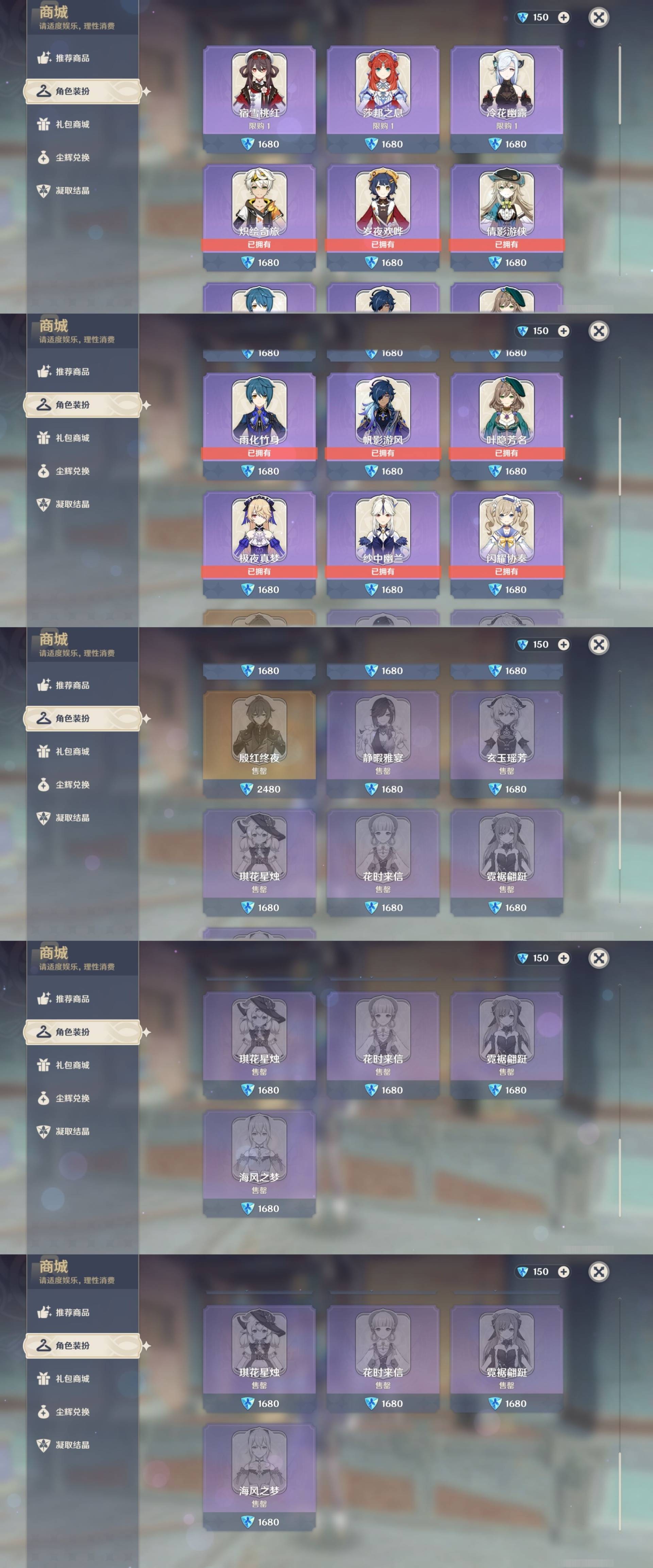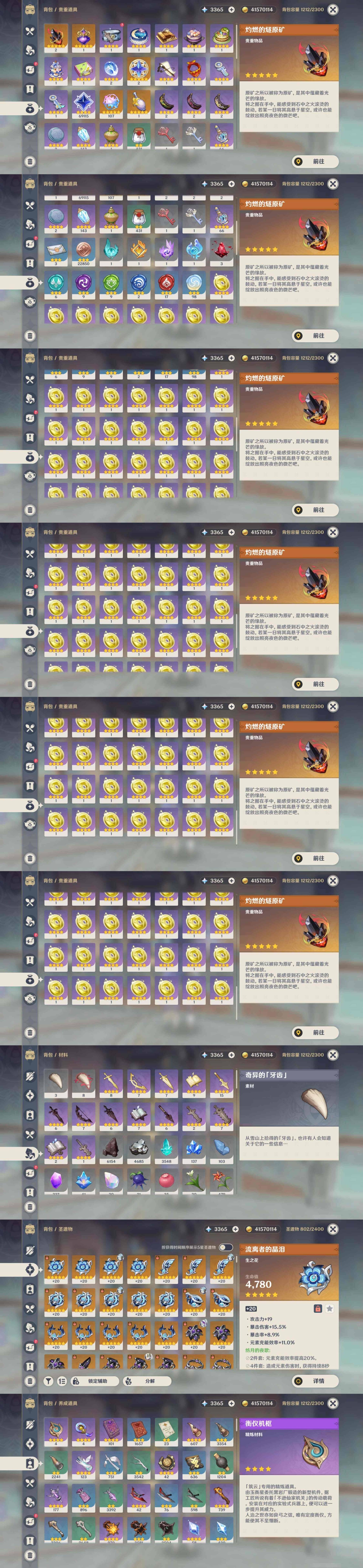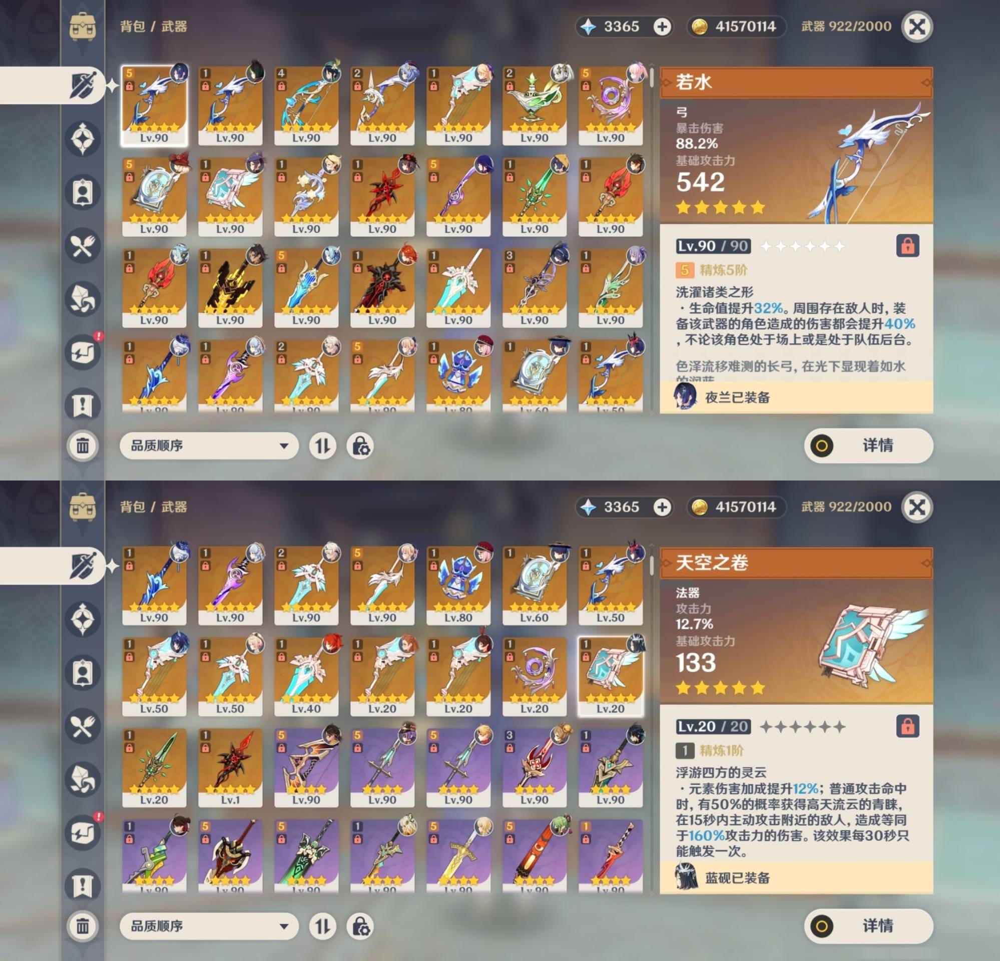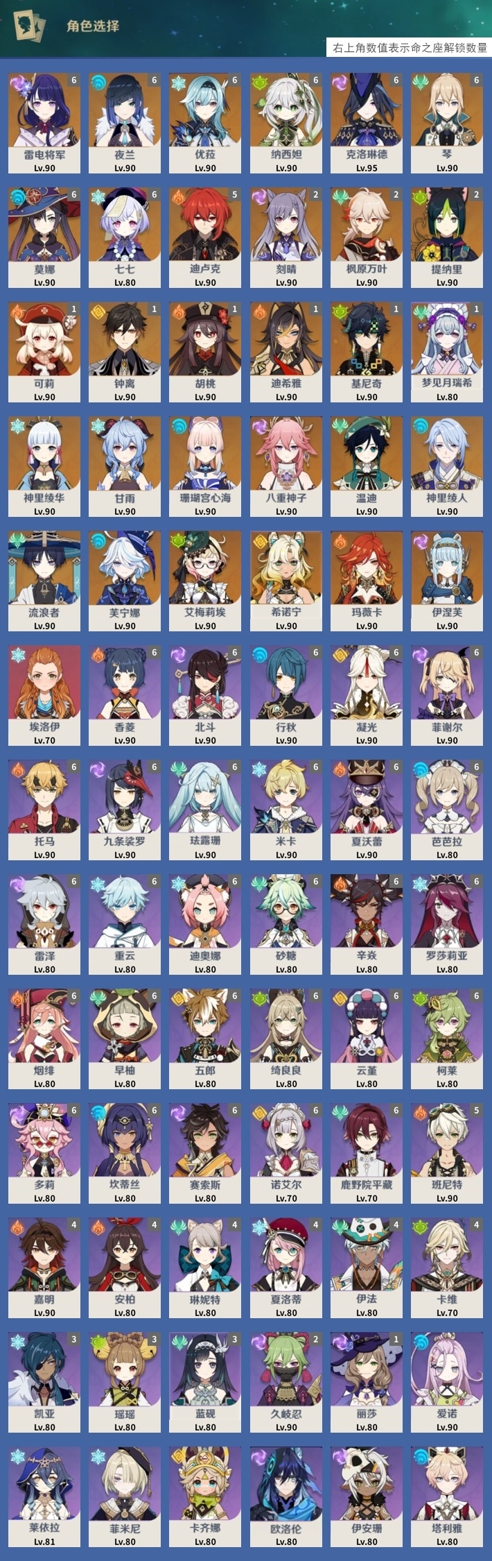[13907975]165黄 风:1命梦见月瑞希,0命流浪者,2命枫原万叶,0命温迪,6命琴 火:0命玛薇卡,1命迪希雅,1命胡桃,1命可莉,5命迪卢克 水:0命芙宁娜,6命夜兰,0命神里绫人,0命珊瑚宫心海,6命莫娜 冰:6命优菈,0命甘雨,0命神里绫华,6命七七,0命埃洛伊 岩:0命希诺宁,1命钟离 雷:6命克洛琳德,0命伊涅芙,6命雷电将军,0命八重神子,2命刻晴 草:6命纳西妲,1命基尼奇,0命艾梅莉埃,2命提纳里 弓:精5若水,精1若水,精1若水,精4终末嗟叹之诗,精2阿莫斯之弓,精1天空之翼,精1天空之翼,精1天空之翼,精1天空之翼 法器:精2千夜浮梦,精5不灭月华,精1不灭月华,精5四风原典,精1四风原典,精1天空之卷,精1天空之卷,精1祭星者之望 单手剑:精3赦罪,精1裁叶萃光,精1波乱月白经津,精1雾切之回光,精2天空之刃,精1天空之刃,精5风鹰剑 双手剑:精1无工之剑,精5松籁响起之时,精1狼的末路,精1天空之傲,精1天空之傲 长柄武器:精1柔灯挽歌,精1赤月之形,精1赤月之形,精5薙草之稻光,精1和璞鸢,精1和璞鸢,精1护摩之杖,精1护摩之杖 【角色皮肤】 五星角色:迪卢克-殷红终夜,夜兰-静暇雅宴,甘雨-玄玉瑶芳,可莉-琪花星烛,神里绫华-花时来信,刻晴-霓裾翩跹,琴-海风之梦 四星角色:班尼特-炽绘奇旅,香菱-岁夜欢哗,绮良良-倩影游侠,行秋-雨化竹身,凯亚-帆影游风,丽莎-叶隐芳名,菲谢尔-极夜真梦,凝光-纱中幽兰,芭芭拉-闪耀协奏