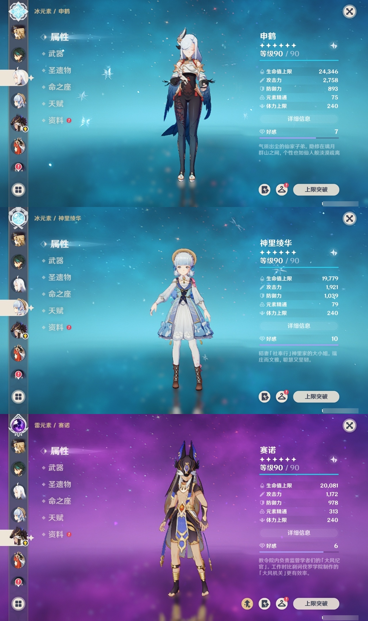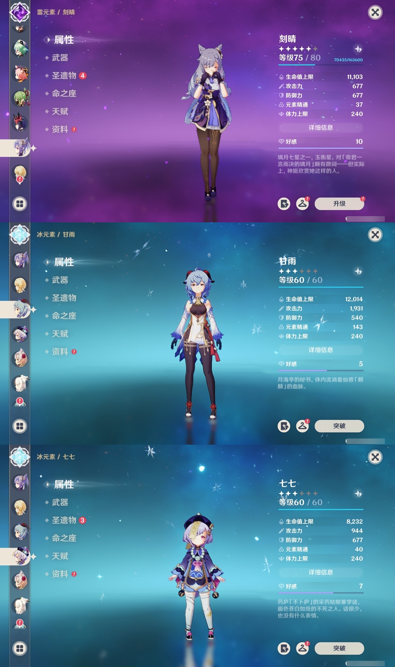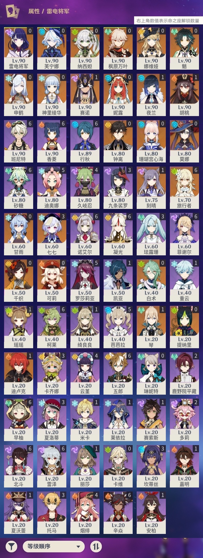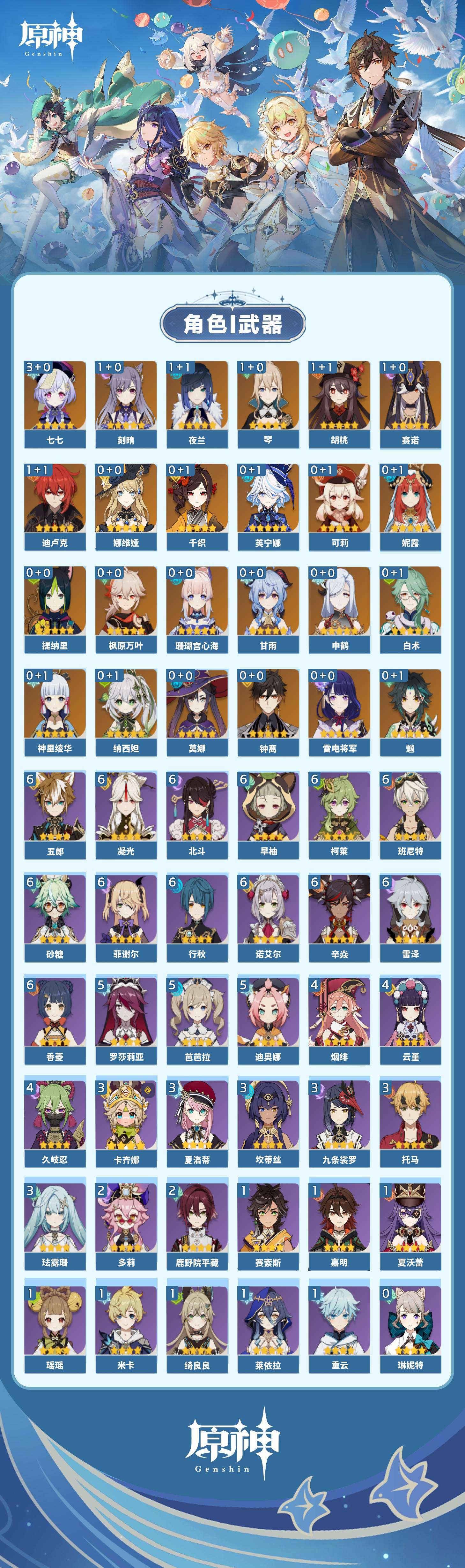 【原神】【lyys8123】冒险等级:59,五星数量:40,五星角色:七七 3命迪卢克 1命胡桃 1命刻晴 1命琴 1命夜兰 1命赛诺 1命莫娜珊瑚宫心海白术神里绫华钟离申鹤芙宁娜娜维娅提纳里千织妮露纳西妲枫原万叶甘雨魈可莉雷电将军__五星武器:碧落之珑静水流涌之辉有乐御簾切飞雷之弦振和璞鸢护摩之杖狼的末路四风原典天空之傲天空之脊天空之卷雾切之回光赤角石溃杵若水圣显之钥千夜浮梦__四星角色:班尼特 6命行秋 6命香菱 6命凝光 6命砂糖 6命柯莱 6命早柚 6命五郎 6命辛焱 6命诺艾尔 6命雷泽 6命菲谢尔 6命北斗 6命迪奥娜 5命芭芭拉 5命罗莎莉亚 5命久岐忍 4命云堇 4命烟绯 4命卡齐娜 3命九条裟罗 3命珐露珊 3命坎蒂丝 3命托马 3命夏洛蒂 3命鹿野院平藏 2命多莉 2命绮良良 1命瑶瑶 1命莱依拉 1命米卡 1命重云 1命夏沃蕾 1命嘉明 1命赛索斯 1命卡维琳妮特