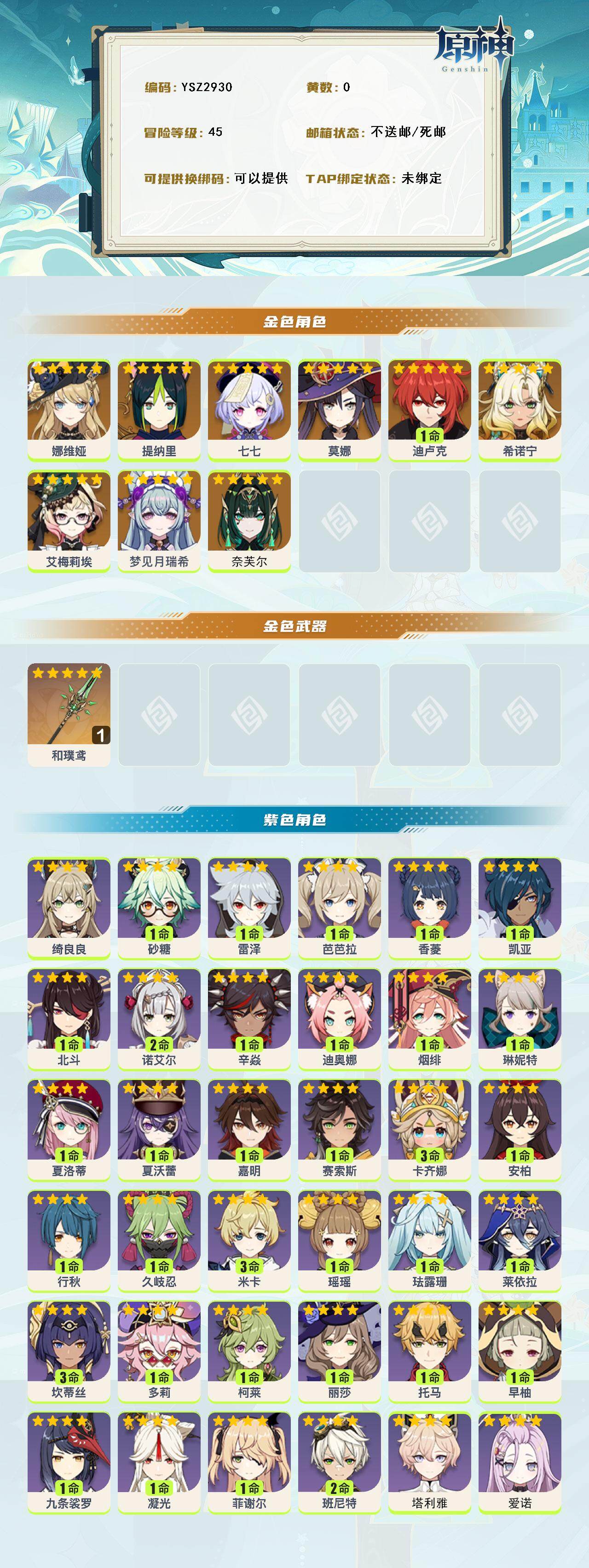 【ysz2930】45级/女主/11个五星角色/1个五星武器/0命奈芙尔/0命梦见月瑞希/0命希诺宁/0命艾梅莉埃/0命娜维娅/0命提纳里/1命迪卢克/0命莫娜/0命七七/精1和璞鸢/0命爱诺/0命塔利雅/3命卡齐娜/0命赛索斯/0命嘉明/0命夏沃蕾/0命夏洛蒂/0命琳妮特/0命绮良良/3命米卡/0命瑶瑶/0命珐露珊/1命莱依拉/3命坎蒂丝/0命多莉/0命柯莱/0命久岐忍/0命托马/1命九条裟罗/0命早柚/1命烟绯/0命辛焱/0命迪奥娜/1命砂糖/1命雷泽/0命菲谢尔/0命丽莎/0命北斗/1命香菱/0命安柏/2命班尼特/0命行秋/1命芭芭拉/0命凝光/2命诺艾尔/0命凯亚