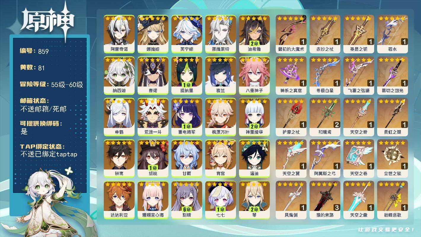 [13927196]60级/81黄/女主/35个五星角色/21个五星武器 0命阿蕾奇诺0命娜维娅0命芙宁娜0命那维莱特2命迪希雅0命纳西妲0命赛诺1命提纳里0命夜兰0命八重神子0命申鹤0命荒泷一斗1命雷电将军0命枫原万叶2命神里绫华0命钟离1命胡桃0命甘雨0命宵宫0命温迪0命达达利亚0命珊瑚宫心海满命刻晴1命七七2命琴1命莫娜5命迪卢克0命希诺宁0命玛拉妮0命恰斯卡0命茜特菈莉0命梦见月瑞希0命丝柯克0命伊涅芙0命菲林斯精1最初的大魔术精1赤沙之杖精1圣显之钥精1若水精1神乐之真意精1冬极白星精1飞雷之弦振精1雾切之回光精1护摩之杖精2和璞鸢精1天空之脊精1贯虹之槊精1天空之翼精1阿莫斯之弓精1天空之卷精1尘世之锁精1风鹰剑精3狼的末路精1天空之傲精1岩峰巡歌精1真语秘匣