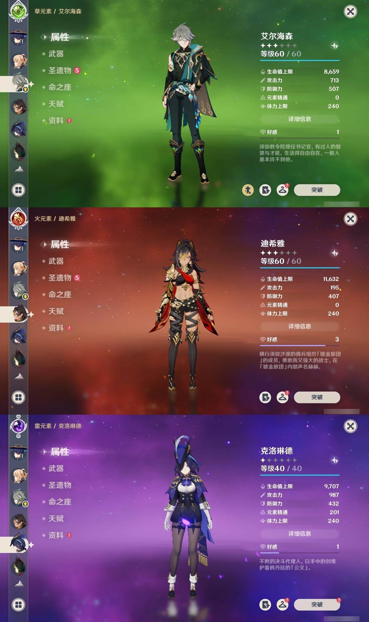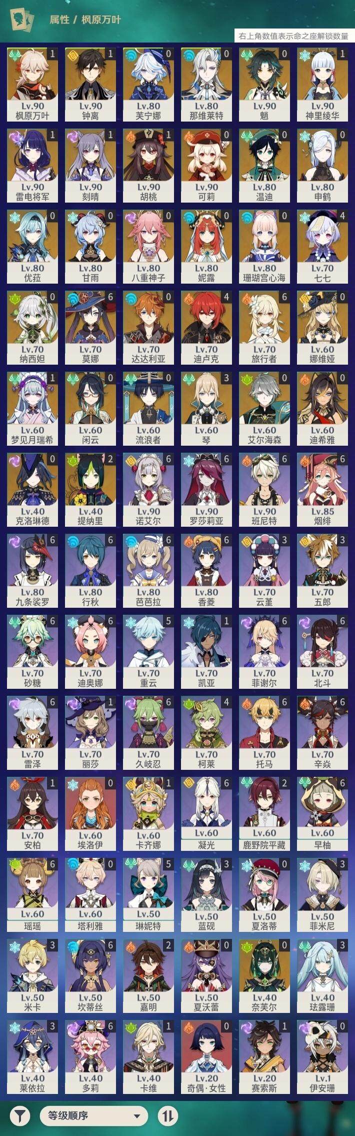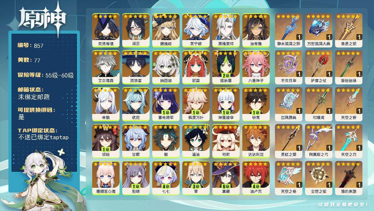 [13928709]60级/77黄/女主/32个五星角色/19个五星武器 0命克洛琳德0命闲云0命娜维娅0命芙宁娜0命那维莱特0命迪希雅0命艾尔海森0命流浪者0命纳西妲0命妮露2命提纳里0命八重神子0命申鹤0命优菈1命雷电将军1命枫原万叶1命神里绫华1命钟离1命胡桃0命甘雨0命魈0命温迪0命可莉0命达达利亚0命珊瑚宫心海1命刻晴4命七七3命琴满命莫娜4命迪卢克1命梦见月瑞希0命奈芙尔精1静水流涌之辉精1万世流涌大典精1圣显之钥精1不灭月华精1护摩之杖精1磐岩结绿精1四风原典精1和璞鸢精1天空之脊精1贯虹之槊精1阿莫斯之弓精1天空之刃精1天空之卷精1尘世之锁精1狼的末路