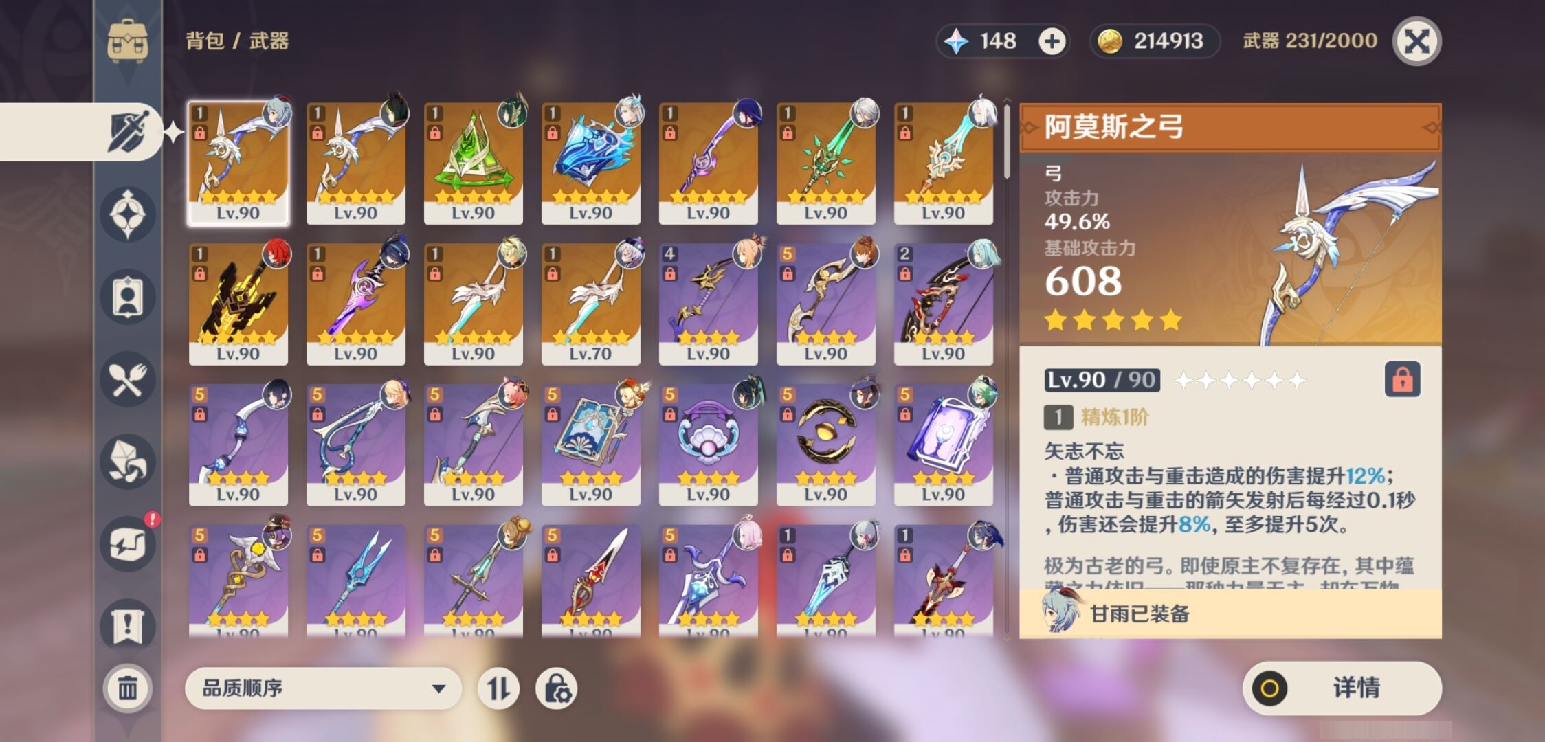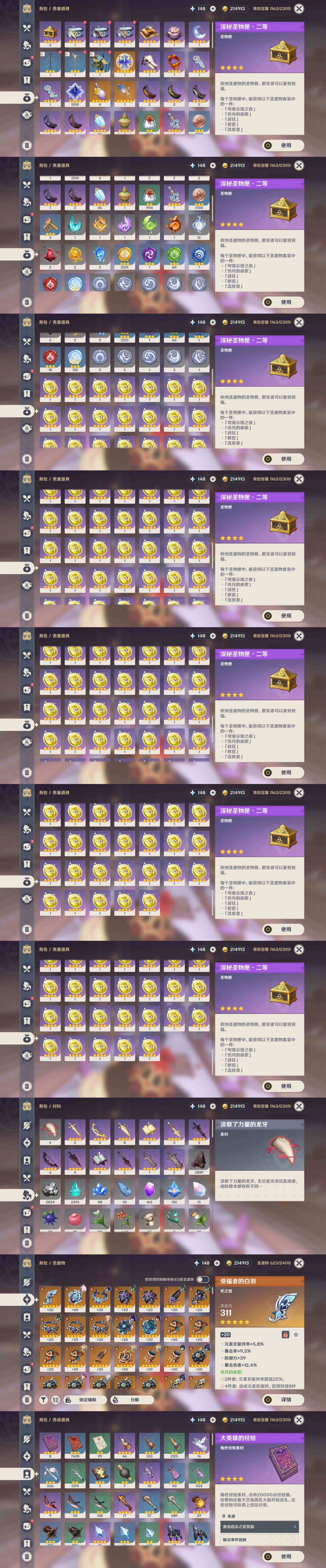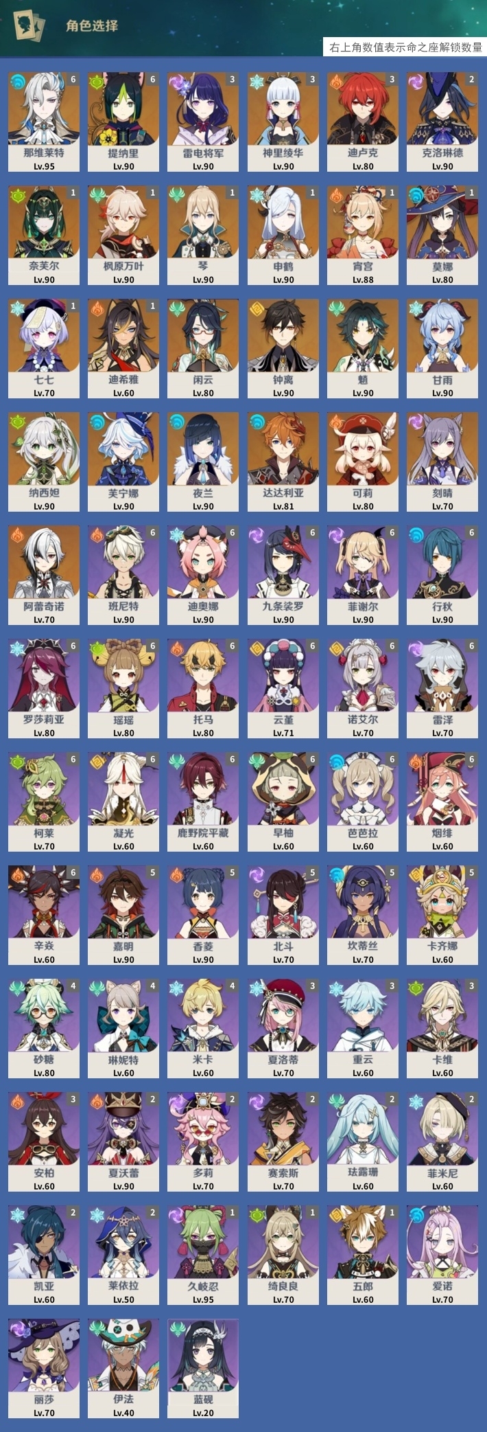 [13946922]67黄 风系:0命闲云/1命枫原万叶/0命魈/1命琴 火系:1命宵宫/0命可莉/3命迪卢克/0命阿蕾奇诺/1命迪希雅 水系:6命那维莱特/0命芙宁娜/0命夜兰/0命达达利亚/1命莫娜 冰系:1命申鹤/0命甘雨/3命神里绫华/1命七七 岩系:0命钟离 雷系:2命克洛琳德/0命刻晴/3命雷电将军 草系:1命奈芙尔/0命纳西妲/6命提纳里 [四星角色等级及命座] 风系: 4命砂糖/4命琳妮特/2命珐露珊/6命鹿野院平藏/6命早柚/0命伊法/0命蓝砚 火系: 5命嘉明/5命香菱/6命托马/6命烟绯/6命辛焱/3命安柏/6命班尼特/2命夏沃蕾 水系:0命爱诺/6命行秋/5命坎蒂丝/6命芭芭拉 冰系:6命迪奥娜/6命罗莎莉亚/3命夏洛蒂/2命菲米尼/4命米卡/3命重云/2命凯亚/2命莱依拉 岩系:6命云堇/6命诺艾尔/1命五郎/6命凝光 雷系:1命久岐忍/6命九条裟罗/6命菲谢尔/2命多莉/0命丽莎/2命赛索斯/5命北斗/6命雷泽 草系:6命瑶瑶/6命柯莱/1命绮良良/3命卡维 [角色经验书] 紫色8/蓝色7628/绿色29 [小物品] 脆弱树脂1/异梦溶媒26/嬗变之尘1914