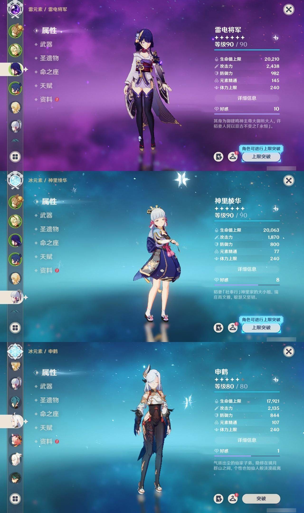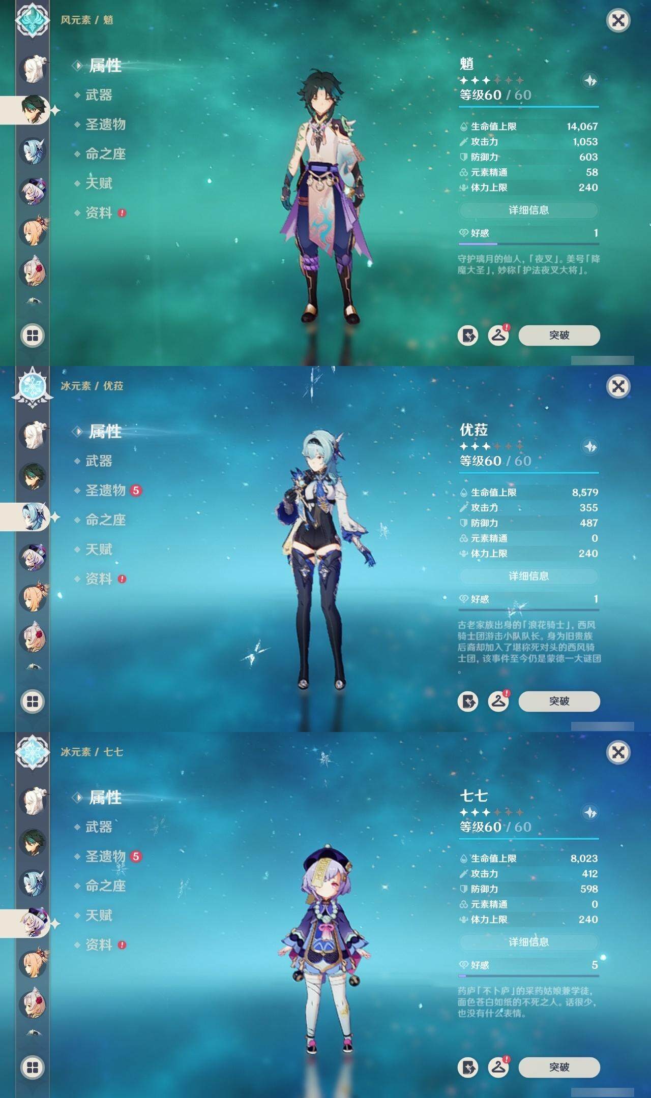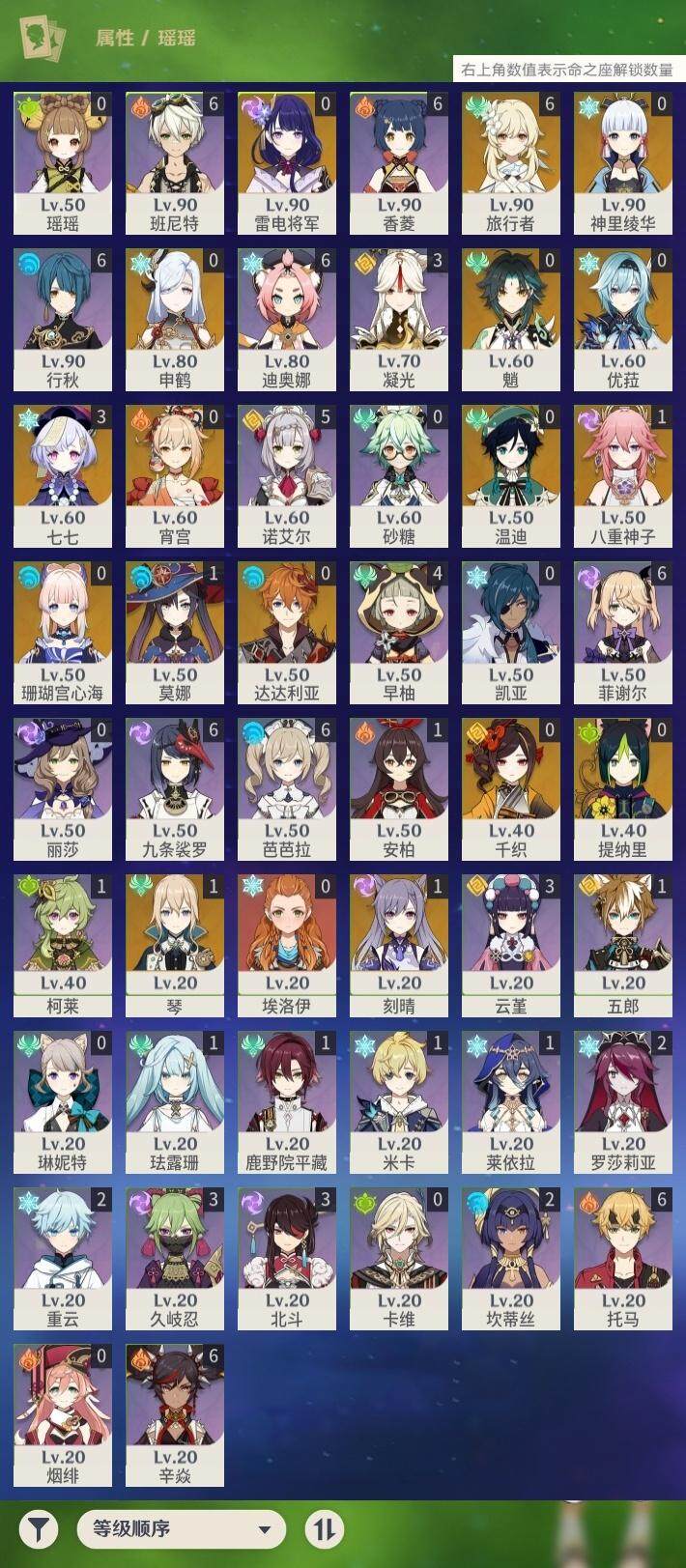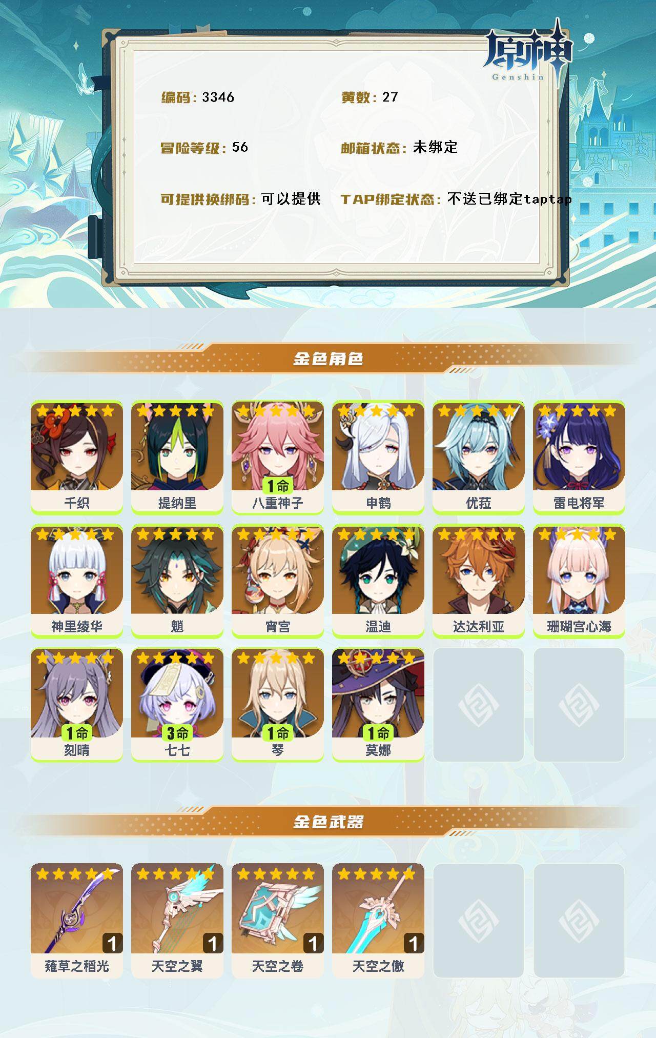 56级/27黄/女主/16个五星角色/4个五星武器 0命千织0命提纳里1命八重神子0命申鹤0命优菈0命雷电将军0命神里绫华0命魈0命宵宫0命温迪0命达达利亚0命珊瑚宫心海1命刻晴3命七七1命琴1命莫娜精1薙草之稻光精1天空之翼精1天空之卷精1天空之傲