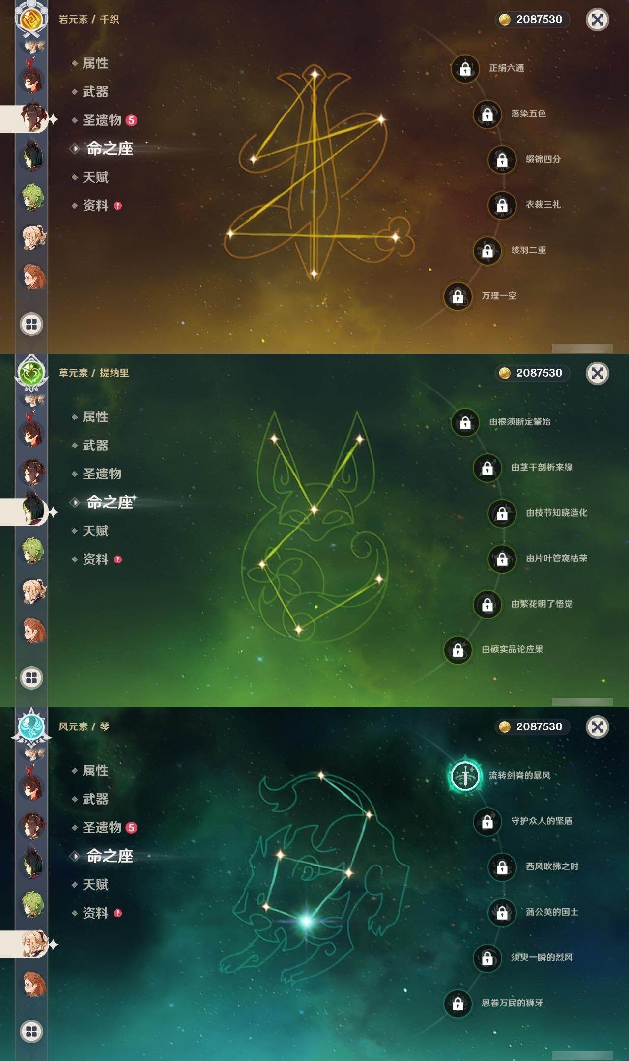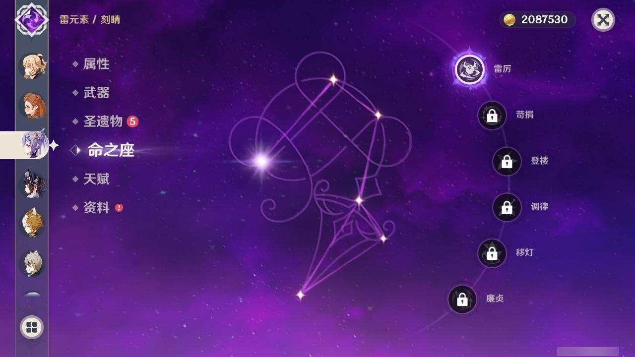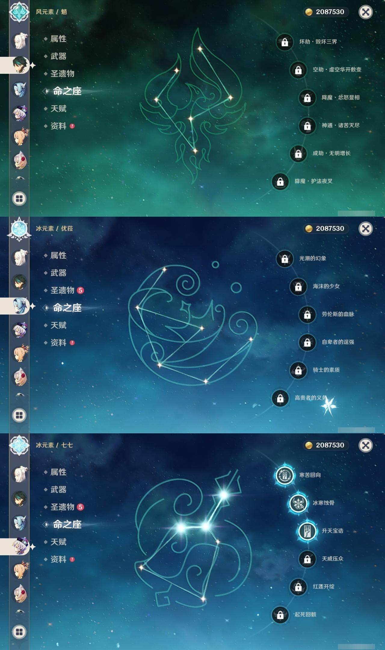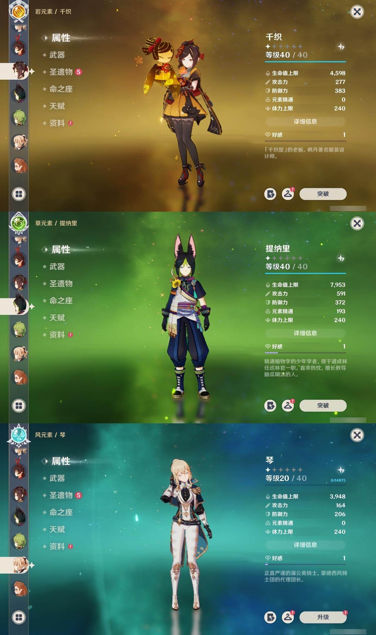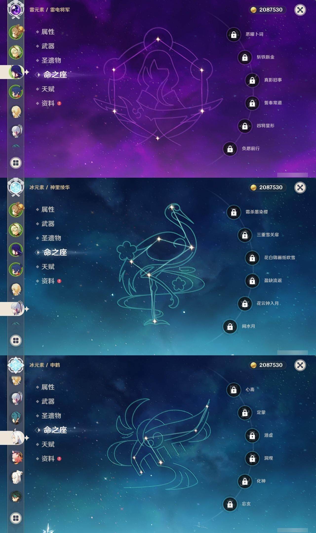 56级/27黄/女主/16个五星角色/4个五星武器 0命千织0命提纳里1命八重神子0命申鹤0命优菈0命雷电将军0命神里绫华0命魈0命宵宫0命温迪0命达达利亚0命珊瑚宫心海1命刻晴3命七七1命琴1命莫娜精1薙草之稻光精1天空之翼精1天空之卷精1天空之傲