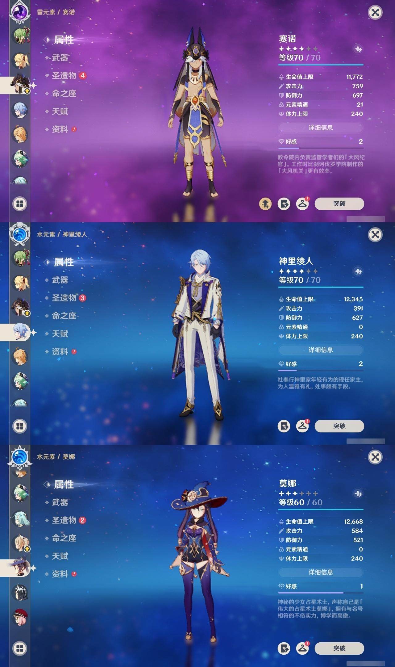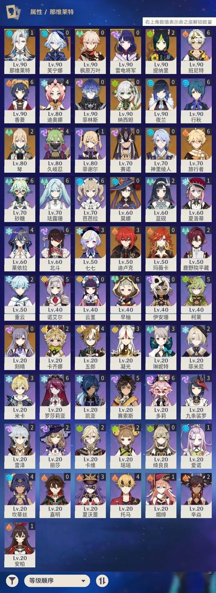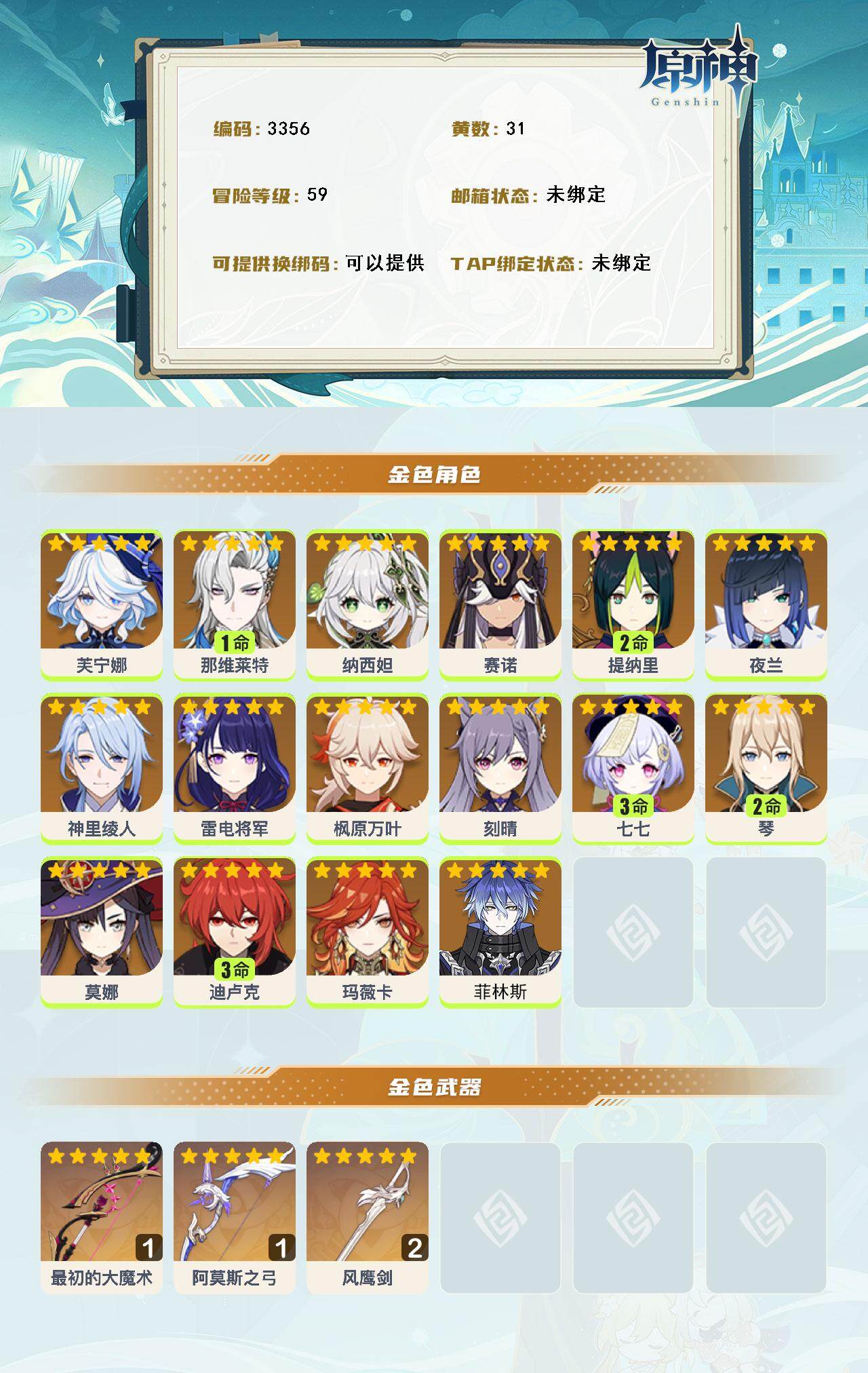 59级/31黄/男主/16个五星角色/3个五星武器 0命芙宁娜1命那维莱特0命纳西妲0命赛诺2命提纳里0命夜兰0命神里绫人0命雷电将军0命枫原万叶0命刻晴3命七七2命琴0命莫娜3命迪卢克0命玛薇卡0命菲林斯精1最初的大魔术精1阿莫斯之弓精2风鹰剑