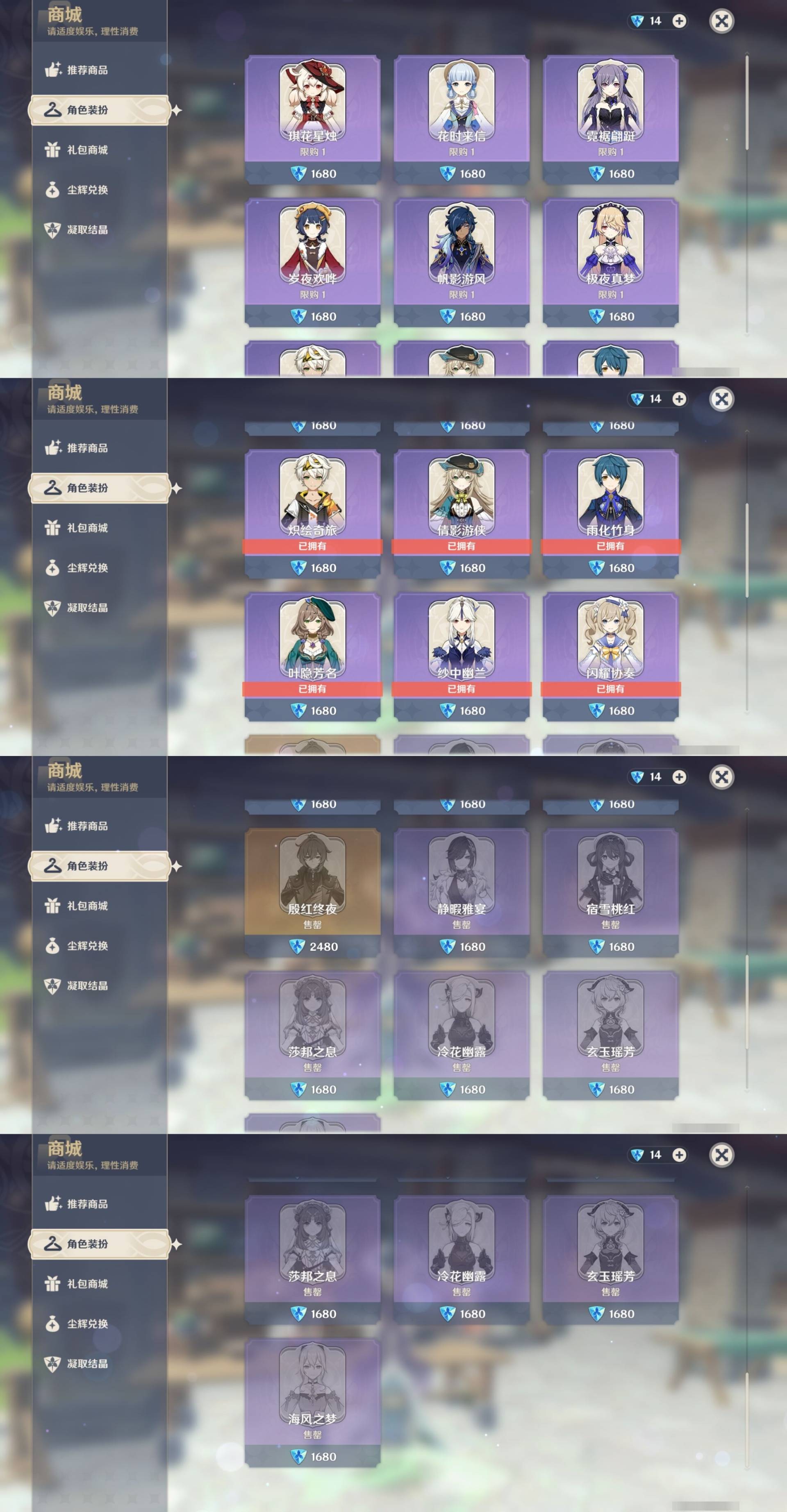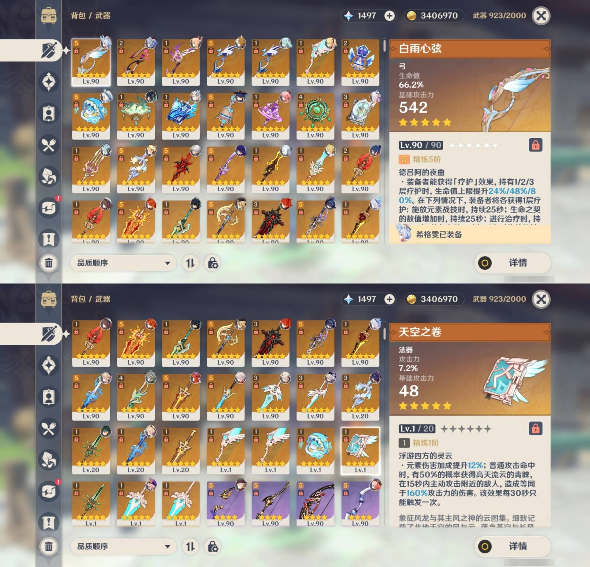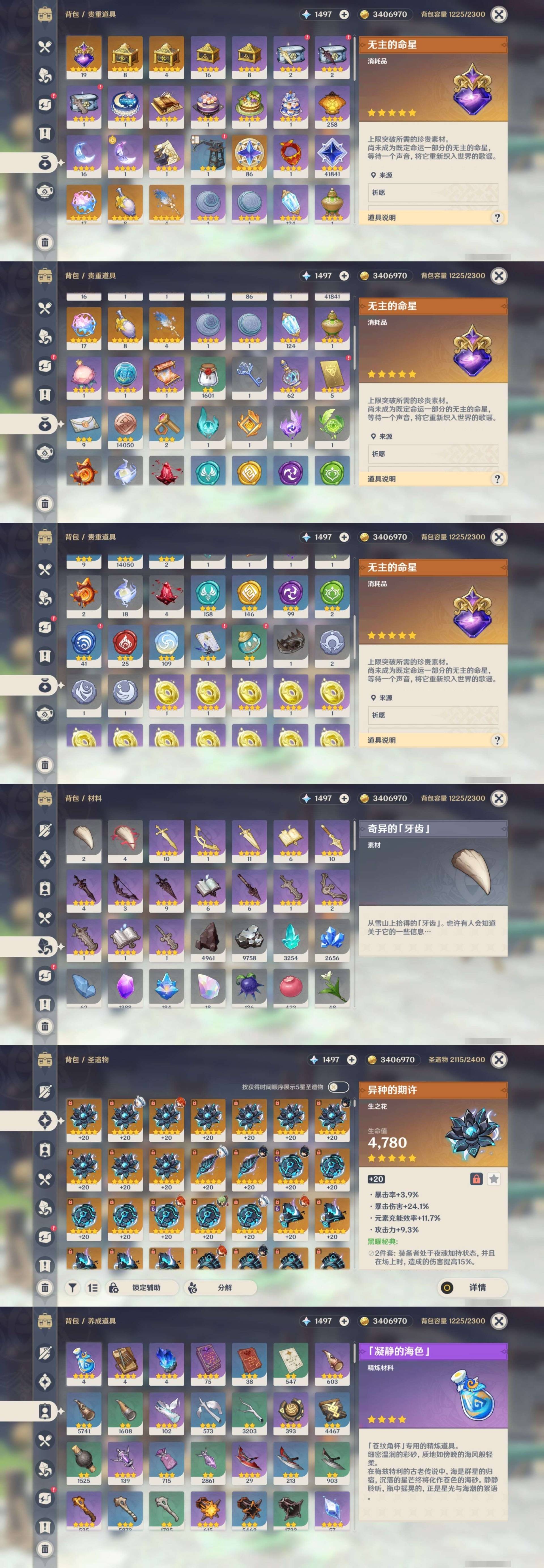 [13974794]310黄 风:2命闲云,6命流浪者,6命枫原万叶,0命魈,0命温迪,6命琴,0命梦见月瑞希 火:6命玛薇卡,6命阿蕾奇诺,0命宵宫,1命胡桃,6命迪卢克,0命林尼,0命可莉,6命迪希雅 水:6命妮露,6命芙宁娜,6命那维莱特,6命玛拉妮,6命希格雯,6命夜兰,6命莫娜 冰:0命丝柯克,0命爱可菲,6命茜特菈莉,0命申鹤,2命甘雨,6命七七,0命埃洛伊 岩:0命希诺宁,6命娜维娅,0命荒泷一斗,0命阿贝多,0命钟离 雷:6命克洛琳德,0命伊涅芙,1命八重神子,6命雷电将军,6命刻晴 草:0命菈乌玛,2命基尼奇,6命艾梅莉埃,6命白术,2命纳西妲,6命提纳里,0命艾尔海森 弓:精5白雨心弦,精2最初的大魔术,精1飞雷之弦振,精5若水,精1若水,精1天空之翼,精1天空之翼,精1天空之翼 法器:精2祭星者之望,精5冲浪时光,精1冲浪时光,精1鹤鸣余音,精1万世流涌大典,精5图莱杜拉的回忆,精1神乐之真意,精4碧落之珑,精3四风原典,精1天空之卷 单手剑:精5赦罪,精1有乐御簾切,精5静水流涌之辉,精1静水流涌之辉,精4裁叶萃光,精5圣显之钥,精1圣显之钥,精5苍古自由之誓,精3天空之刃,精3风鹰剑 双手剑:精5焚曜千阳,精1山王长牙,精5裁断,精3狼的末路,精1天空之傲,精1天空之傲 长柄武器:精1香韵奏者,精5柔灯挽歌,精3柔灯挽歌,精5赤月之形,精5薙草之稻光,精1贯虹之槊,精1天空之脊,精2护摩之杖,精1护摩之杖,精1和璞鸢,精1和璞鸢 【角色皮肤】 五星角色:迪卢克-殷红终夜,夜兰-静暇雅宴,胡桃-宿雪桃红,妮露-莎邦之息,申鹤-冷花幽露,甘雨-玄玉瑶芳,琴-海风之梦 四星角色:班尼特-炽绘奇旅,绮良良-倩影游侠,行秋-雨化竹身,丽莎-叶隐芳名,凝光-纱中幽兰,芭芭拉-闪耀协奏