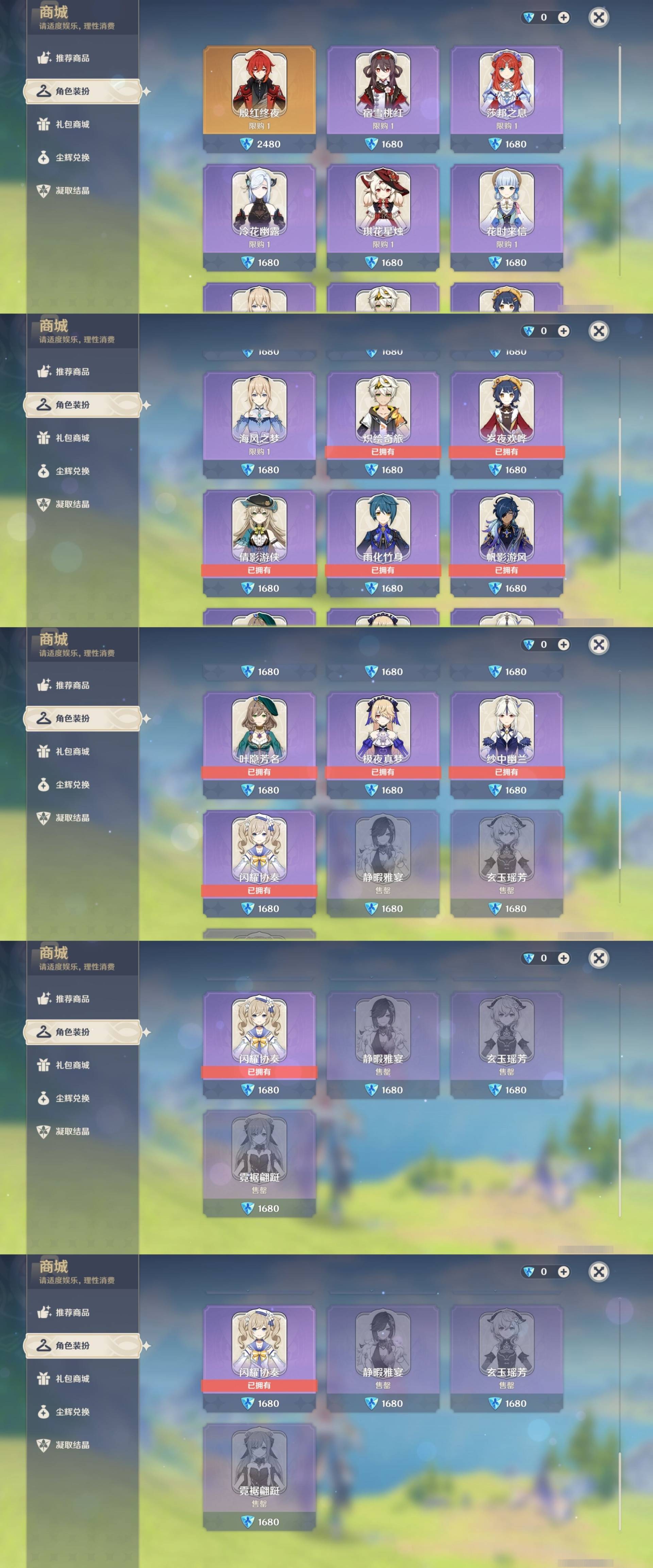 [13974937]179黄 风:0命闲云,2命枫原万叶,5命琴 火:0命玛薇卡,1命阿蕾奇诺,0命宵宫,3命胡桃,6命迪卢克,4命迪希雅 水:6命玛拉妮,6命芙宁娜,0命妮露,6命夜兰,6命莫娜,1命达达利亚 冰:2命茜特菈莉,0命丝柯克,0命优菈,1命甘雨,6命七七,0命埃洛伊 岩:3命希诺宁,0命娜维娅,0命荒泷一斗,0命阿贝多,6命钟离 雷:0命克洛琳德,6命八重神子,6命雷电将军,6命刻晴 草:0命艾尔海森,3命纳西妲,1命提纳里 弓:精2飞雷之弦振,精1若水,精1冬极白星,精1阿莫斯之弓,精1天空之翼,精1天空之翼,精1天空之翼,精1星鹫赤羽 法器:精1祭星者之望,精2冲浪时光,精1鹤鸣余音,精1千夜浮梦,精1神乐之真意,精1尘世之锁,精1四风原典,精1天空之卷,精1不灭月华,精3碧落之珑 单手剑:精1岩峰巡歌,精1赦罪,精5静水流涌之辉,精1裁叶萃光,精1圣显之钥,精1波乱月白经津,精5雾切之回光,精1雾切之回光,精1磐岩结绿,精5苍古自由之誓,精1风鹰剑 双手剑:精1焚曜千阳,精1裁断,精5无工之剑,精1天空之傲 长柄武器:精1薙草之稻光,精1薙草之稻光,精1和璞鸢,精1护摩之杖,精1天空之脊,精1天空之脊,精1天空之脊 【角色皮肤】 五星角色:夜兰-静暇雅宴,甘雨-玄玉瑶芳,刻晴-霓裾翩跹 四星角色:班尼特-炽绘奇旅,香菱-岁夜欢哗,绮良良-倩影游侠,行秋-雨化竹身,凯亚-帆影游风,丽莎-叶隐芳名,菲谢尔-极夜真梦,凝光-纱中幽兰,芭芭拉-闪耀协奏