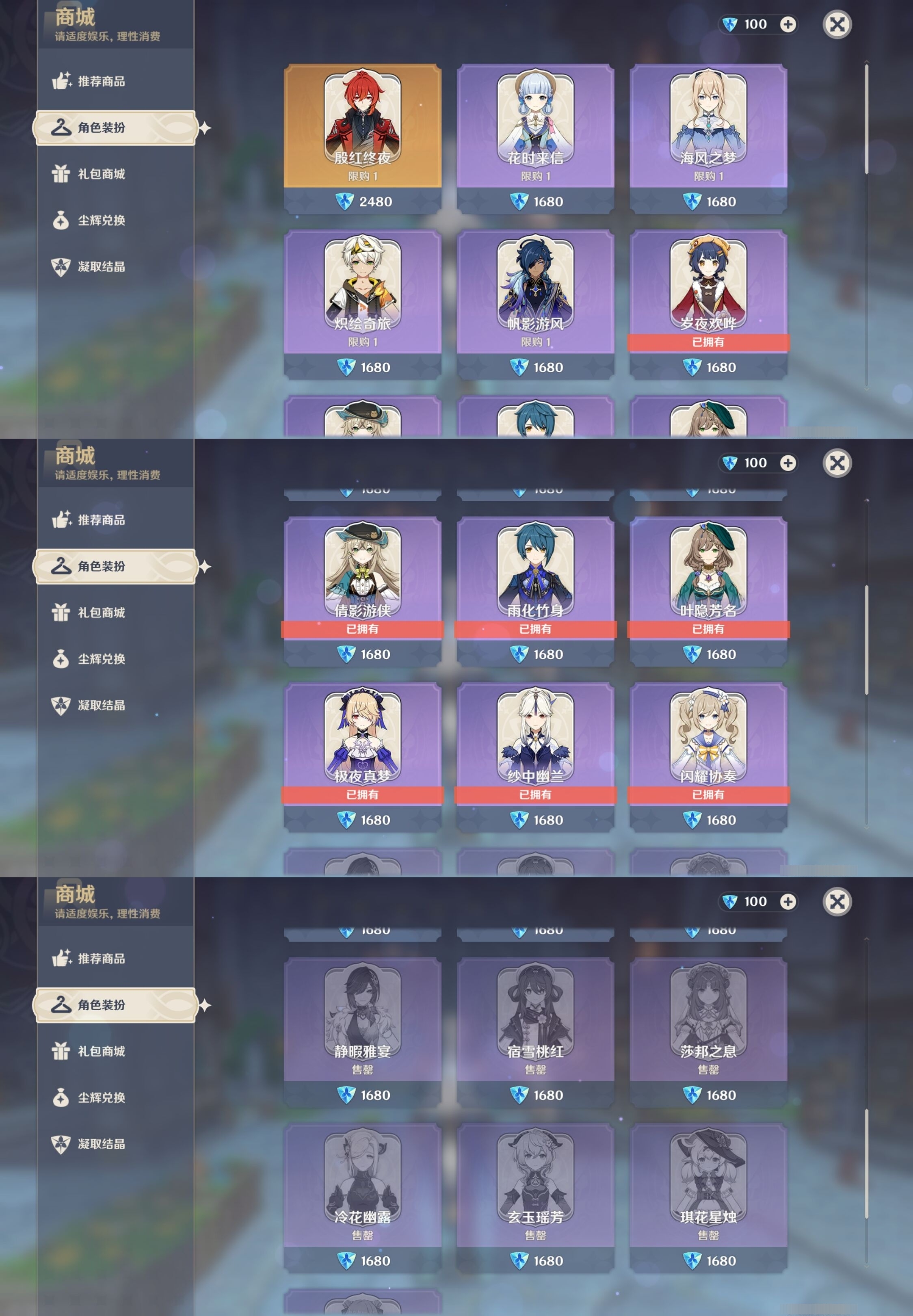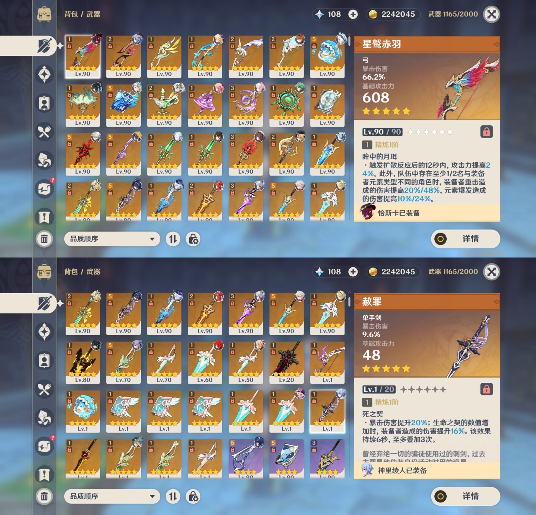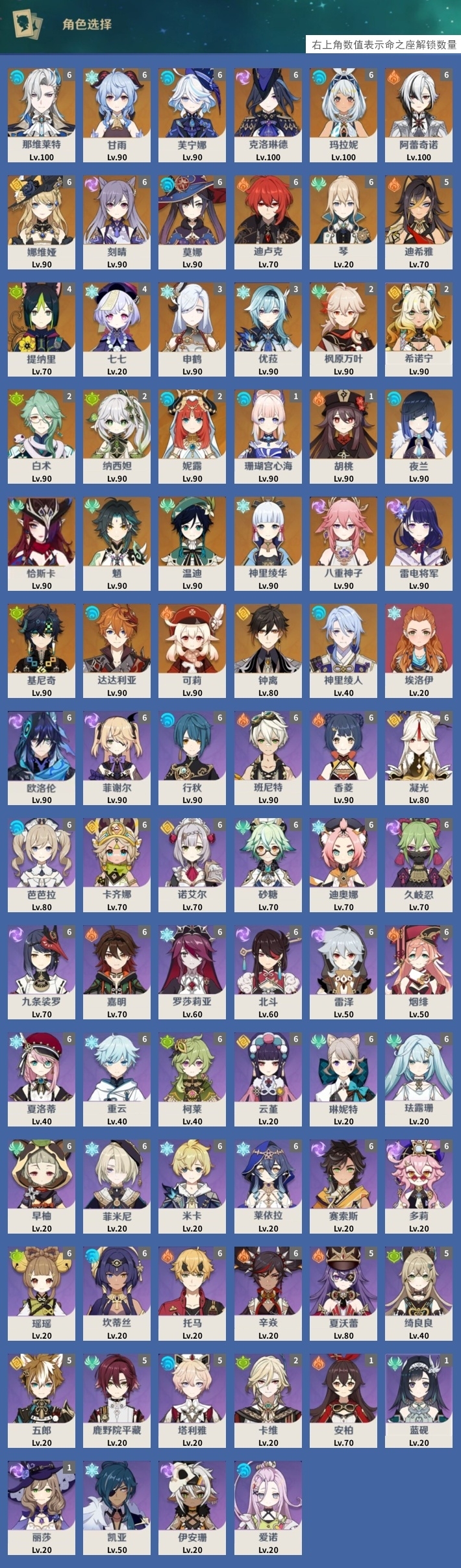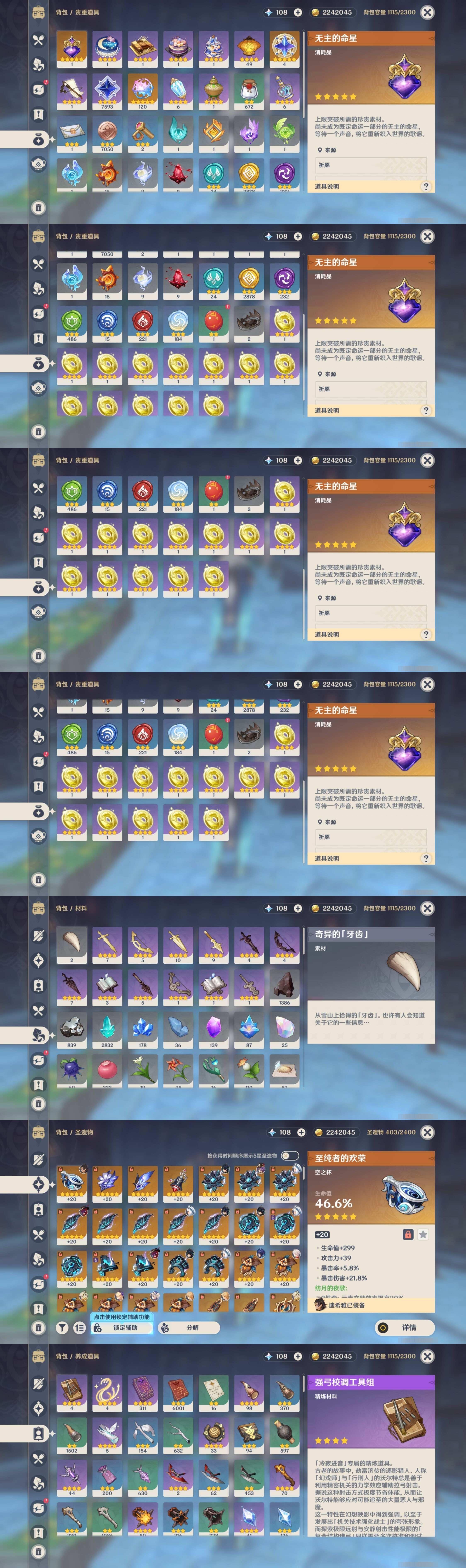 [13975261]223黄 风:2命枫原万叶,0命恰斯卡,2命闲云,0命魈,0命温迪,6命琴 火:6命阿蕾奇诺,1命胡桃,0命可莉,5命迪希雅,6命迪卢克 水:6命那维莱特,0命夜兰,6命芙宁娜,6命玛拉妮,2命妮露,1命珊瑚宫心海,6命莫娜,0命达达利亚,0命神里绫人 冰:6命甘雨,3命申鹤,3命优菈,0命神里绫华,0命埃洛伊,4命七七 岩:2命希诺宁,6命娜维娅,0命钟离 雷:6命克洛琳德,0命八重神子,0命雷电将军,6命刻晴 草:0命基尼奇,2命白术,2命纳西妲,4命提纳里 弓:精1星鹫赤羽,精2最初的大魔术,精1猎人之径,精1终末嗟叹之诗,精2阿莫斯之弓,精2天空之翼,精1飞雷之弦振 法器:精5冲浪时光,精1冲浪时光,精1鹤鸣余音,精5万世流涌大典,精2千夜浮梦,精1神乐之真意,精3不灭月华,精1碧落之珑,精1四风原典,精1天空之卷,精1天空之卷,精1天空之卷 单手剑:精2岩峰巡歌,精5赦罪,精1赦罪,精1静水流涌之辉,精2圣显之钥,精3雾切之回光,精5苍古自由之誓,精1天空之刃,精5裁叶萃光,精1裁叶萃光,精1裁叶萃光,精1风鹰剑,精1风鹰剑,精1风鹰剑,精1有乐御簾切 双手剑:精2裁断,精1松籁响起之时,精1无工之剑,精1天空之傲,精1天空之傲,精1天空之傲,精1狼的末路 长柄武器:精5赤月之形,精5薙草之稻光,精1和璞鸢,精1和璞鸢,精3护摩之杖 【角色皮肤】 五星角色:夜兰-静暇雅宴,胡桃-宿雪桃红,妮露-莎邦之息,申鹤-冷花幽露,甘雨-玄玉瑶芳,可莉-琪花星烛,刻晴-霓裾翩跹 四星角色:香菱-岁夜欢哗,绮良良-倩影游侠,行秋-雨化竹身,丽莎-叶隐芳名,菲谢尔-极夜真梦,凝光-纱中幽兰,芭芭拉-闪耀协奏