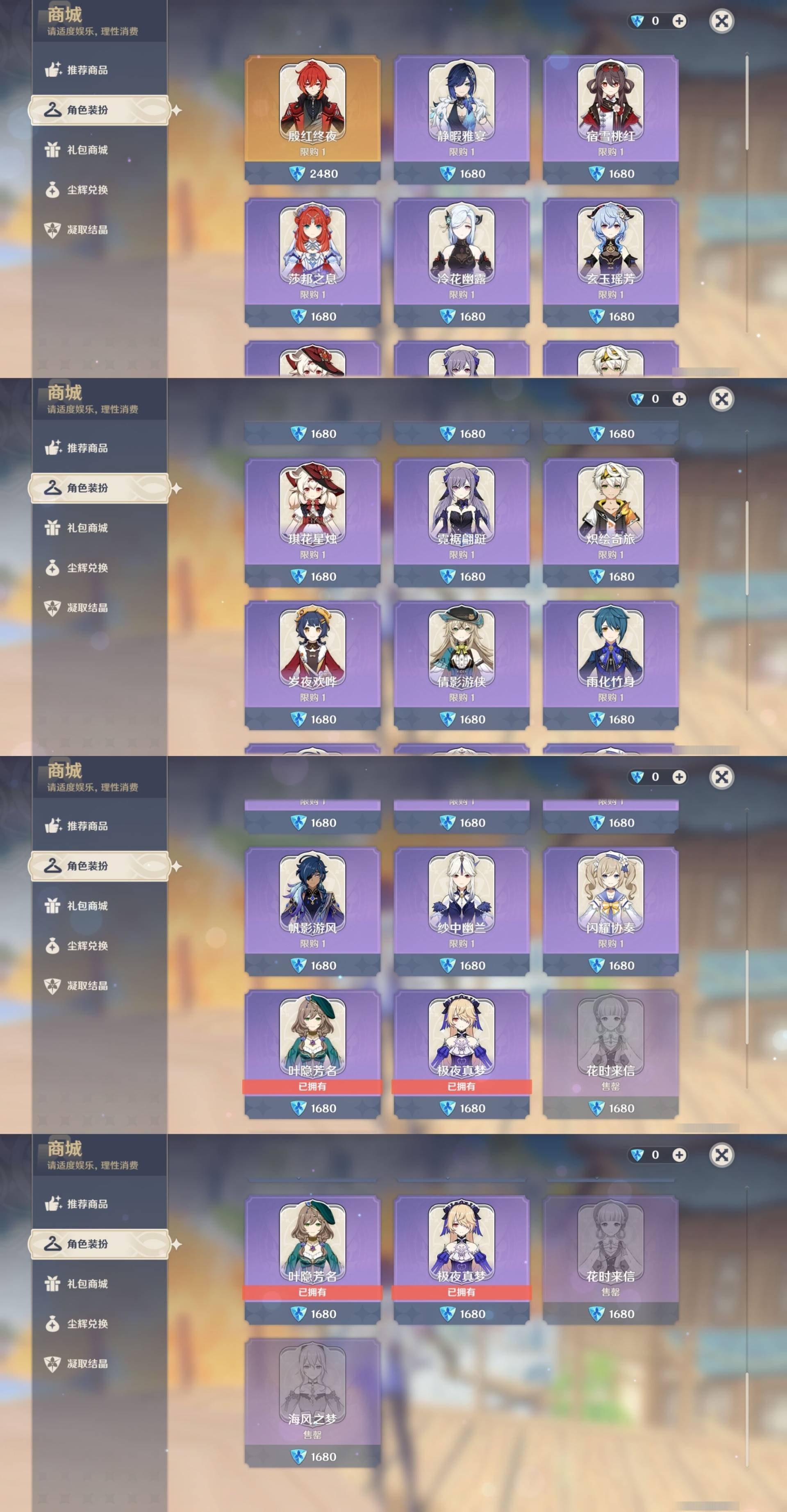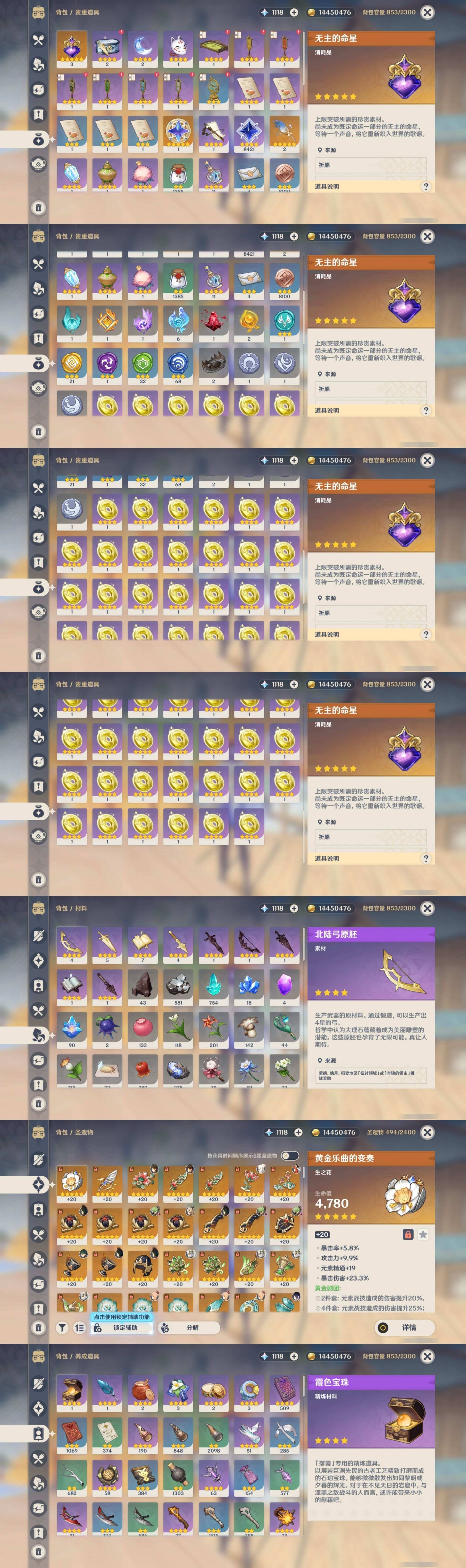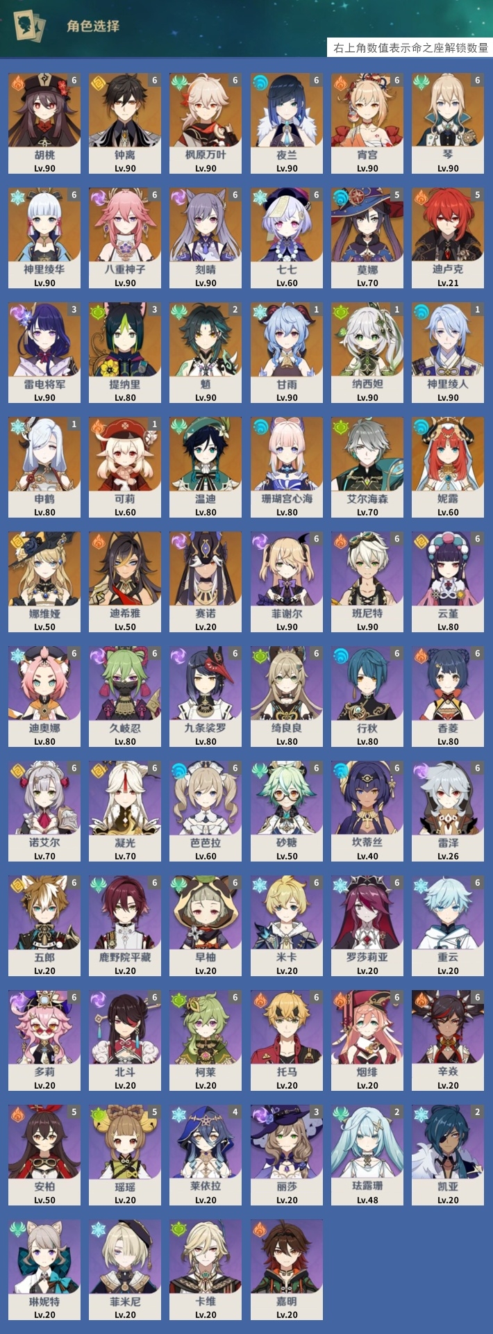 [13976531]187黄 风:6命枫原万叶,2命魈,6命琴,0命温迪 火:6命胡桃,6命宵宫,1命可莉,0命迪希雅,5命迪卢克 水:6命夜兰,1命神里绫人,0命珊瑚宫心海,5命莫娜,0命妮露 冰:1命甘雨,6命神里绫华,1命申鹤,6命七七 岩:6命钟离,0命娜维娅 雷:6命八重神子,3命雷电将军,6命刻晴,0命赛诺 草:1命纳西妲,3命提纳里,0命艾尔海森 弓:精1猎人之径,精5飞雷之弦振,精5飞雷之弦振,精2飞雷之弦振,精3若水,精4阿莫斯之弓,精1天空之翼 法器:精1神乐之真意,精2不灭月华,精5四风原典,精2天空之卷,精1尘世之锁 单手剑:精3波乱月白经津,精4雾切之回光,精5苍古自由之誓,精1苍古自由之誓,精1苍古自由之誓,精1天空之刃,精1圣显之钥,精5斫峰之刃,精1斫峰之刃,精2风鹰剑,精1风鹰剑 双手剑:精4狼的末路,精2天空之傲 长柄武器:精1薙草之稻光,精1薙草之稻光,精1和璞鸢,精1贯虹之槊,精5护摩之杖,精1护摩之杖,精3息灾,精1天空之脊 【角色皮肤】 五星角色:神里绫华-花时来信,琴-海风之梦 四星角色:丽莎-叶隐芳名,菲谢尔-极夜真梦
