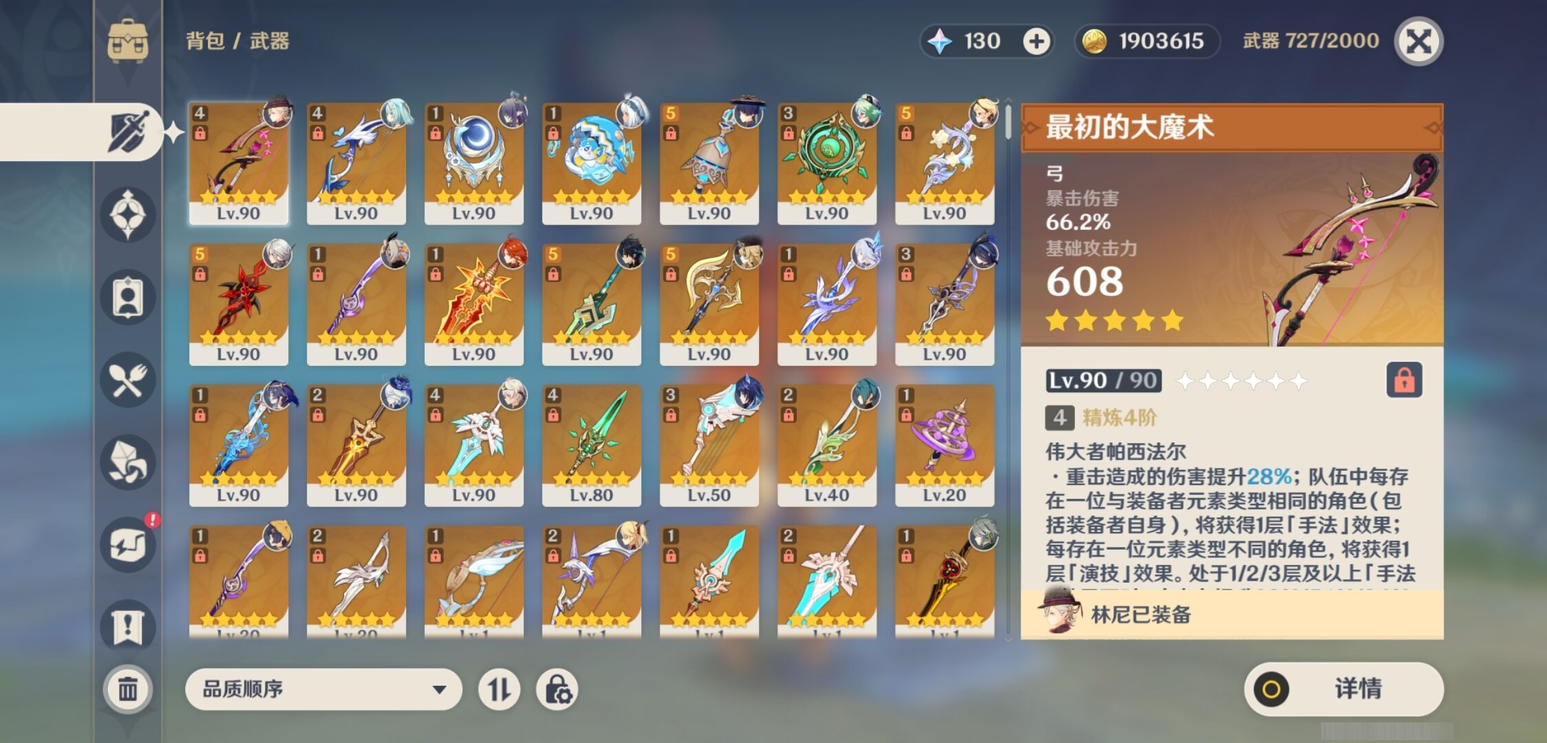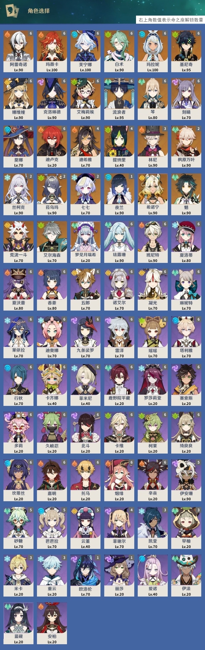 [13976557]202黄 风:6命流浪者,2命枫原万叶,0命魈,6命琴,0命梦见月瑞希 火:6命阿蕾奇诺,6命玛薇卡,3命林尼,4命迪希雅,6命迪卢克 水:6命芙宁娜,6命玛拉妮,1命夜兰,6命莫娜 冰:2命丝柯克,2命七七 岩:6命娜维娅,0命希诺宁,0命荒泷一斗 雷:6命克洛琳德,6命刻晴 草:6命白术,6命基尼奇,6命艾梅莉埃,2命菈乌玛,0命艾尔海森,4命提纳里 弓:精4最初的大魔术,精4若水,精3天空之翼,精1白雨心弦,精2阿莫斯之弓 法器:精1纺夜天镜,精1冲浪时光,精5图莱杜拉的回忆,精3碧落之珑,精1神乐之真意 单手剑:精1苍耀,精3赦罪,精1静水流涌之辉,精2圣显之钥,精4天空之刃,精2裁叶萃光,精2风鹰剑,精1有乐御簾切 双手剑:精1焚曜千阳,精5山王长牙,精5裁断,精2天空之傲 长柄武器:精5柔灯挽歌,精5赤月之形,精1薙草之稻光,精1薙草之稻光,精4和璞鸢,精1天空之脊 【角色皮肤】 四星角色:班尼特-炽绘奇旅,香菱-岁夜欢哗,绮良良-倩影游侠