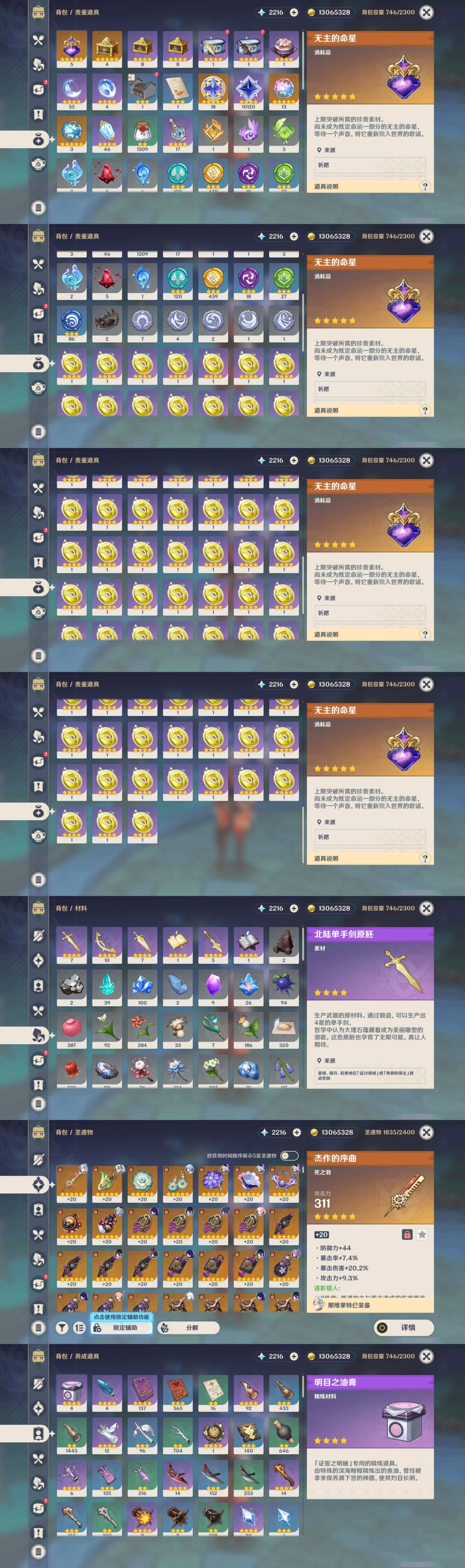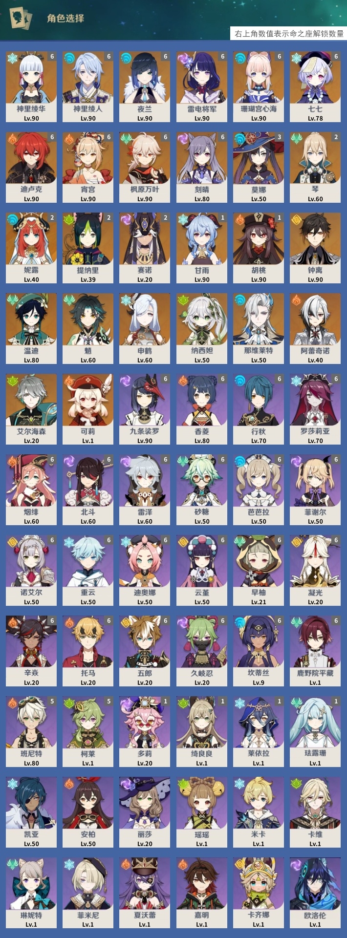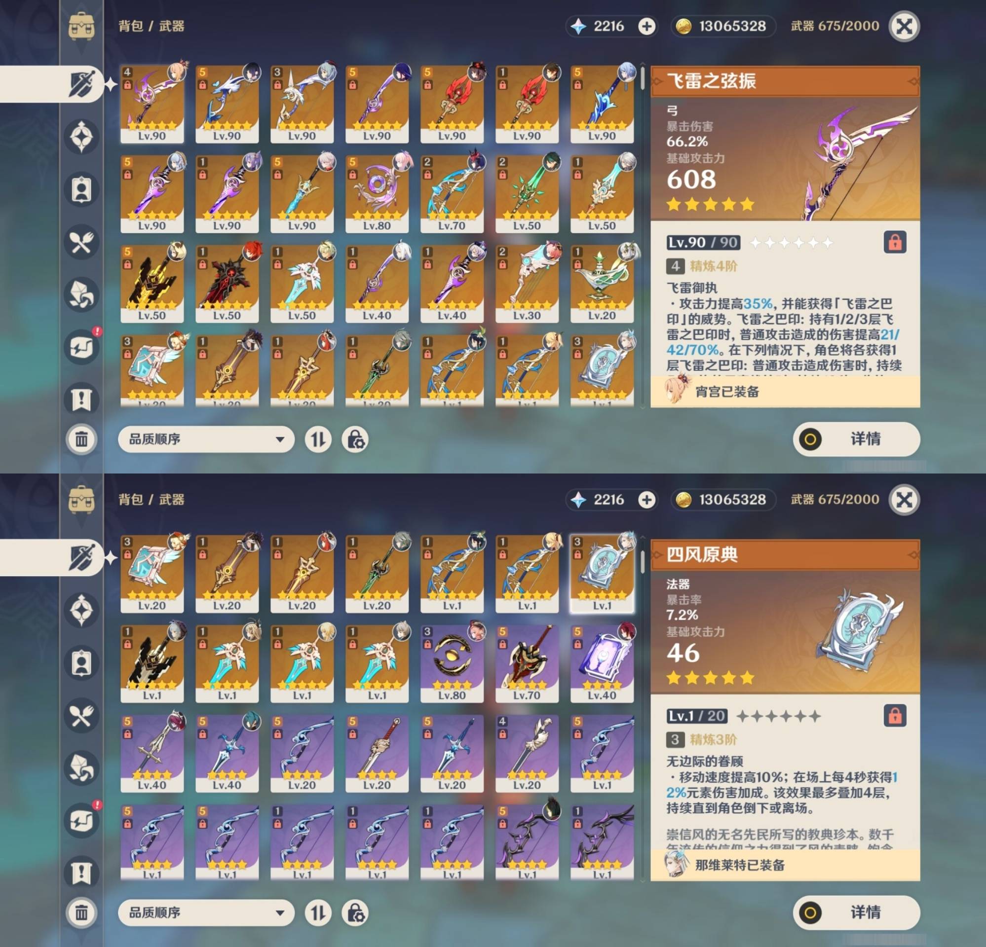[13976876]175黄 风:6命枫原万叶,0命温迪,0命魈,2命琴 火:6命宵宫,1命胡桃,6命迪卢克,0命阿蕾奇诺,0命可莉 水:6命夜兰,6命神里绫人,6命珊瑚宫心海,0命那维莱特,3命莫娜,2命妮露 冰:1命甘雨,6命神里绫华,6命七七,0命申鹤 岩:0命钟离 雷:6命雷电将军,6命刻晴,2命赛诺 草:0命纳西妲,2命提纳里,0命艾尔海森 弓:精4飞雷之弦振,精5若水,精3阿莫斯之弓,精2终末嗟叹之诗,精1终末嗟叹之诗,精1终末嗟叹之诗,精2天空之翼 法器:精5不灭月华,精1千夜浮梦,精3天空之卷,精3四风原典 单手剑:精5波乱月白经津,精5雾切之回光,精1雾切之回光,精1雾切之回光,精5苍古自由之誓,精1天空之刃,精1天空之刃,精1天空之刃,精1天空之刃,精1圣显之钥,精1磐岩结绿 双手剑:精5无工之剑,精1无工之剑,精1狼的末路 长柄武器:精5薙草之稻光,精1薙草之稻光,精5护摩之杖,精1护摩之杖,精2和璞鸢,精1天空之脊,精1赤沙之杖 【角色皮肤】 五星角色:迪卢克-殷红终夜,神里绫华-花时来信 四星角色:凝光-纱中幽兰