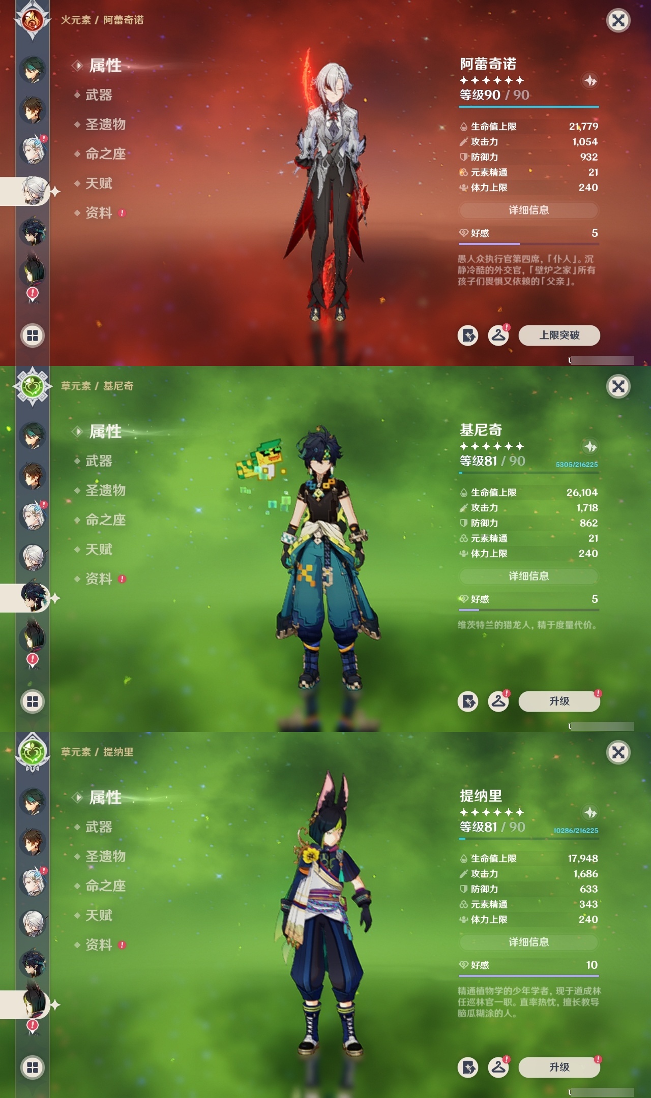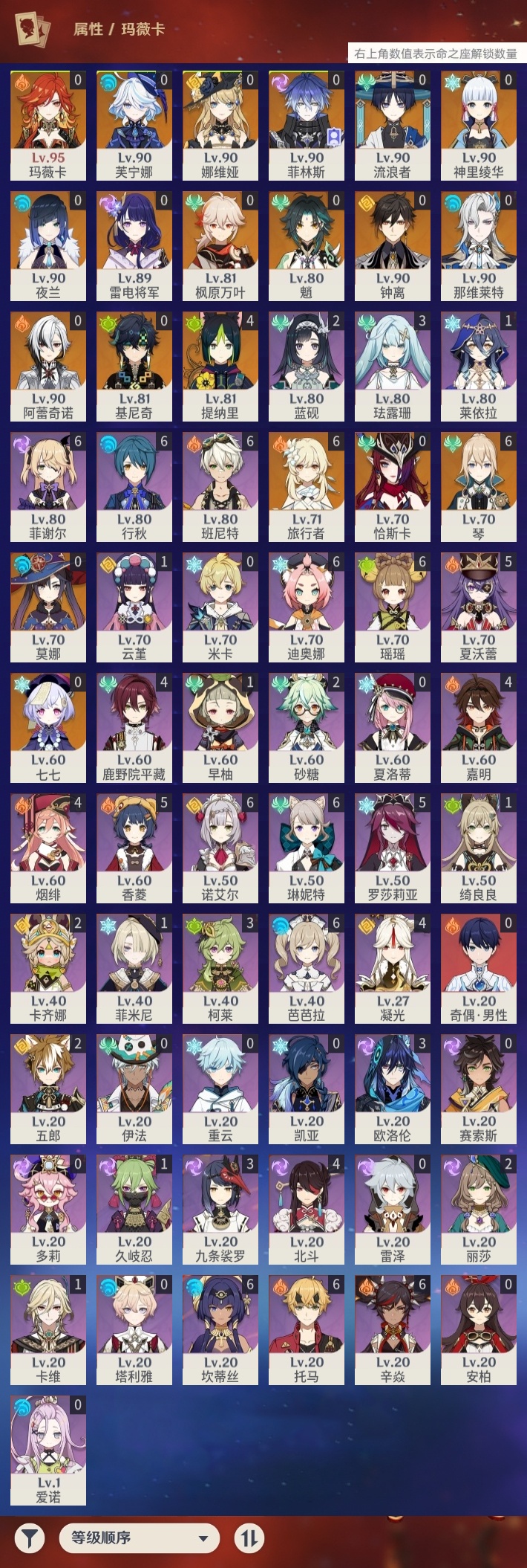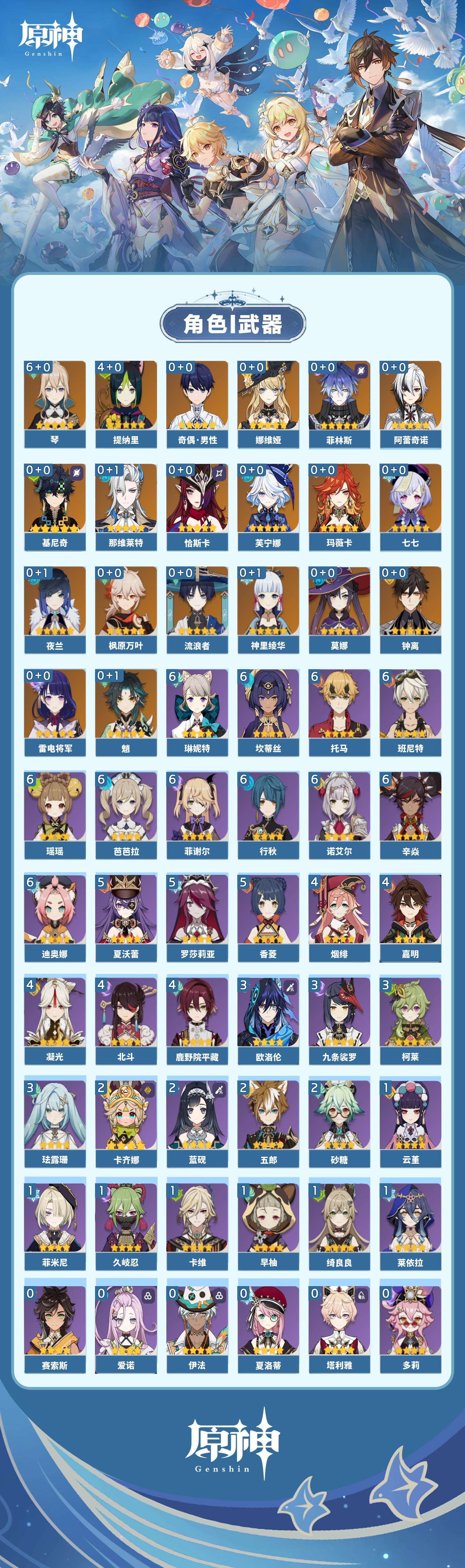 【原神】【lyys8218】冒险等级:59,五星数量:30,五星角色:琴 6命提纳里 4命莫娜七七基尼奇神里绫华恰斯卡玛薇卡钟离那维莱特夜兰芙宁娜娜维娅阿蕾奇诺菲林斯流浪者枫原万叶魈雷电将军__五星武器:万世流涌大典阿莫斯之弓风鹰剑和璞鸢狼的末路天空之刃雾切之回光若水赦罪白雨心弦__四星角色:班尼特 6命行秋 6命迪奥娜 6命瑶瑶 6命坎蒂丝 6命芭芭拉 6命托马 6命辛焱 6命诺艾尔 6命菲谢尔 6命琳妮特 6命香菱 5命罗莎莉亚 5命夏沃蕾 5命鹿野院平藏 4命凝光 4命烟绯 4命北斗 4命嘉明 4命九条裟罗 3命珐露珊 3命柯莱 3命欧洛伦 3命卡齐娜 2命砂糖 2命蓝砚 2命五郎 2命久岐忍 1命绮良良 1命莱依拉 1命卡维 1命云堇 1命早柚 1命菲米尼 1命奇偶·男性米卡多莉重云雷泽夏洛蒂伊法塔利雅爱诺赛索斯