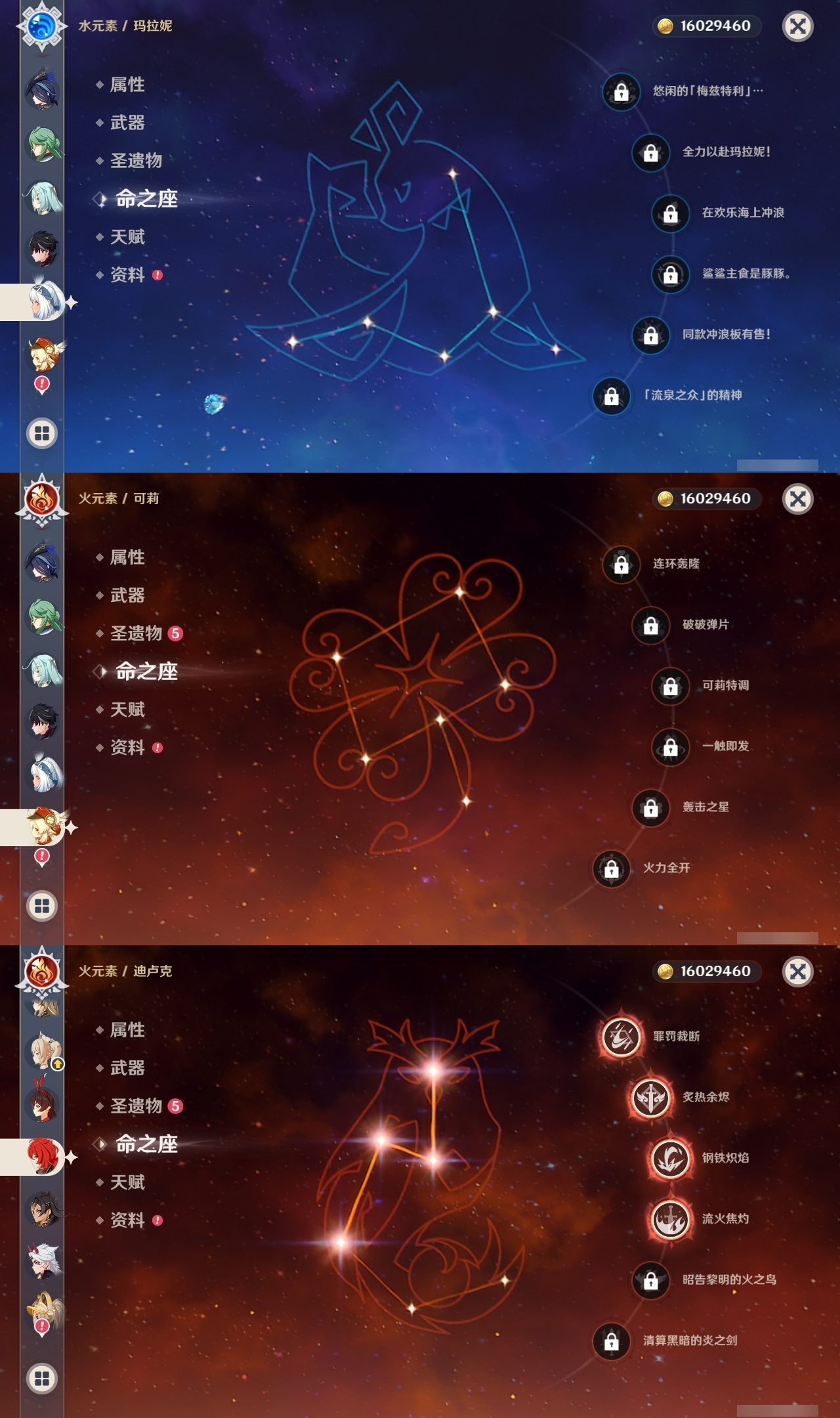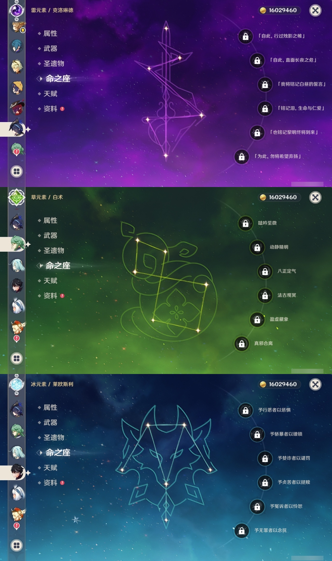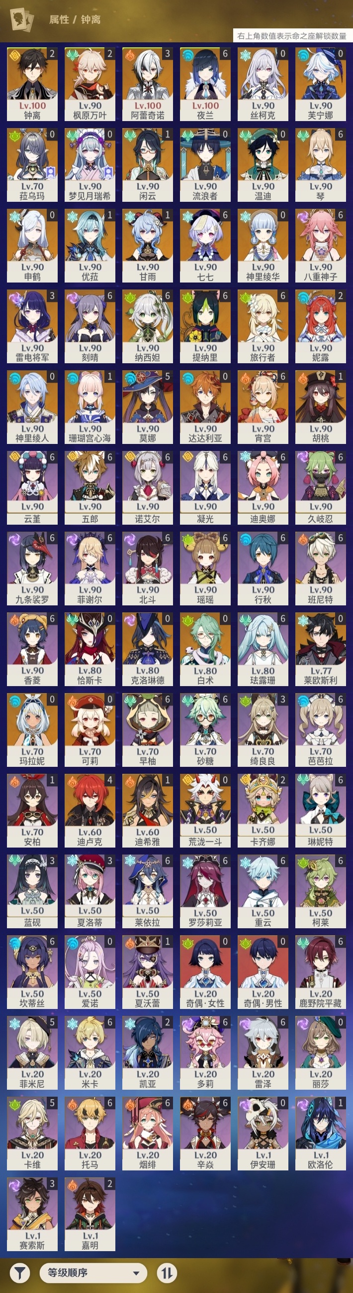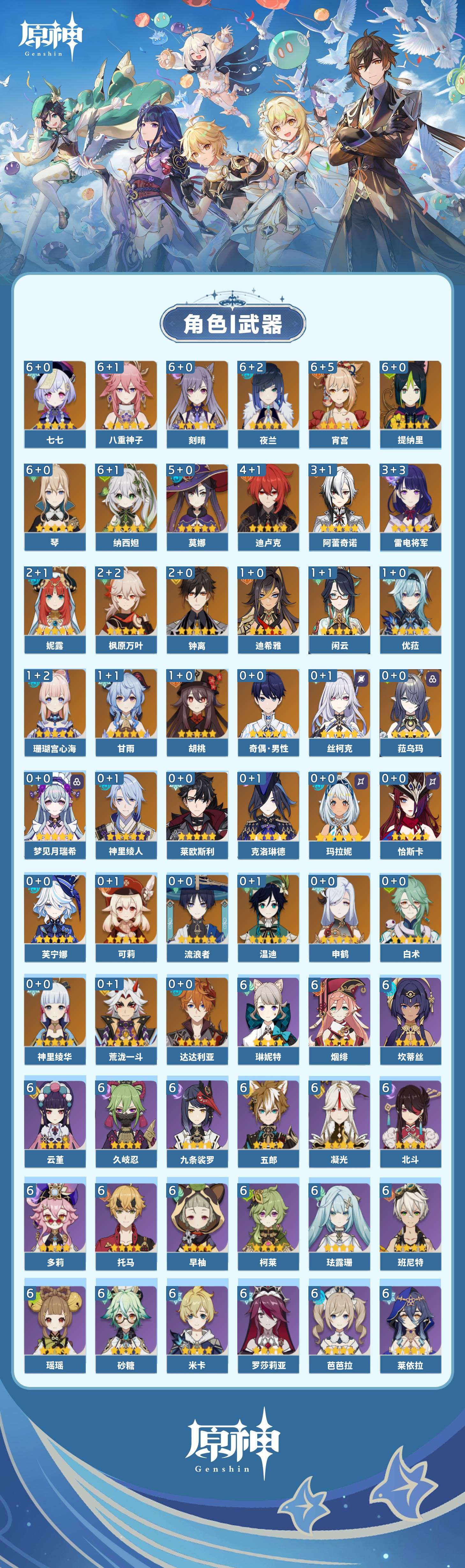 【原神】满命,冒险等级:60,五星数量:66,五星角色:刻晴 6命七七 6命琴 6命宵宫 6命八重神子 6命夜兰 6命提纳里 6命纳西妲 6命莫娜 5命迪卢克 4命阿蕾奇诺 3命雷电将军 3命枫原万叶 2命钟离 2命妮露 2命迪希雅 1命闲云 1命甘雨 1命胡桃 1命珊瑚宫心海 1命优菈 1命玛拉妮白术神里绫华温迪恰斯卡荒泷一斗达达利亚梦见月瑞希申鹤神里绫人莱欧斯利芙宁娜丝柯克菈乌玛流浪者克洛琳德可莉__五星武器:飞雷之弦振 5精天空之傲 3精薙草之稻光 3精斫峰之刃 3精不灭月华 2精苍古自由之誓 2精若水 2精鹤鸣余音赤月之形苍耀阿莫斯之弓狼的末路磐岩结绿四风原典天空之脊天空之卷天空之刃天空之翼终末嗟叹之诗赤角石溃杵神乐之真意波乱月白经津赤沙之杖圣显之钥千夜浮梦赦罪__四星角色:班尼特 6命行秋 6命九条裟罗 6命香菱 6命久岐忍 6命鹿野院平藏 6命珐露珊 6命凝光 6命迪奥娜 6命砂糖 6命瑶瑶 6命莱依拉 6命米卡 6命坎蒂丝 6命多莉 6命柯莱 6命芭芭拉 6命云堇 6命早柚 6命托马 6命五郎 6命烟绯 6命重云 6命辛焱 6命诺艾尔 6命罗莎莉亚 6命雷泽 6命菲谢尔 6命北斗 6命琳妮特 6命卡维 5命菲米尼 5命绮良良 3命蓝砚 3命夏洛蒂 3命赛索斯 3命卡齐娜 2命嘉明 2命欧洛伦 1命夏沃蕾 1命奇偶·女性奇偶·男性伊安珊爱诺