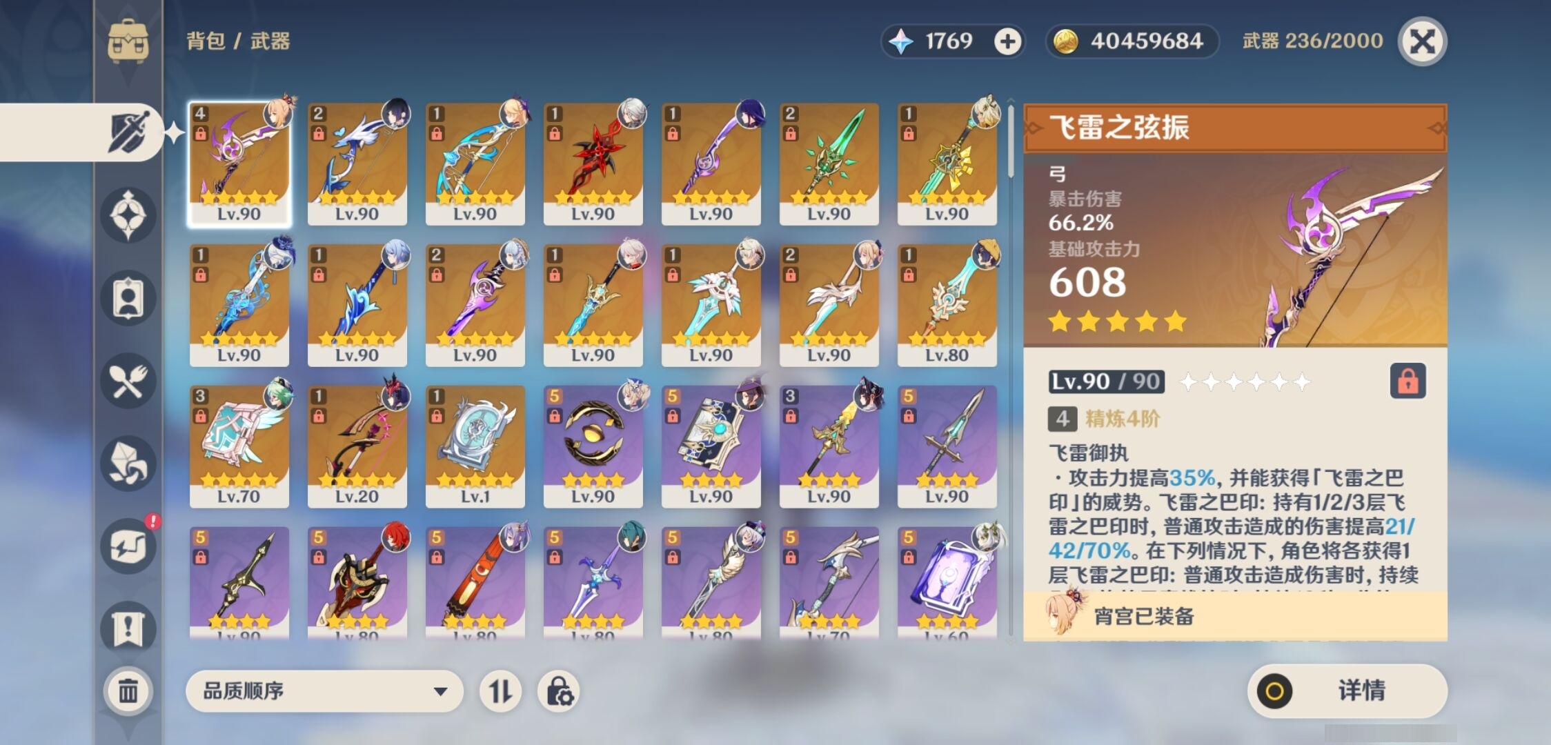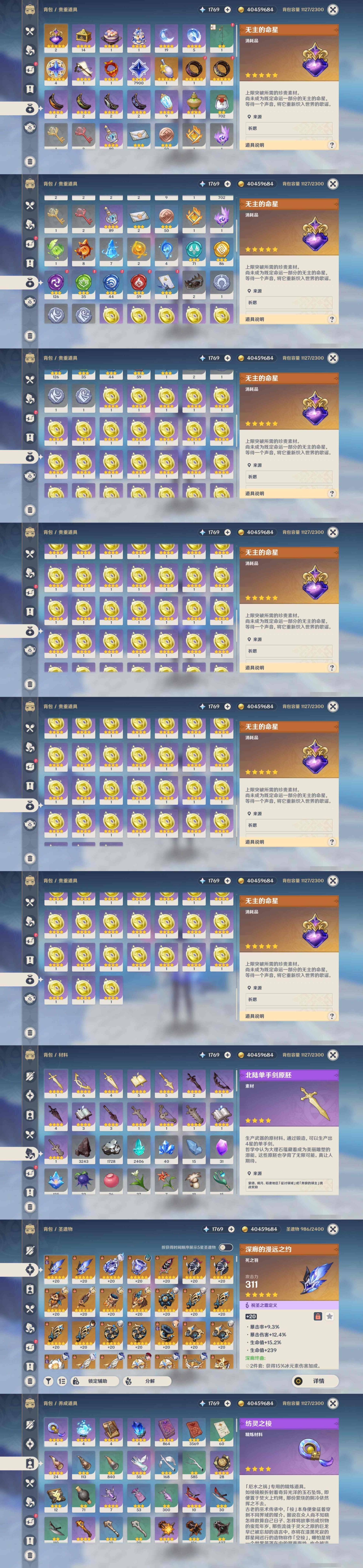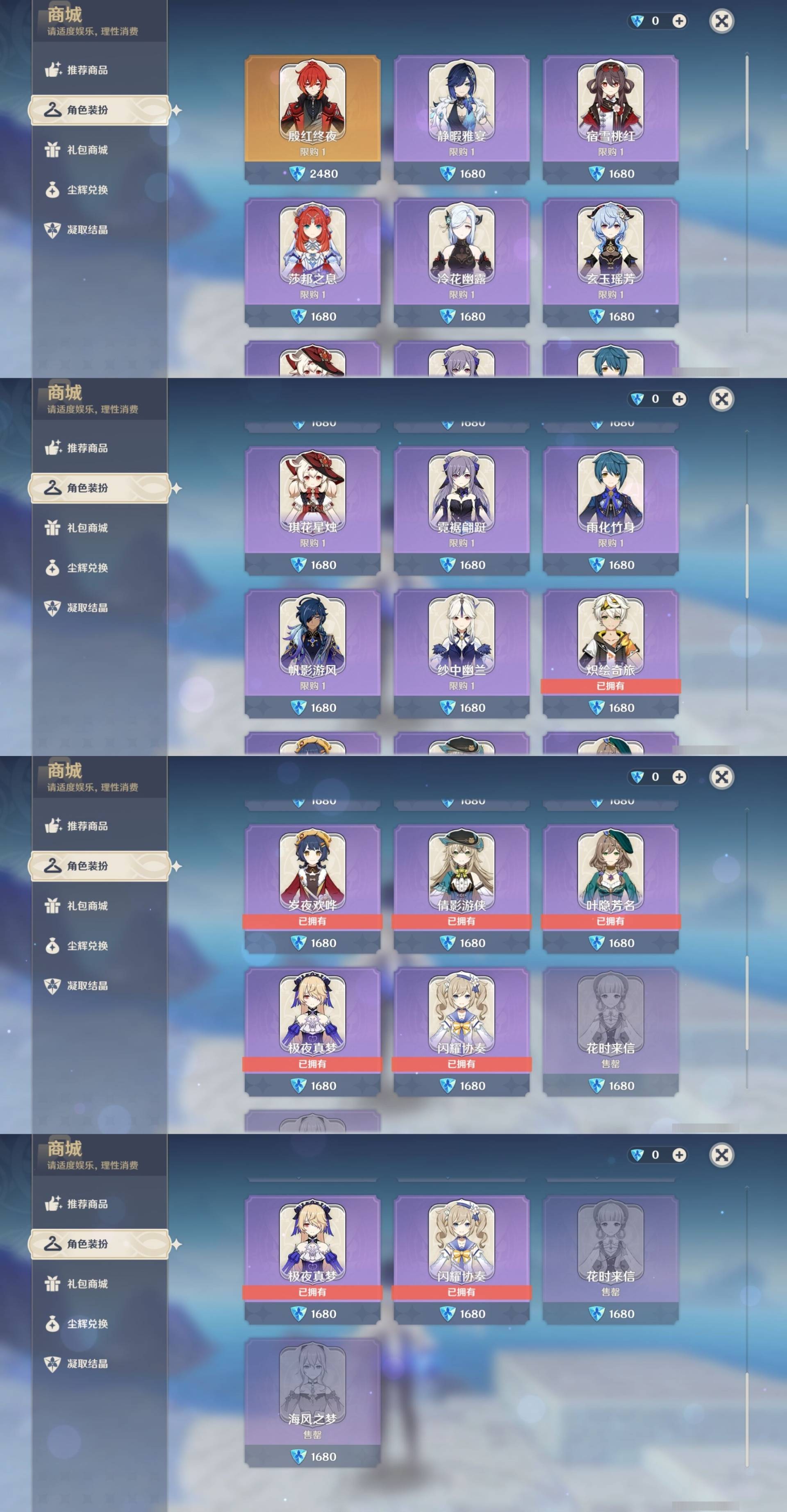[14006783]110黄 风:6命枫原万叶,6命琴 火:6命宵宫,1命阿蕾奇诺,3命迪卢克,1命迪希雅 水:6命夜兰,6命神里绫人,4命芙宁娜,4命莫娜 冰:6命神里绫华,0命丝柯克,1命七七,0命埃洛伊 岩:2命钟离,2命希诺宁 雷:6命雷电将军,4命刻晴 草:0命纳西妲,0命提纳里 弓:精4飞雷之弦振,精2若水,精1终末嗟叹之诗,精1最初的大魔术 法器:精3天空之卷,精1四风原典 单手剑:精1岩峰巡歌,精1静水流涌之辉,精1波乱月白经津,精2雾切之回光,精1苍古自由之誓,精1天空之刃,精2风鹰剑 长柄武器:精1赤月之形,精1薙草之稻光,精2和璞鸢,精1天空之脊 【角色皮肤】 五星角色:神里绫华-花时来信,琴-海风之梦 四星角色:班尼特-炽绘奇旅,香菱-岁夜欢哗,绮良良-倩影游侠,丽莎-叶隐芳名,菲谢尔-极夜真梦,芭芭拉-闪耀协奏