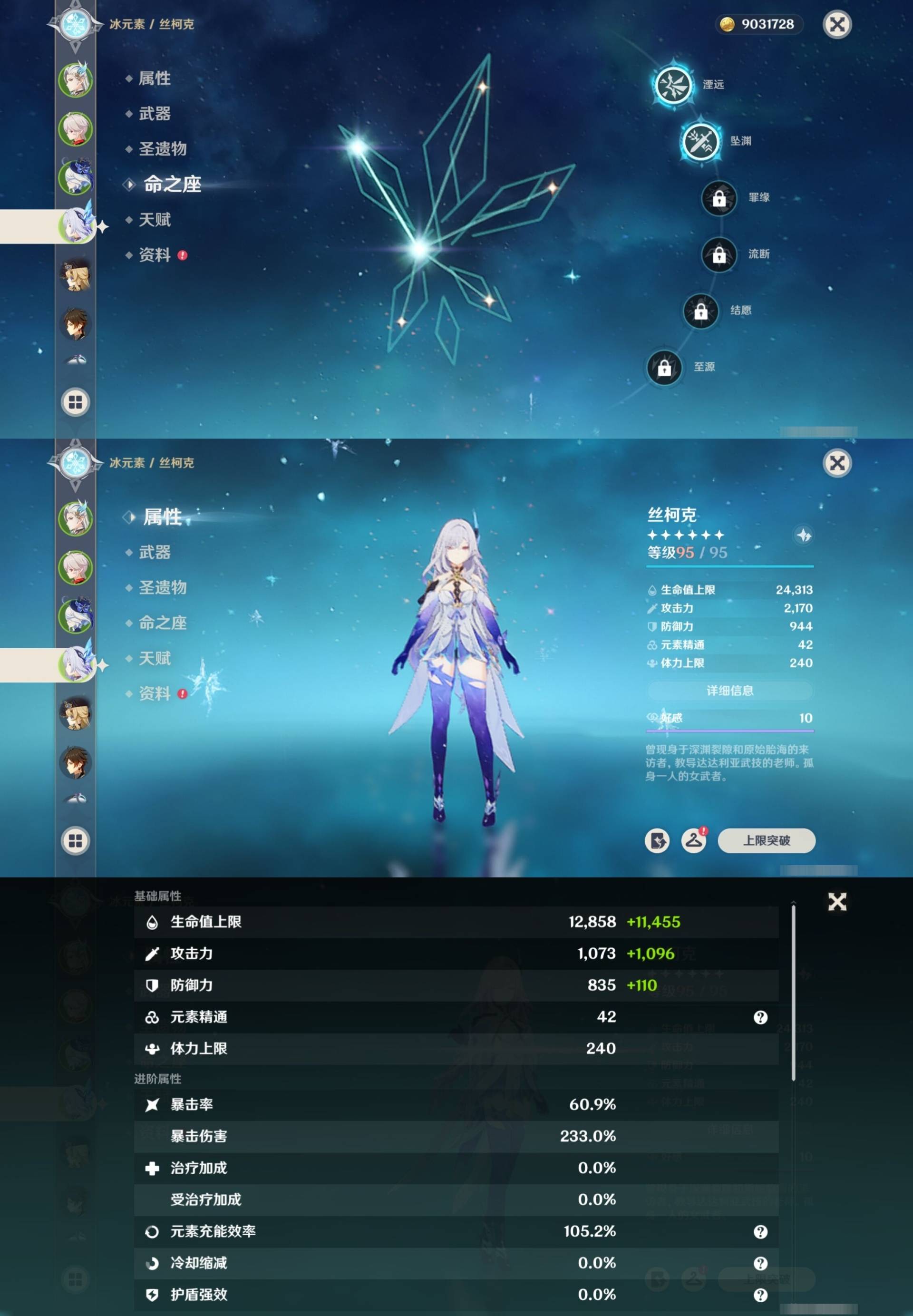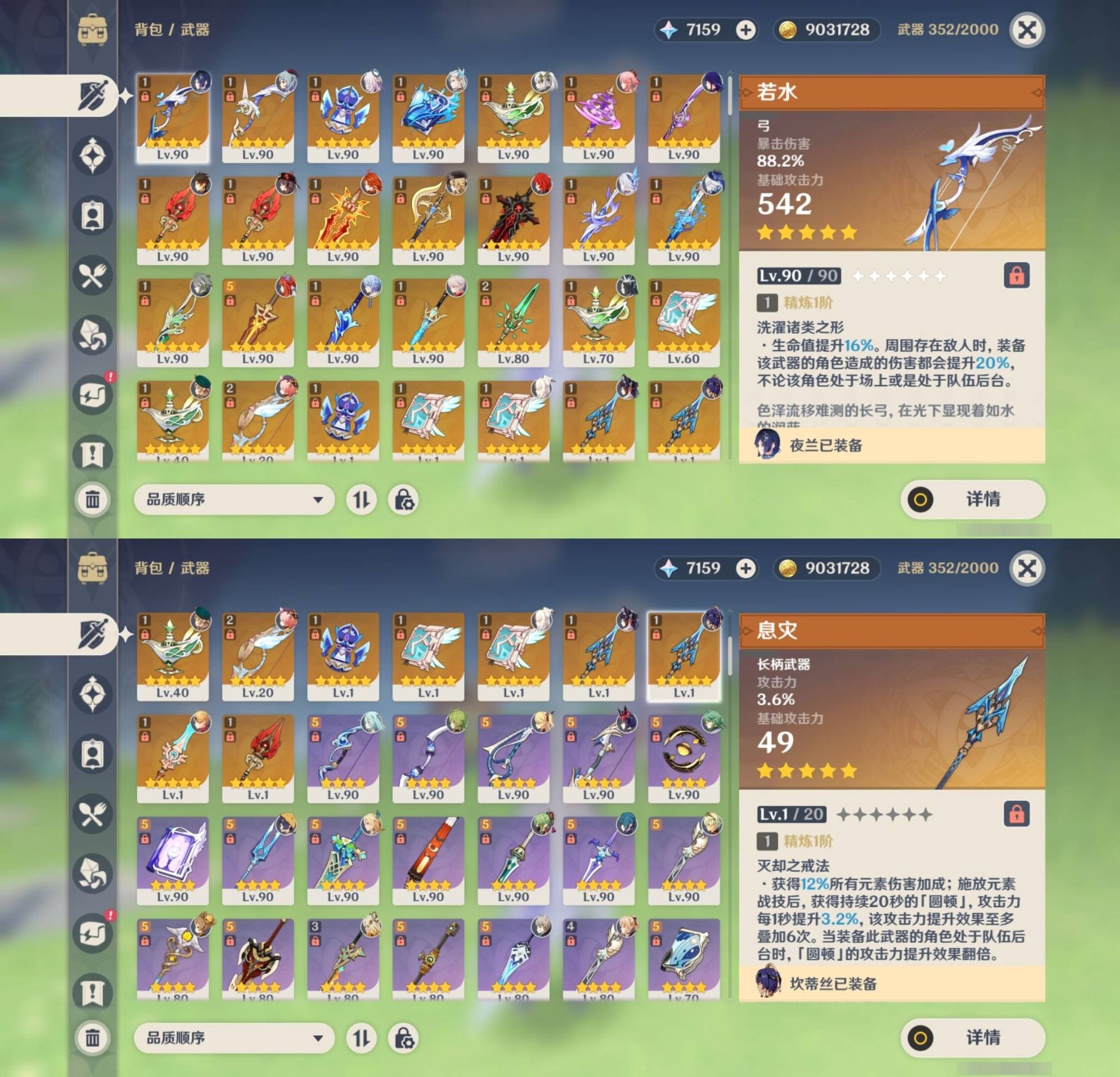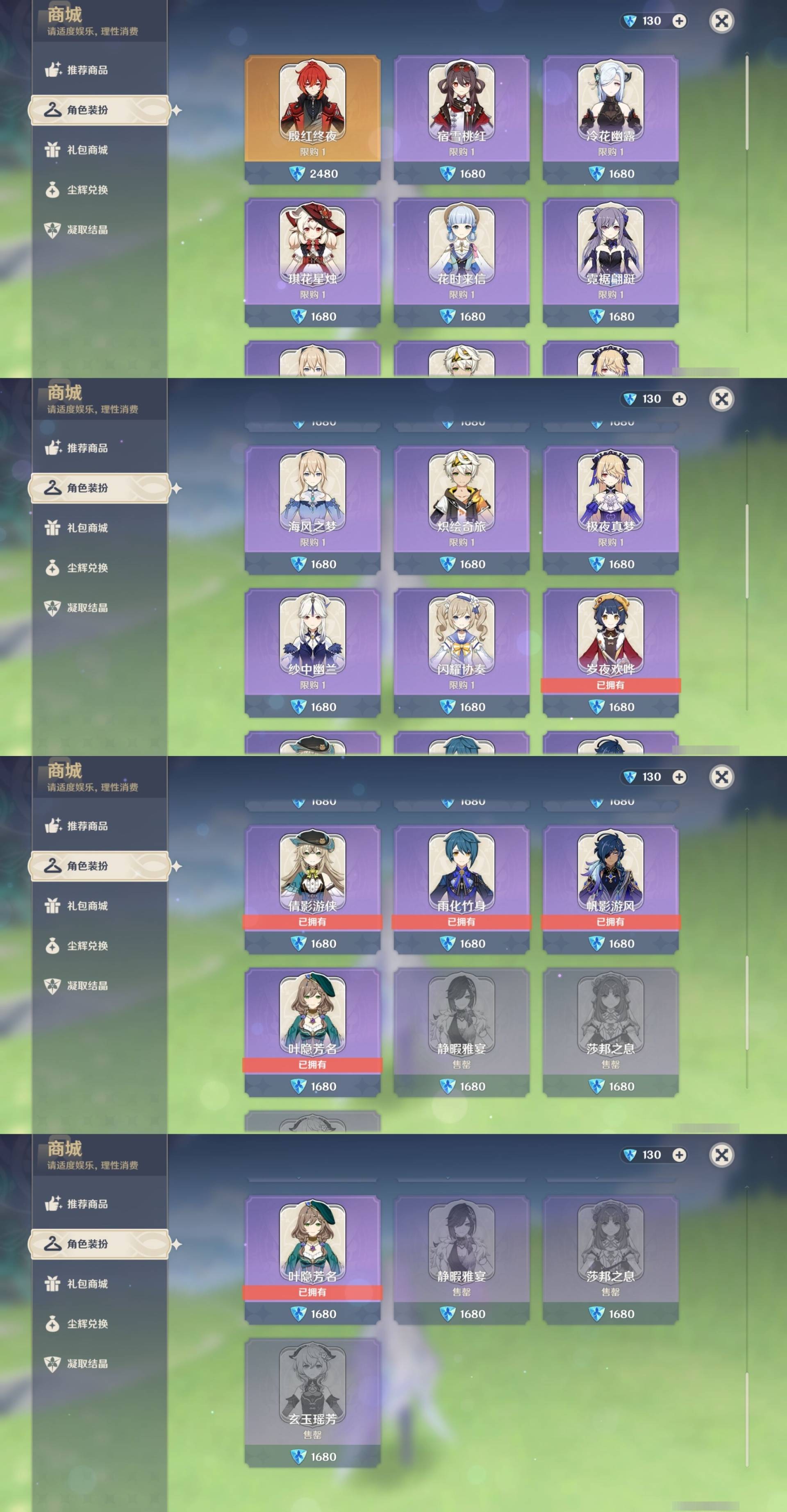 [14006865]130黄 风元素:2命枫原万叶 火元素:0命玛薇卡 1命胡桃 水元素:1命那维莱特 6命芙宁娜 6命妮露 0命神里绫人 6命夜兰 1命珊瑚宫心海 雷元素:2命八重神子 3命雷电将军 冰元素:2命丝柯克 0命茜特菈莉 1命甘雨 岩元素:2命娜维娅 0命钟离 0命希诺宁 草元素:2命纳西妲 2命白术 2命艾尔海森 【常驻五星角色及命座】 风元素:6命琴 火元素:4命迪卢克 3命迪希雅 水元素:4命莫娜 雷元素:2命刻晴 冰元素:6命七七 草元素:3命提纳里 单手剑:精5圣显之钥 精1波乱月白经津 精1苍古自由之誓 精1苍耀 精1裁叶萃光 精1静水流涌之辉 双手剑:精1焚曜千阳 精1狼的末路 精1裁断 长柄武器:精2和璞鸢 精1天空之脊 精1息灾 精1息灾 精1护摩之杖 精1护摩之杖 精1护摩之杖 精1薙草之稻光 法器:精1万世流涌大典 精1千夜浮梦 精1千夜浮梦 精1千夜浮梦 精1天空之卷 精1天空之卷 精1天空之卷 精1神乐之真意 精1祭星者之望 精1祭星者之望 弓:精2白雨心弦 精1若水 精1阿莫斯之弓 【角色皮肤】 五星角色:妮露-莎邦之息 夜兰-静暇雅宴 四星角色:绮良良-倩影游侠 凯亚-帆影游风 丽莎-叶隐芳名 行秋-雨化竹身 香菱-岁夜欢哗