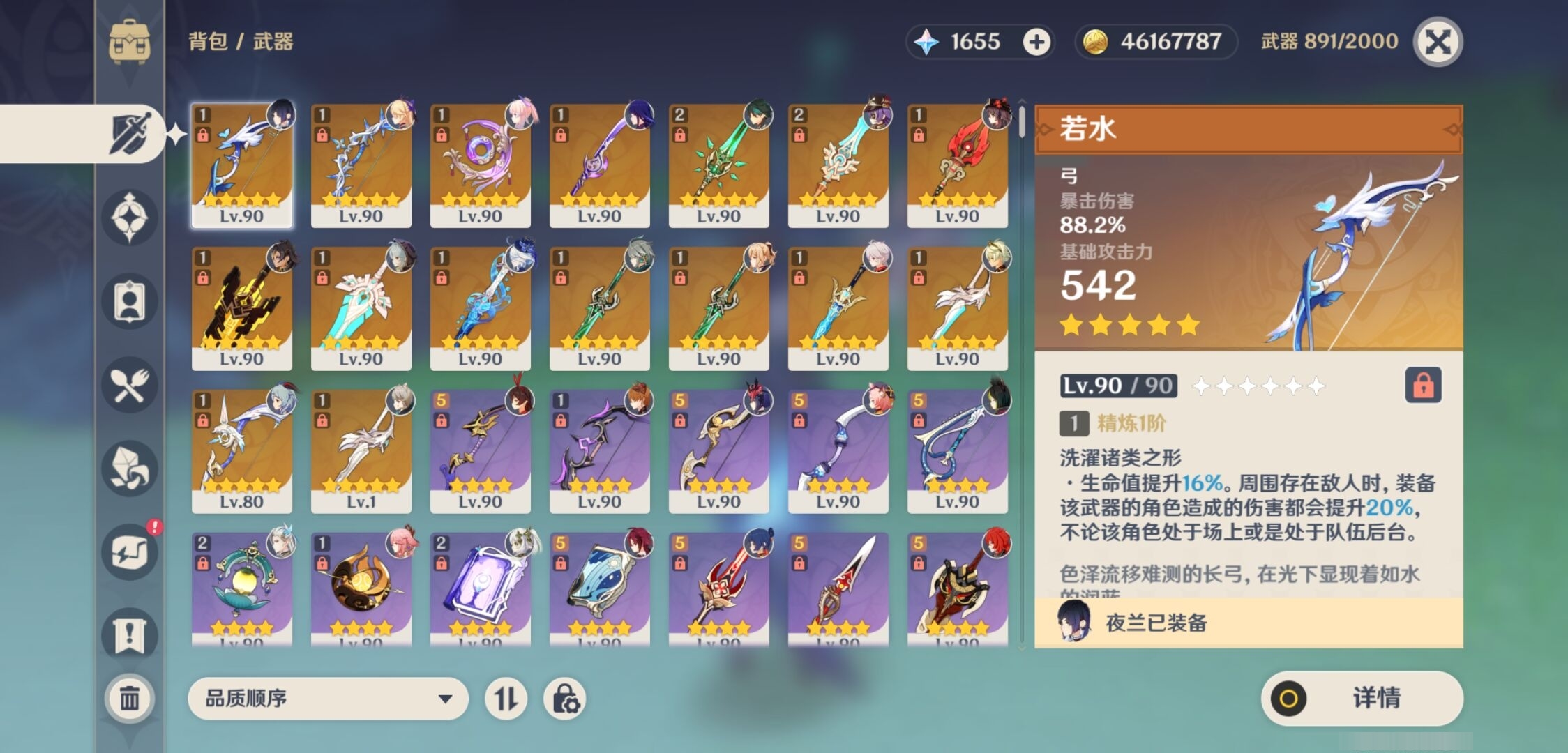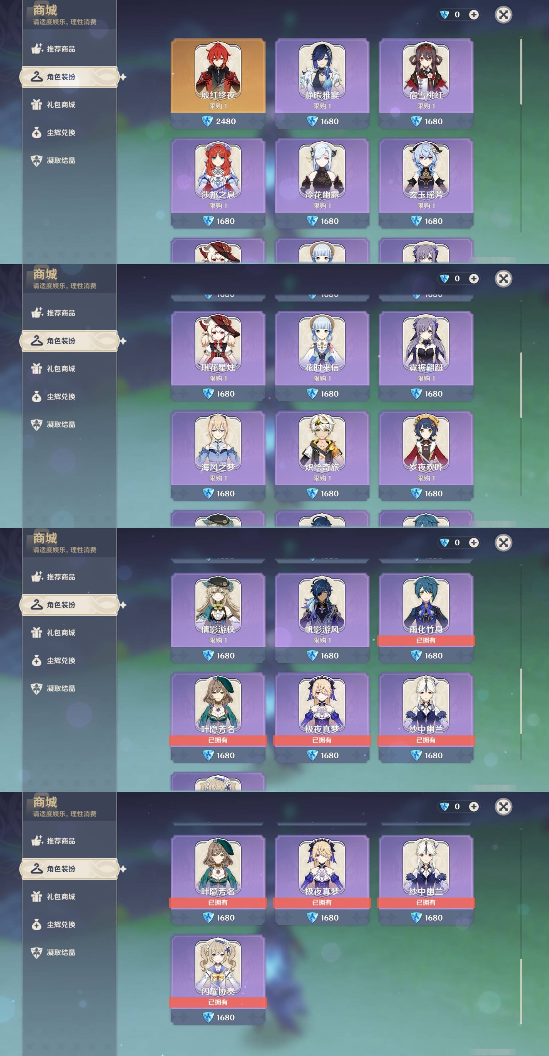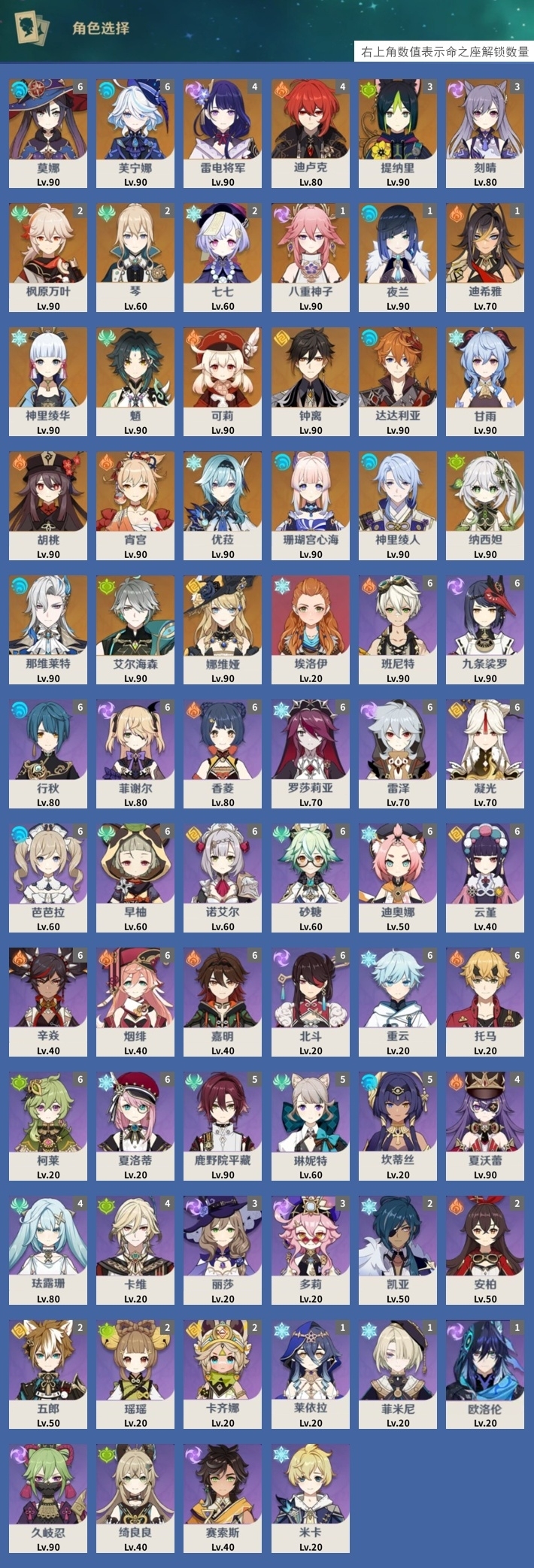 [14007312]81黄 风:2命枫原万叶,0命魈,2命琴 火:0命宵宫,0命胡桃,0命可莉,4命迪卢克,1命迪希雅 水:1命夜兰,6命芙宁娜,0命那维莱特,0命神里绫人,0命珊瑚宫心海,6命莫娜,0命达达利亚 冰:0命优菈,0命甘雨,0命神里绫华,2命七七,0命埃洛伊 岩:0命娜维娅,0命钟离 雷:4命雷电将军,1命八重神子,3命刻晴 草:0命艾尔海森,0命纳西妲,3命提纳里 弓:精1若水,精1冬极白星,精1阿莫斯之弓 法器:精1不灭月华 单手剑:精1静水流涌之辉,精1磐岩结绿,精1磐岩结绿,精1苍古自由之誓,精1风鹰剑,精1风鹰剑 双手剑:精1无工之剑,精1天空之傲 长柄武器:精1薙草之稻光,精2和璞鸢,精2天空之脊,精1护摩之杖 【角色皮肤】 四星角色:行秋-雨化竹身,丽莎-叶隐芳名,菲谢尔-极夜真梦,凝光-纱中幽兰,芭芭拉-闪耀协奏