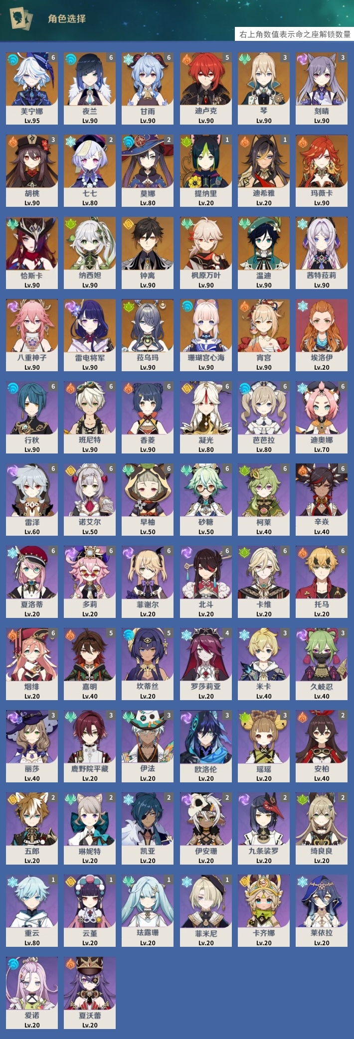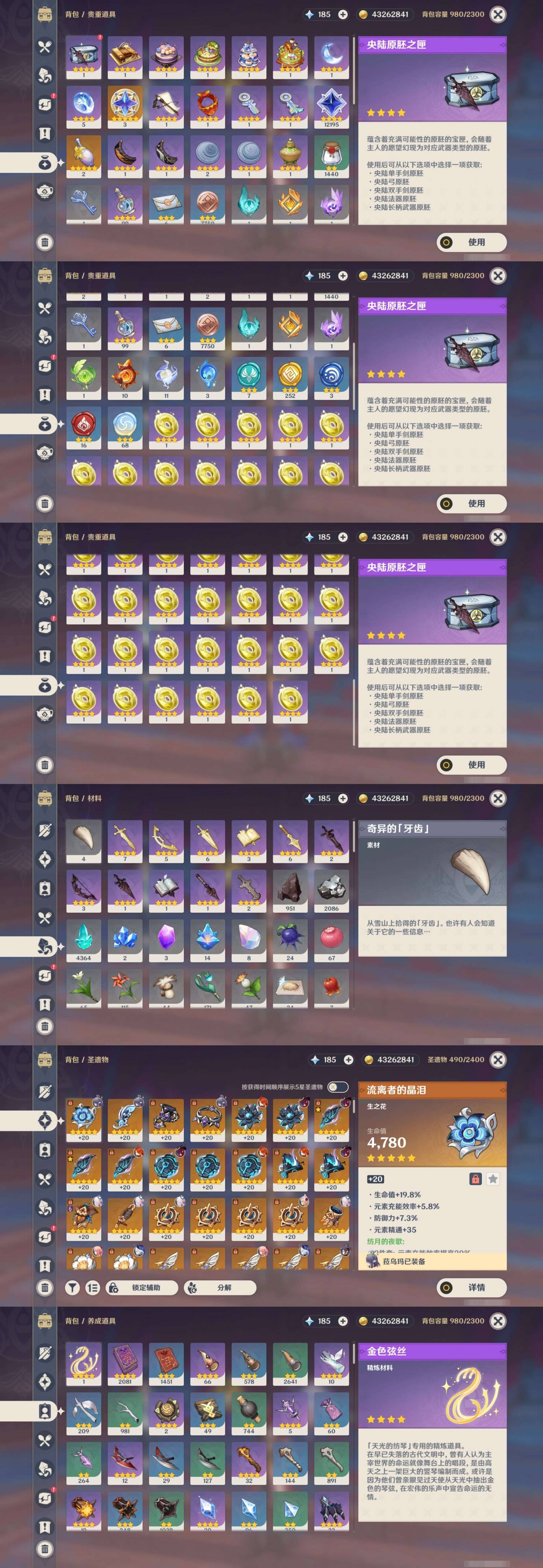 [14007341]83黄 风系:0命恰斯卡/0命枫原万叶/0命温迪/3命琴 火系:0命宵宫/3命胡桃/5命迪卢克/1命迪希雅/0命玛薇卡 水系:0命珊瑚宫心海/2命莫娜/6命芙宁娜/6命夜兰 冰系:6命甘雨/0命茜特菈莉/2命七七/0命埃洛伊 岩系:0命钟离 雷系:0命八重神子/0命雷电将军/3命刻晴 草系:0命纳西妲/0命菈乌玛/1命提纳里 [四星角色等级及命座] 风系: 6命早柚/6命砂糖/2命琳妮特/1命珐露珊/3命鹿野院平藏/3命伊法 火系: 6命班尼特/6命香菱/5命嘉明/6命辛焱/2命安柏/0命夏沃蕾/6命托马/6命烟绯 水系:6命行秋/6命芭芭拉/0命爱诺/5命坎蒂丝 冰系:1命重云/6命迪奥娜/3命米卡/6命夏洛蒂/1命菲米尼/0命莱依拉/4命罗莎莉亚/2命凯亚 岩系:6命凝光/6命诺艾尔/1命云堇/2命五郎 雷系:6命雷泽/3命久岐忍/3命丽莎/2命伊安珊/3命欧洛伦/6命多莉/2命九条裟罗/6命菲谢尔/6命北斗 草系:6命柯莱/6命卡维/3命瑶瑶/2命绮良良 [角色经验书] 紫色2081/蓝色1451 [小物品] 脆弱树脂1/嬗变之尘1440 [特殊材料] 东风之翎1/东风的吐息8/北风之尾1/北风的魂匣18/吞天之鲸·只角1/魔王之刃·残片11/武炼之魂·孤影1 龙王之冕17/血玉之枝19/鎏金之鳞4/智识之冕3