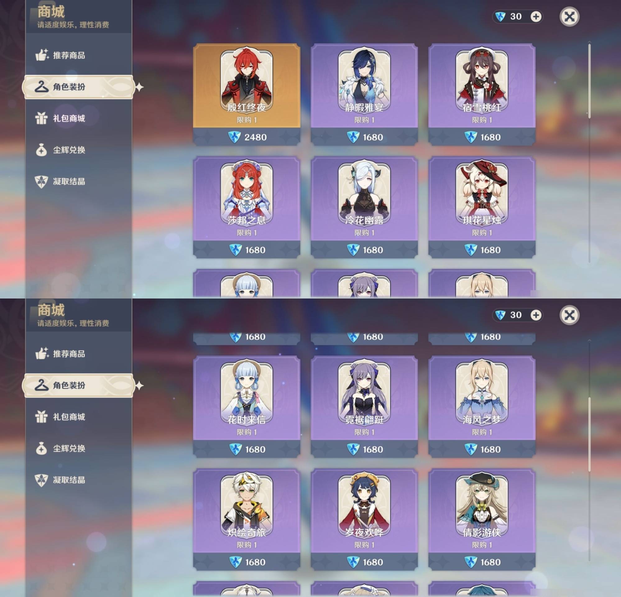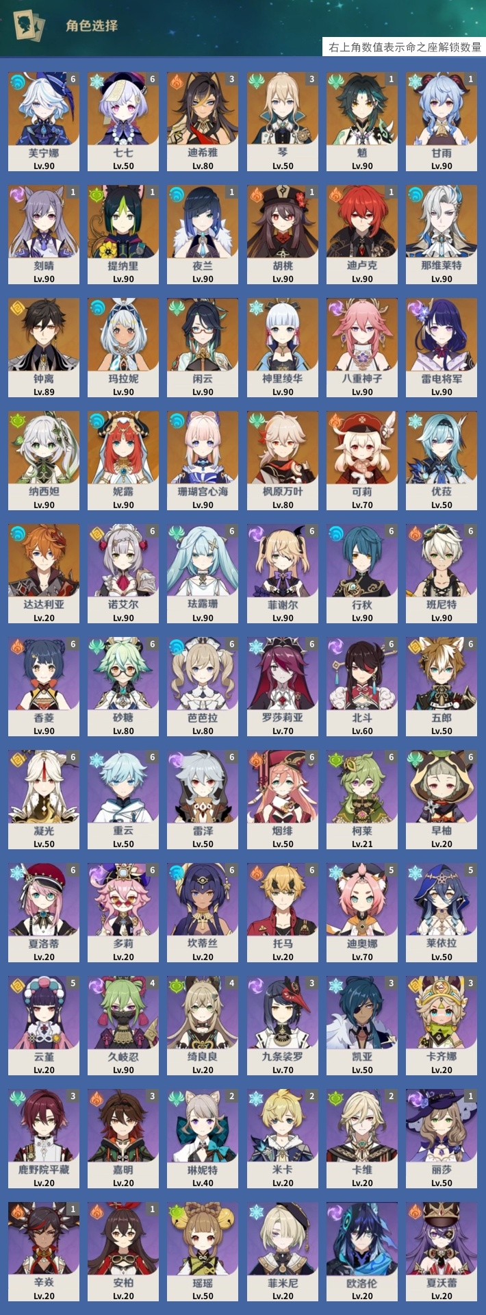 [14007362]66黄 风系:0命闲云/1命魈/0命枫原万叶/3命琴 火系:1命胡桃/1命迪卢克/3命迪希雅/0命可莉 水系:0命玛拉妮/0命妮露/1命夜兰/0命珊瑚宫心海/0命达达利亚/6命芙宁娜/0命那维莱特 冰系:1命甘雨/0命神里绫华/0命优菈/6命七七 岩系:0命钟离 雷系:0命八重神子/0命雷电将军/1命刻晴 草系:0命纳西妲/1命提纳里 [四星角色等级及命座] 风系: 6命珐露珊/6命砂糖/2命琳妮特/3命鹿野院平藏/6命早柚 火系: 6命班尼特/6命香菱/6命烟绯/3命嘉明/0命夏沃蕾/6命托马/1命辛焱/1命安柏 水系:6命行秋/6命芭芭拉/6命坎蒂丝 冰系:6命罗莎莉亚/5命迪奥娜/5命莱依拉/6命重云/3命凯亚/6命夏洛蒂/0命菲米尼/2命米卡 岩系:6命诺艾尔/6命五郎/6命凝光/5命云堇 雷系:4命久岐忍/6命菲谢尔/3命九条裟罗/6命北斗/6命雷泽/1命丽莎/6命多莉/0命欧洛伦 草系:0命瑶瑶/6命柯莱/2命卡维/4命绮良良