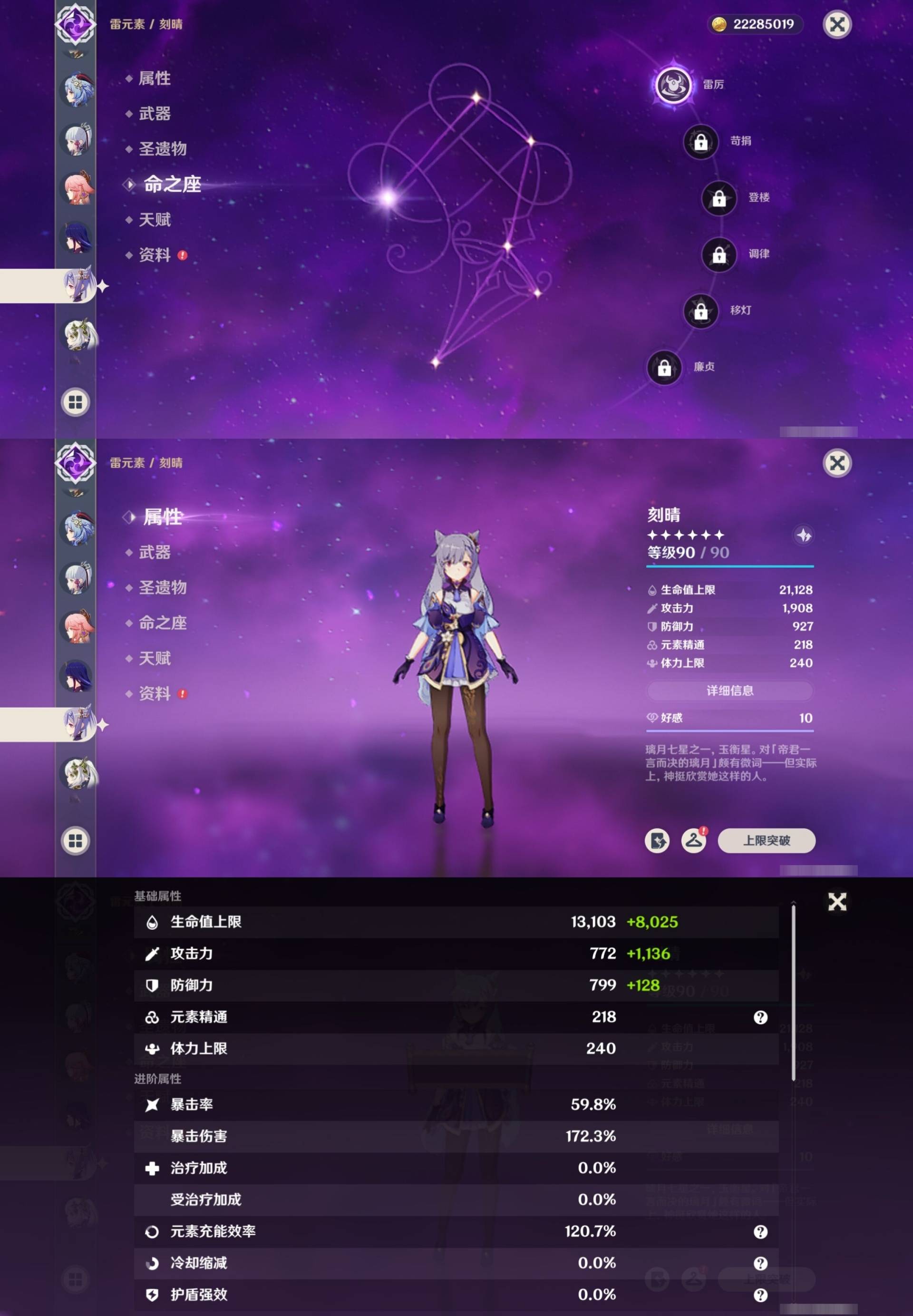 [14007379]66黄 风系:0命闲云/1命魈/0命枫原万叶/3命琴 火系:1命胡桃/1命迪卢克/3命迪希雅/0命可莉 水系:0命玛拉妮/0命妮露/1命夜兰/0命珊瑚宫心海/0命达达利亚/6命芙宁娜/0命那维莱特 冰系:1命甘雨/0命神里绫华/0命优菈/6命七七 岩系:0命钟离 雷系:0命八重神子/0命雷电将军/1命刻晴 草系:0命纳西妲/1命提纳里 [四星角色等级及命座] 风系: 6命珐露珊/6命砂糖/2命琳妮特/3命鹿野院平藏/6命早柚 火系: 6命班尼特/6命香菱/6命烟绯/3命嘉明/0命夏沃蕾/6命托马/1命辛焱/1命安柏 水系:6命行秋/6命芭芭拉/6命坎蒂丝 冰系:6命罗莎莉亚/5命迪奥娜/5命莱依拉/6命重云/3命凯亚/6命夏洛蒂/0命菲米尼/2命米卡 岩系:6命诺艾尔/6命五郎/6命凝光/5命云堇 雷系:4命久岐忍/6命菲谢尔/3命九条裟罗/6命北斗/6命雷泽/1命丽莎/6命多莉/0命欧洛伦 草系:0命瑶瑶/6命柯莱/2命卡维/4命绮良良