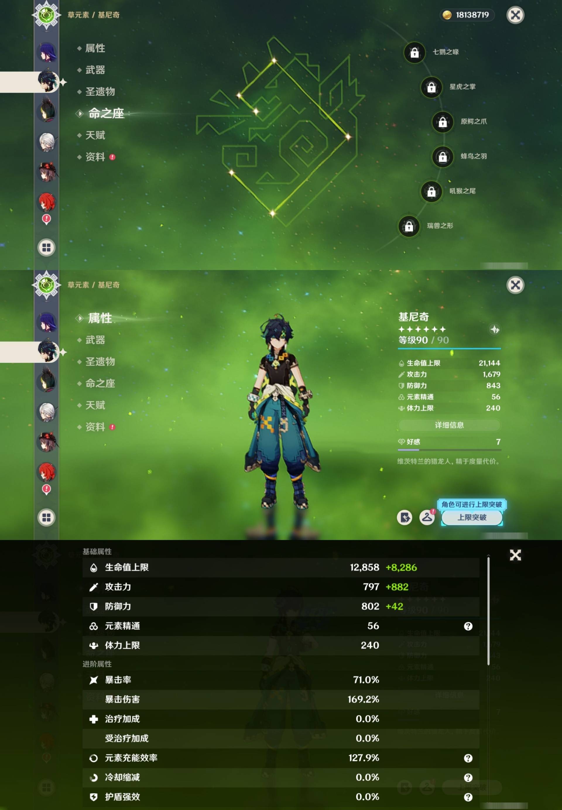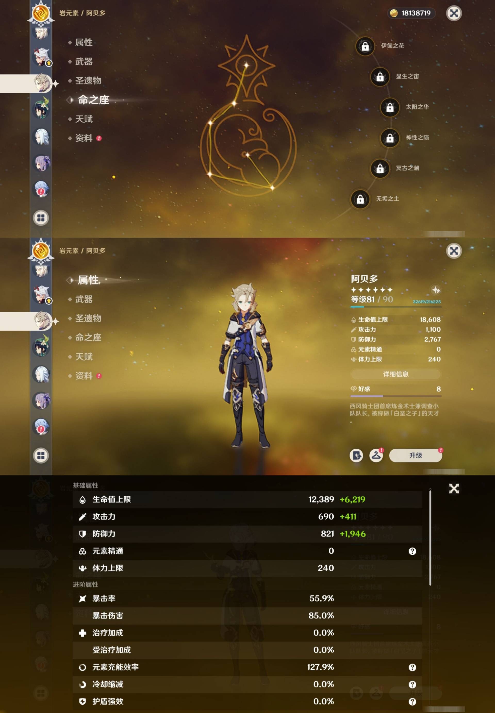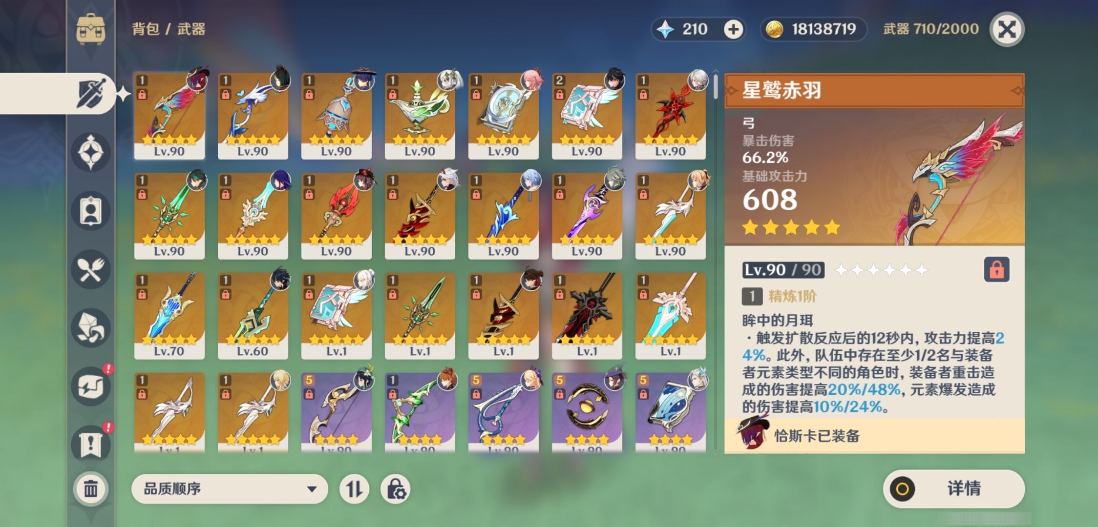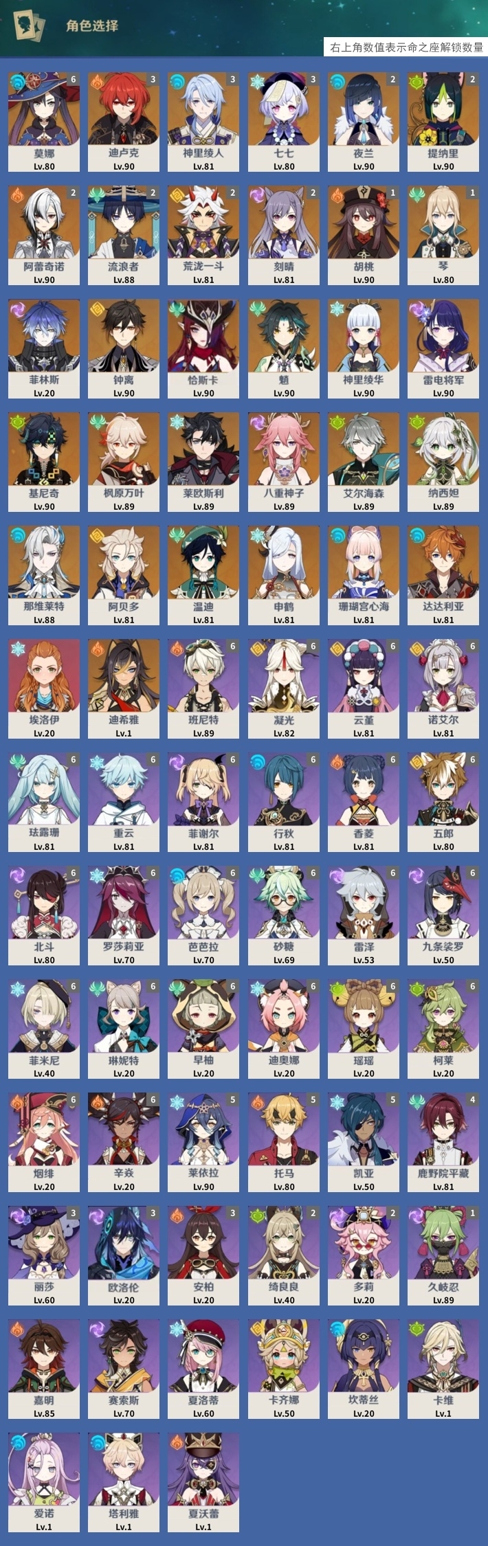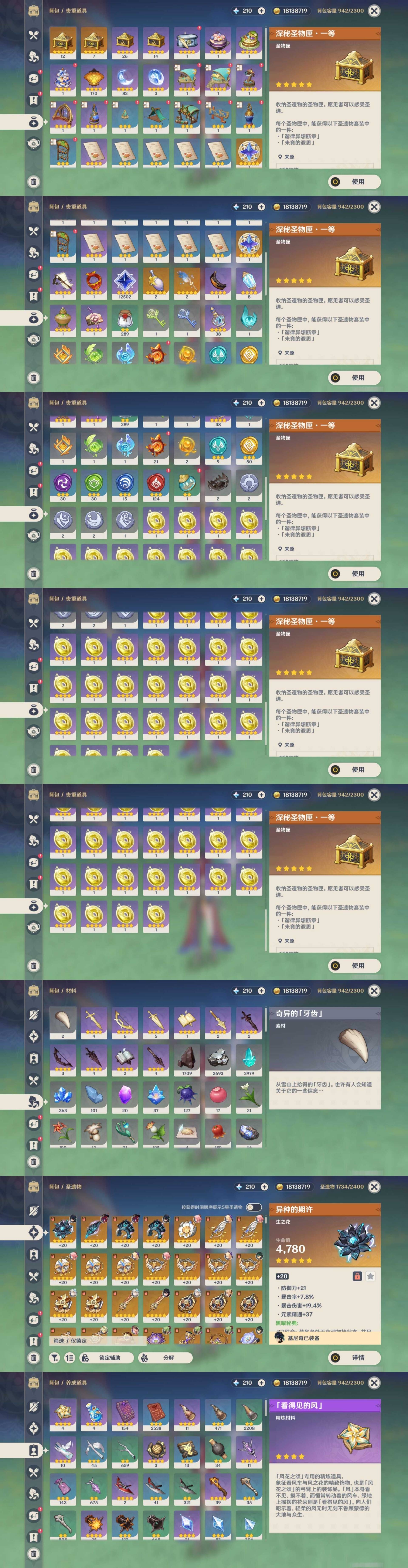[14007517]84黄 风系:0命恰斯卡/0命魈/0命枫原万叶/2命流浪者/0命温迪/1命琴 火系:2命阿蕾奇诺/1命胡桃/3命迪卢克/0命迪希雅 水系:0命那维莱特/3命神里绫人/0命珊瑚宫心海/0命达达利亚/6命莫娜/2命夜兰 冰系:0命神里绫华/0命莱欧斯利/0命申鹤/3命七七/0命埃洛伊 岩系:2命荒泷一斗/0命阿贝多/0命钟离 雷系:0命雷电将军/0命八重神子/2命刻晴/0命菲林斯 草系:0命基尼奇/2命提纳里/0命艾尔海森/0命纳西妲 [四星角色等级及命座] 风系: 6命珐露珊/4命鹿野院平藏/6命砂糖/6命琳妮特/6命早柚 火系: 6命班尼特/0命嘉明/6命香菱/5命托马/6命烟绯/6命辛焱/3命安柏/0命夏沃蕾 水系:6命行秋/6命芭芭拉/0命坎蒂丝/0命爱诺/0命塔利雅 冰系:5命莱依拉/6命重云/6命罗莎莉亚/0命夏洛蒂/5命凯亚/6命菲米尼/6命迪奥娜 岩系:6命凝光/6命云堇/6命诺艾尔/6命五郎 雷系:1命久岐忍/6命菲谢尔/6命北斗/0命赛索斯/3命丽莎/6命雷泽/6命九条裟罗/2命多莉/3命欧洛伦 草系:2命绮良良/6命瑶瑶/6命柯莱/0命卡维 [角色经验书] 紫色154/蓝色2538 [小物品] 脆弱树脂83/异梦溶媒8/嬗变之尘289 [特殊材料] 东风之爪7/东风的吐息10/北风之环2/北风的魂匣3/吞天之鲸·只角6/武炼之魂·孤影5/龙王之冕15 血玉之枝/鎏金之鳞10/智识之冕11 [神瞳剩余数量] 风神瞳1/岩神瞳1/草神瞳1