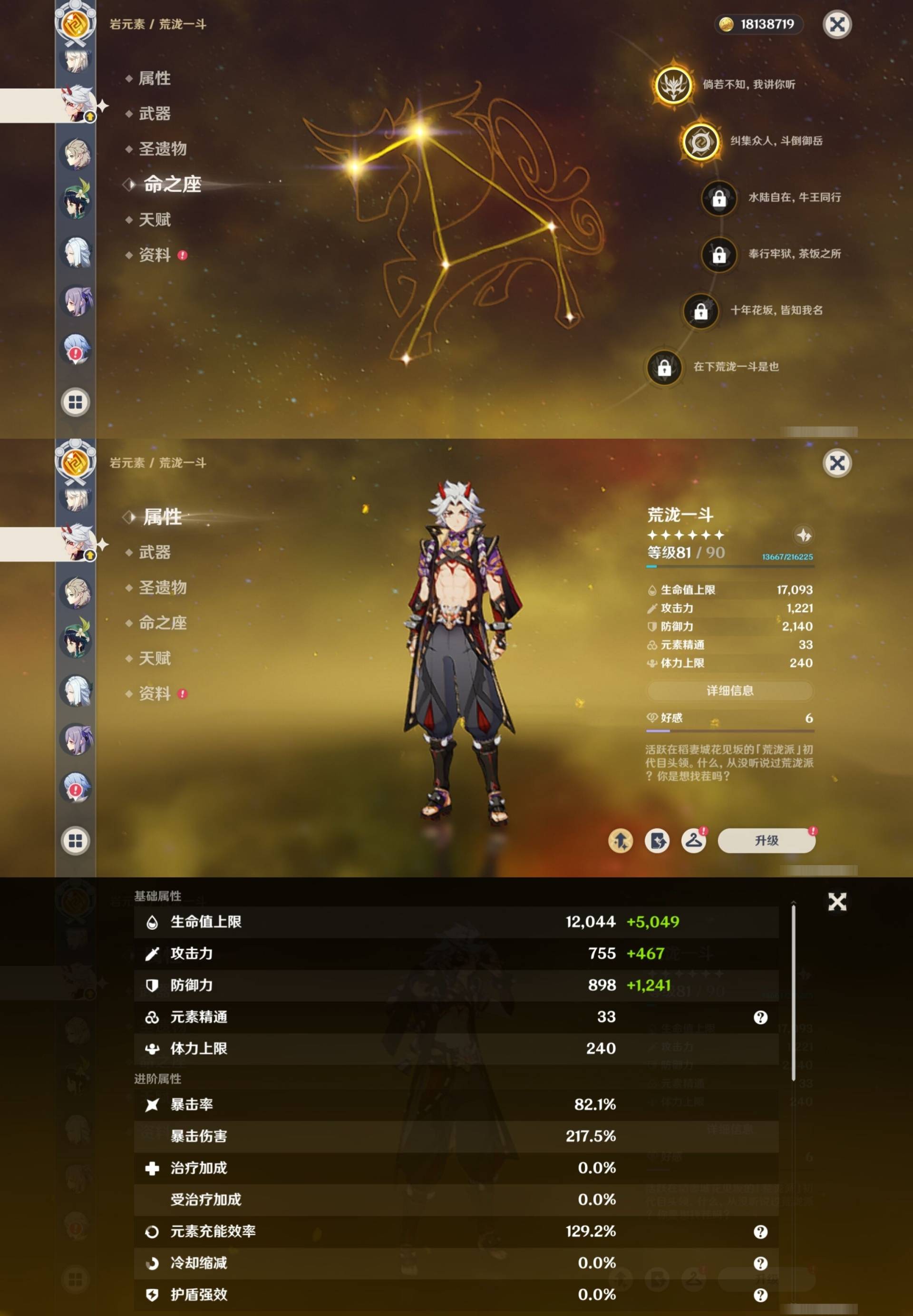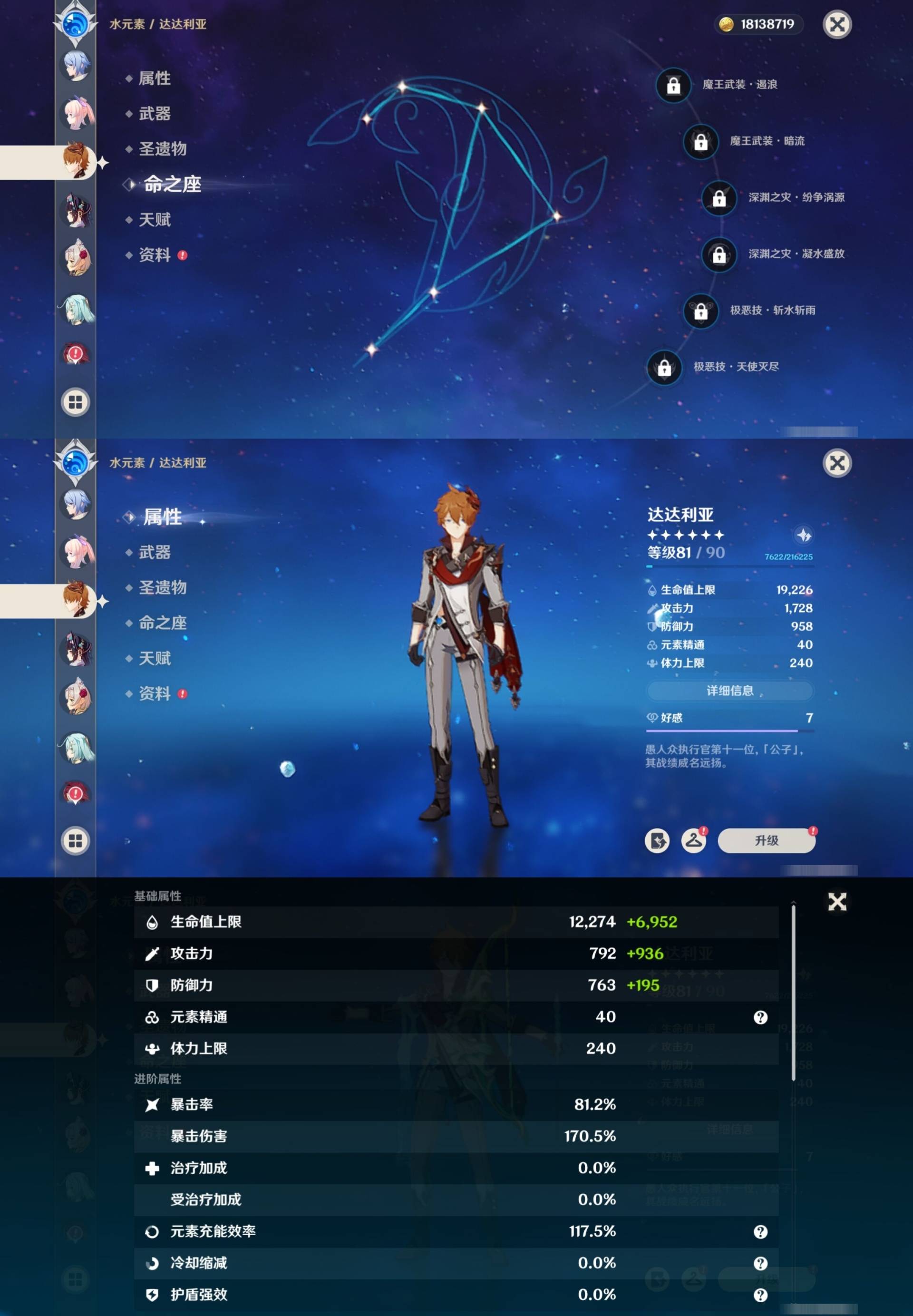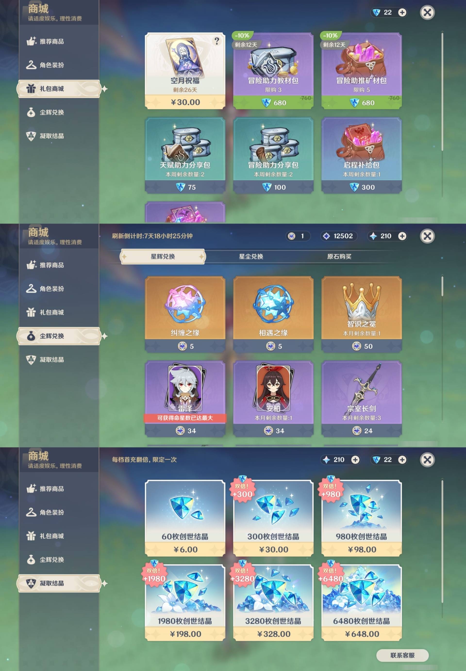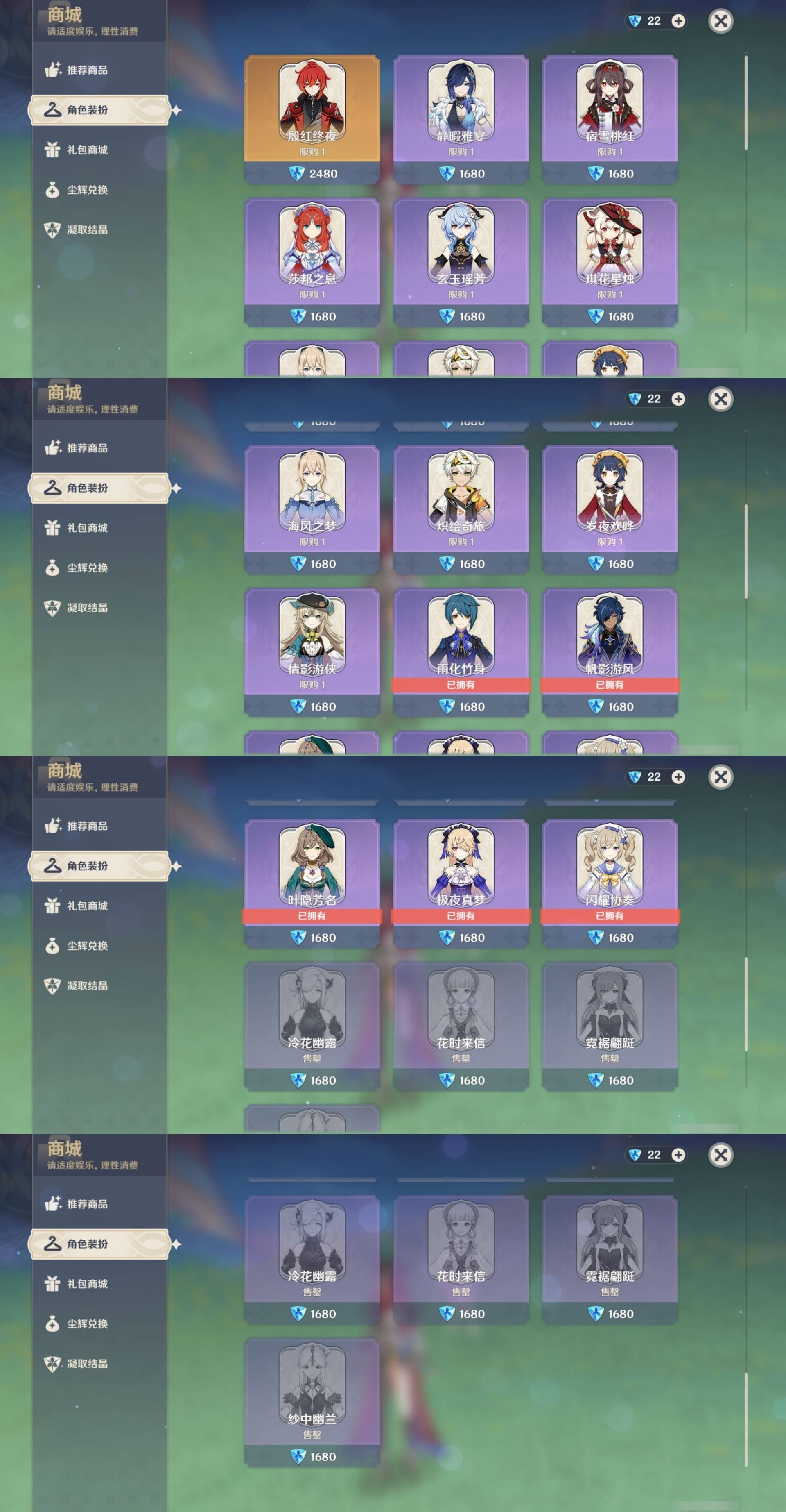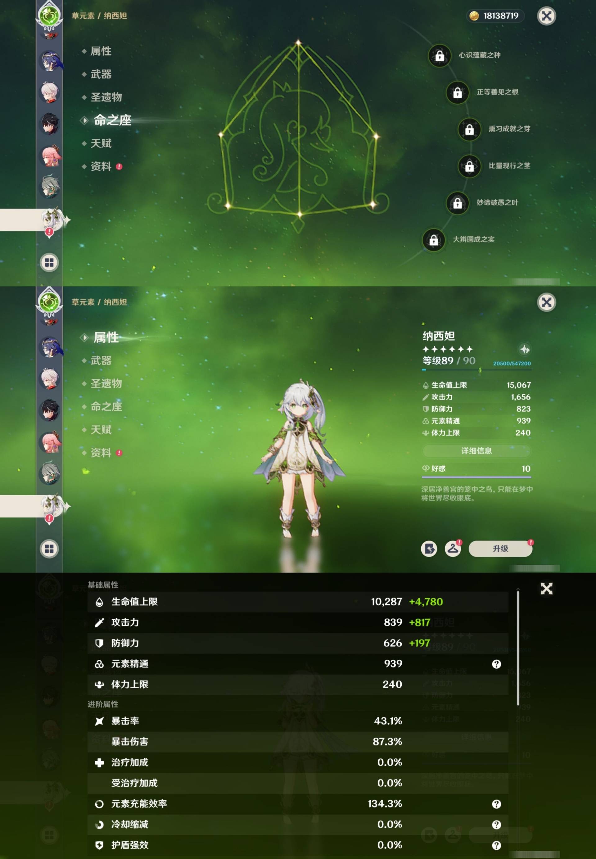 [14007517]84黄 风系:0命恰斯卡/0命魈/0命枫原万叶/2命流浪者/0命温迪/1命琴 火系:2命阿蕾奇诺/1命胡桃/3命迪卢克/0命迪希雅 水系:0命那维莱特/3命神里绫人/0命珊瑚宫心海/0命达达利亚/6命莫娜/2命夜兰 冰系:0命神里绫华/0命莱欧斯利/0命申鹤/3命七七/0命埃洛伊 岩系:2命荒泷一斗/0命阿贝多/0命钟离 雷系:0命雷电将军/0命八重神子/2命刻晴/0命菲林斯 草系:0命基尼奇/2命提纳里/0命艾尔海森/0命纳西妲 [四星角色等级及命座] 风系: 6命珐露珊/4命鹿野院平藏/6命砂糖/6命琳妮特/6命早柚 火系: 6命班尼特/0命嘉明/6命香菱/5命托马/6命烟绯/6命辛焱/3命安柏/0命夏沃蕾 水系:6命行秋/6命芭芭拉/0命坎蒂丝/0命爱诺/0命塔利雅 冰系:5命莱依拉/6命重云/6命罗莎莉亚/0命夏洛蒂/5命凯亚/6命菲米尼/6命迪奥娜 岩系:6命凝光/6命云堇/6命诺艾尔/6命五郎 雷系:1命久岐忍/6命菲谢尔/6命北斗/0命赛索斯/3命丽莎/6命雷泽/6命九条裟罗/2命多莉/3命欧洛伦 草系:2命绮良良/6命瑶瑶/6命柯莱/0命卡维 [角色经验书] 紫色154/蓝色2538 [小物品] 脆弱树脂83/异梦溶媒8/嬗变之尘289 [特殊材料] 东风之爪7/东风的吐息10/北风之环2/北风的魂匣3/吞天之鲸·只角6/武炼之魂·孤影5/龙王之冕15 血玉之枝/鎏金之鳞10/智识之冕11 [神瞳剩余数量] 风神瞳1/岩神瞳1/草神瞳1