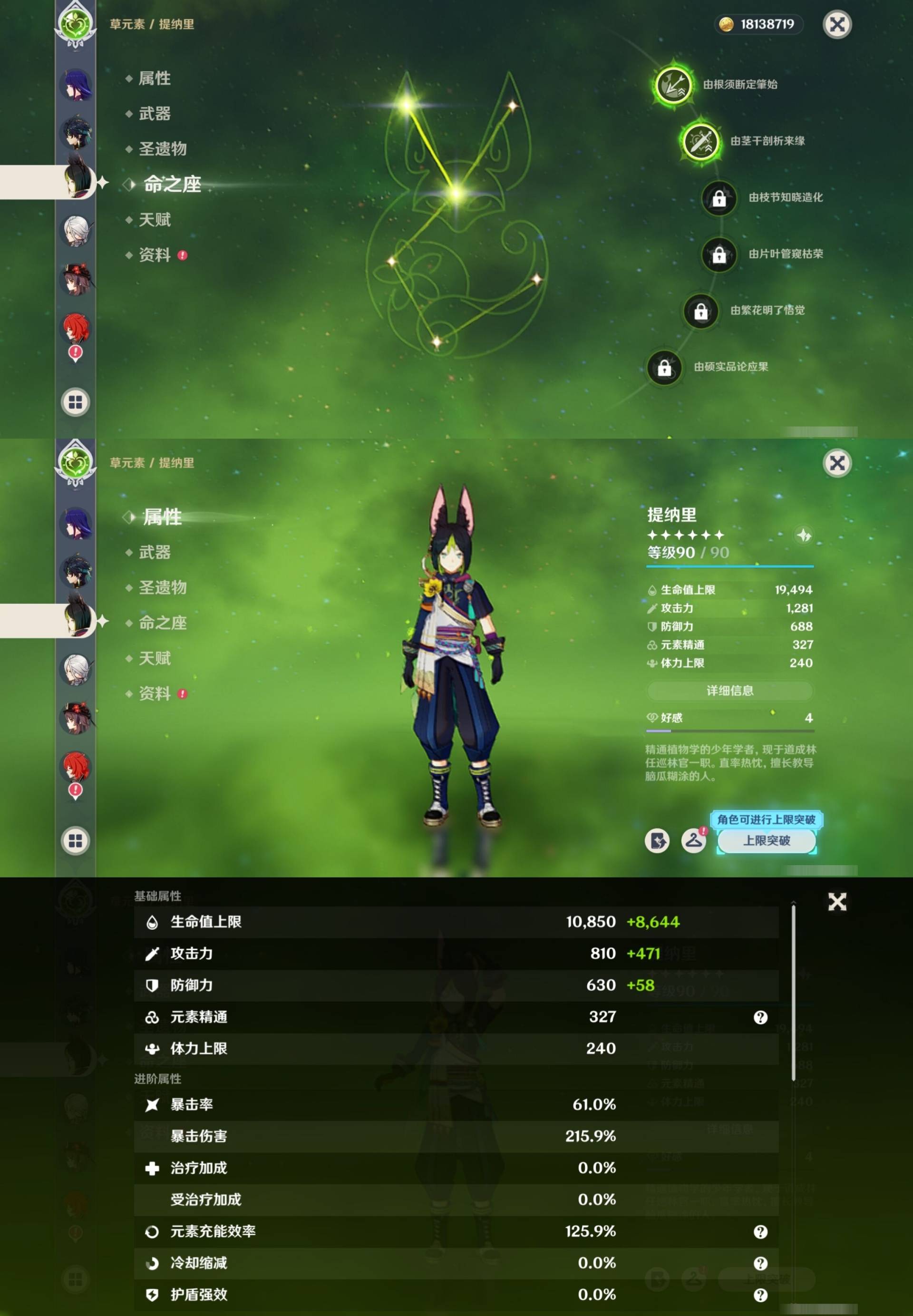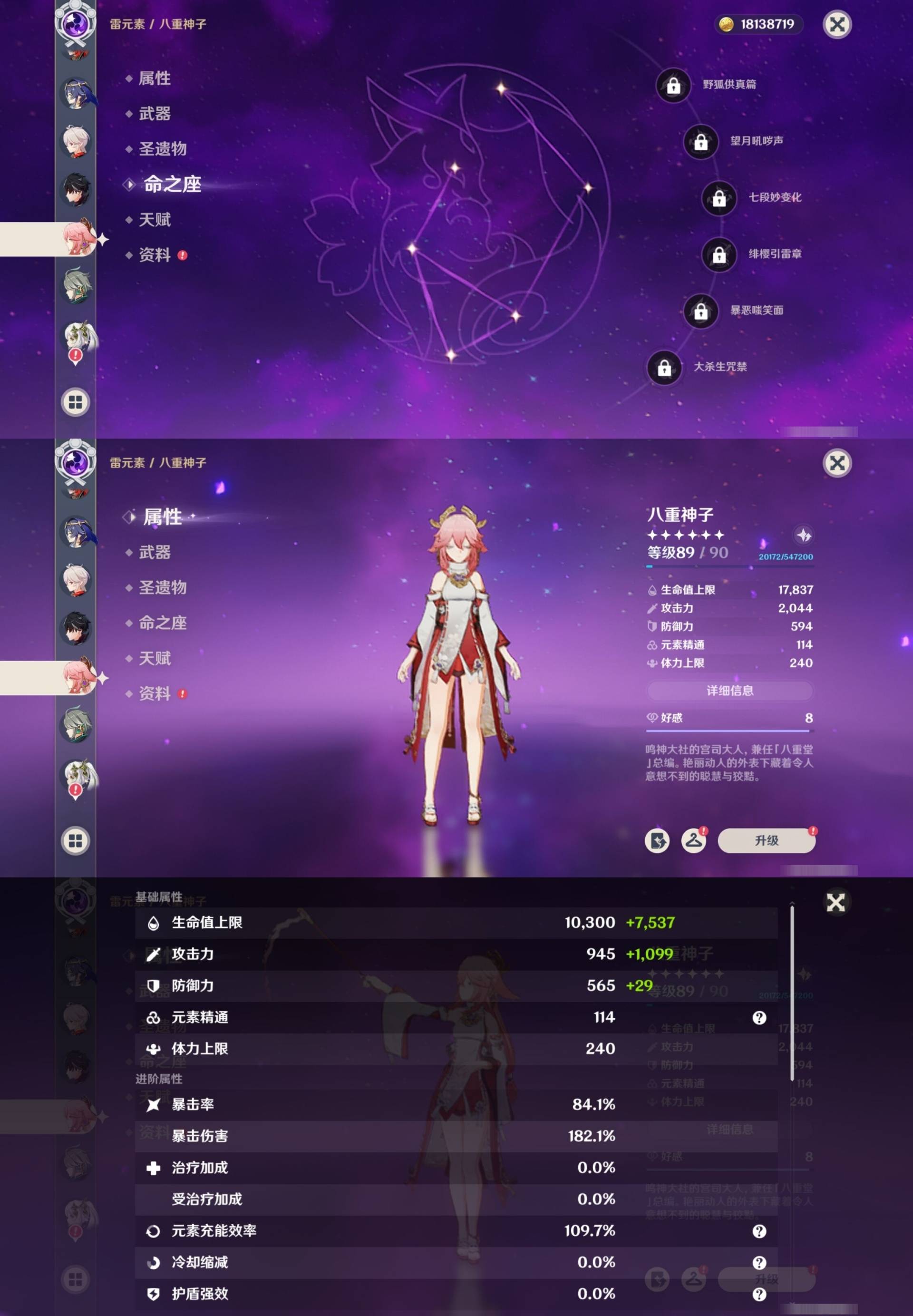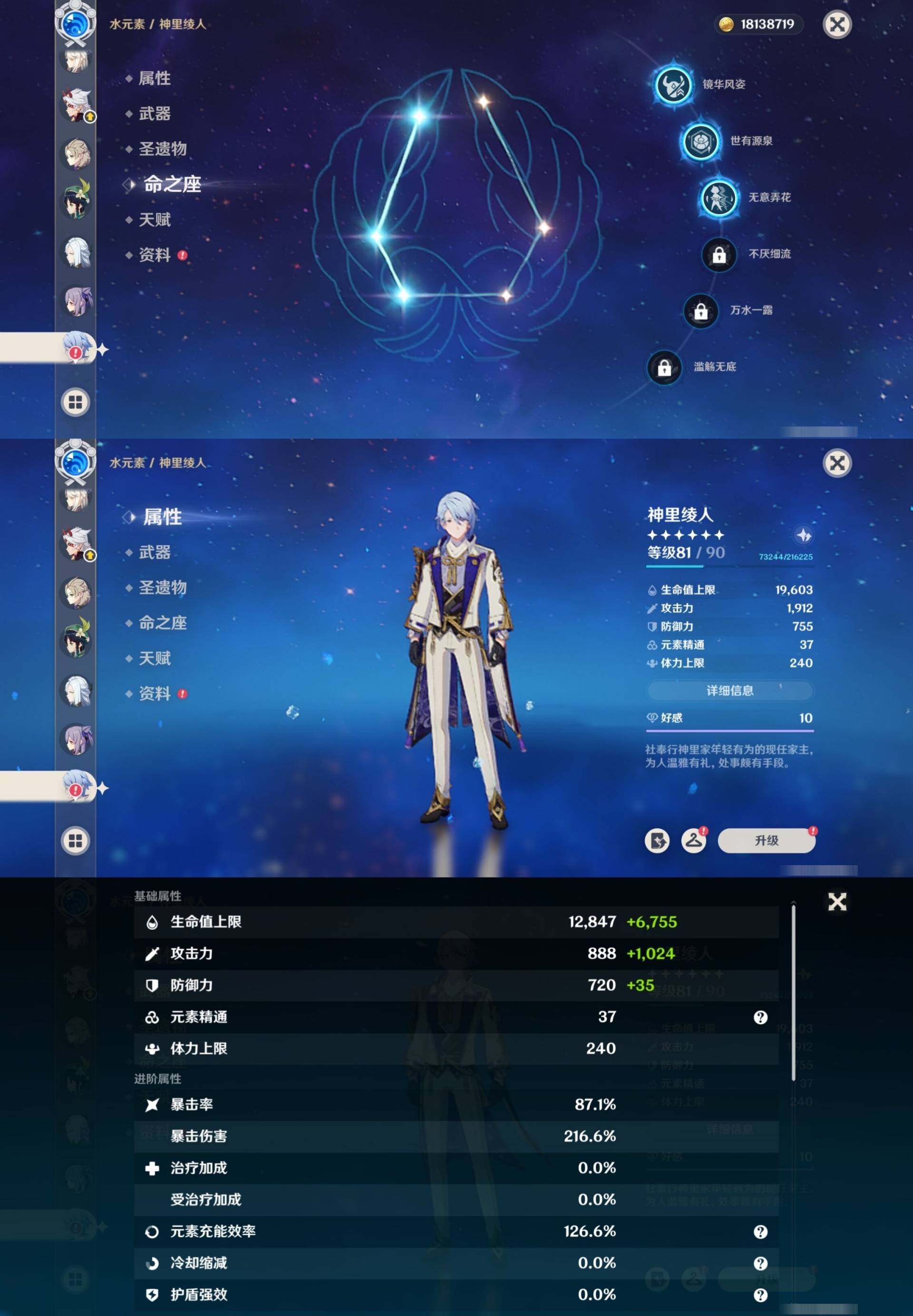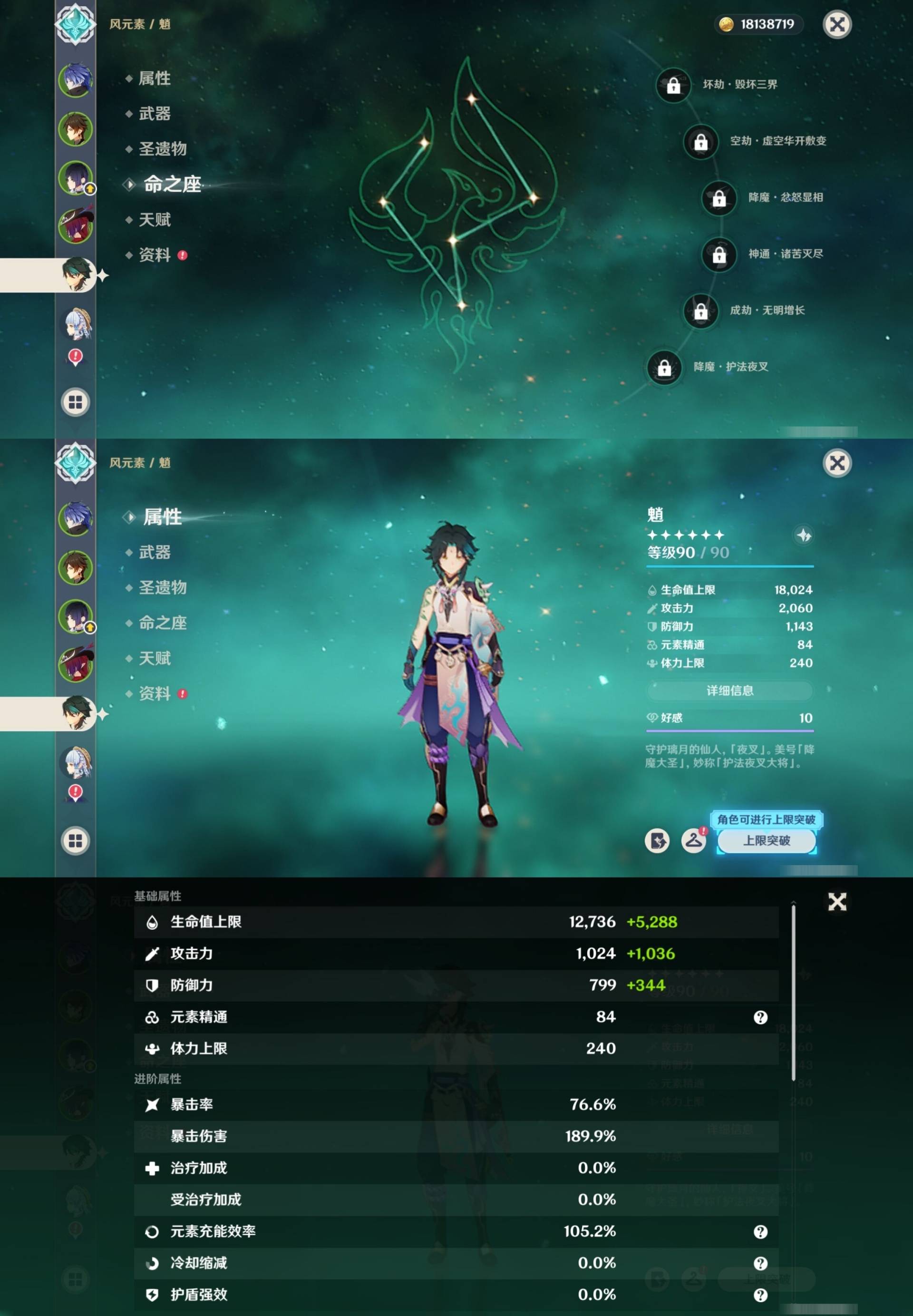 [14007517]84黄 风系:0命恰斯卡/0命魈/0命枫原万叶/2命流浪者/0命温迪/1命琴 火系:2命阿蕾奇诺/1命胡桃/3命迪卢克/0命迪希雅 水系:0命那维莱特/3命神里绫人/0命珊瑚宫心海/0命达达利亚/6命莫娜/2命夜兰 冰系:0命神里绫华/0命莱欧斯利/0命申鹤/3命七七/0命埃洛伊 岩系:2命荒泷一斗/0命阿贝多/0命钟离 雷系:0命雷电将军/0命八重神子/2命刻晴/0命菲林斯 草系:0命基尼奇/2命提纳里/0命艾尔海森/0命纳西妲 [四星角色等级及命座] 风系: 6命珐露珊/4命鹿野院平藏/6命砂糖/6命琳妮特/6命早柚 火系: 6命班尼特/0命嘉明/6命香菱/5命托马/6命烟绯/6命辛焱/3命安柏/0命夏沃蕾 水系:6命行秋/6命芭芭拉/0命坎蒂丝/0命爱诺/0命塔利雅 冰系:5命莱依拉/6命重云/6命罗莎莉亚/0命夏洛蒂/5命凯亚/6命菲米尼/6命迪奥娜 岩系:6命凝光/6命云堇/6命诺艾尔/6命五郎 雷系:1命久岐忍/6命菲谢尔/6命北斗/0命赛索斯/3命丽莎/6命雷泽/6命九条裟罗/2命多莉/3命欧洛伦 草系:2命绮良良/6命瑶瑶/6命柯莱/0命卡维 [角色经验书] 紫色154/蓝色2538 [小物品] 脆弱树脂83/异梦溶媒8/嬗变之尘289 [特殊材料] 东风之爪7/东风的吐息10/北风之环2/北风的魂匣3/吞天之鲸·只角6/武炼之魂·孤影5/龙王之冕15 血玉之枝/鎏金之鳞10/智识之冕11 [神瞳剩余数量] 风神瞳1/岩神瞳1/草神瞳1