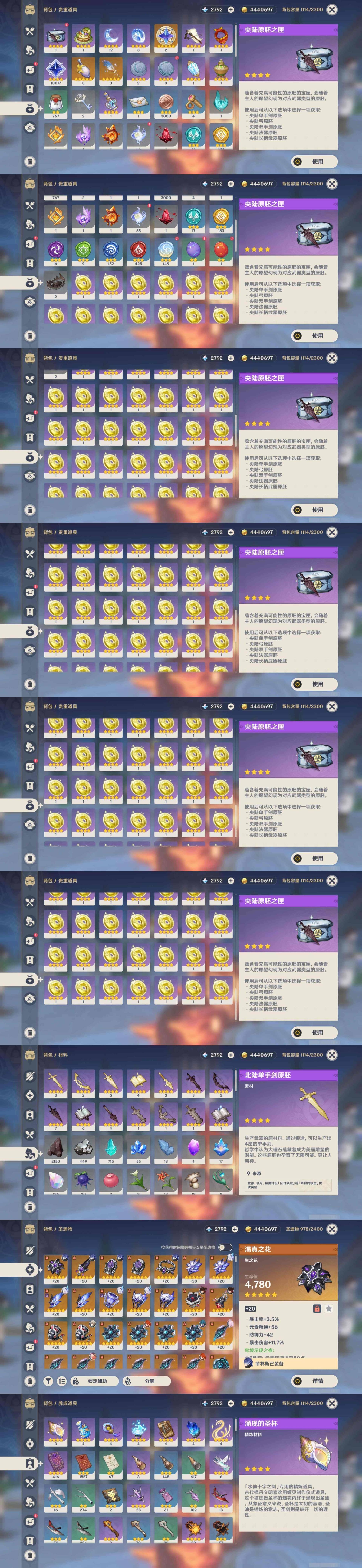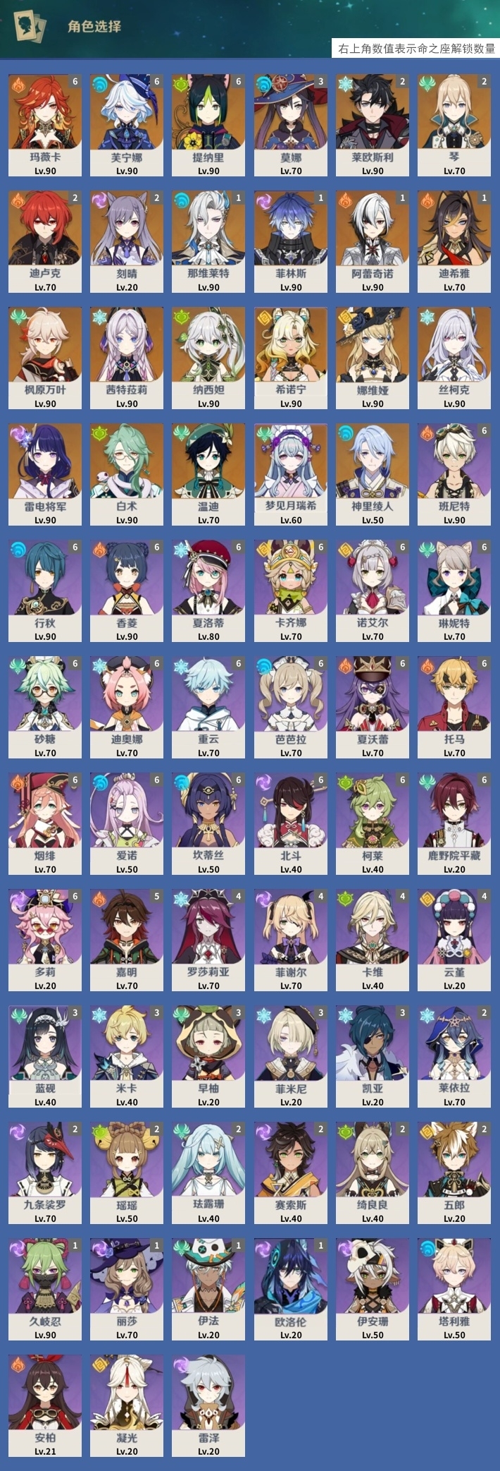 [14007593]86黄 风:0命枫原万叶,0命温迪,2命琴,0命梦见月瑞希 火:6命玛薇卡,1命阿蕾奇诺,1命迪希雅,2命迪卢克 水:6命芙宁娜,1命那维莱特,3命莫娜,0命神里绫人 冰:0命茜特菈莉,0命丝柯克,2命莱欧斯利 岩:0命希诺宁,0命娜维娅 雷:1命菲林斯,0命雷电将军,2命刻晴 草:6命提纳里,0命纳西妲,0命白术 弓:精1终末嗟叹之诗,精1天空之翼,精1阿莫斯之弓,精1阿莫斯之弓 法器:精1万世流涌大典,精1金流监督,精1千夜浮梦,精2碧落之珑,精1鹤鸣余音,精4四风原典 单手剑:精1岩峰巡歌,精5静水流涌之辉,精1雾切之回光,精1苍古自由之誓,精1风鹰剑,精1风鹰剑 双手剑:精1焚曜千阳,精1裁断,精1天空之傲,精1山王长牙 长柄武器:精1血染荒城,精1天空之脊 【角色皮肤】 四星角色:班尼特-炽绘奇旅,香菱-岁夜欢哗,绮良良-倩影游侠,行秋-雨化竹身