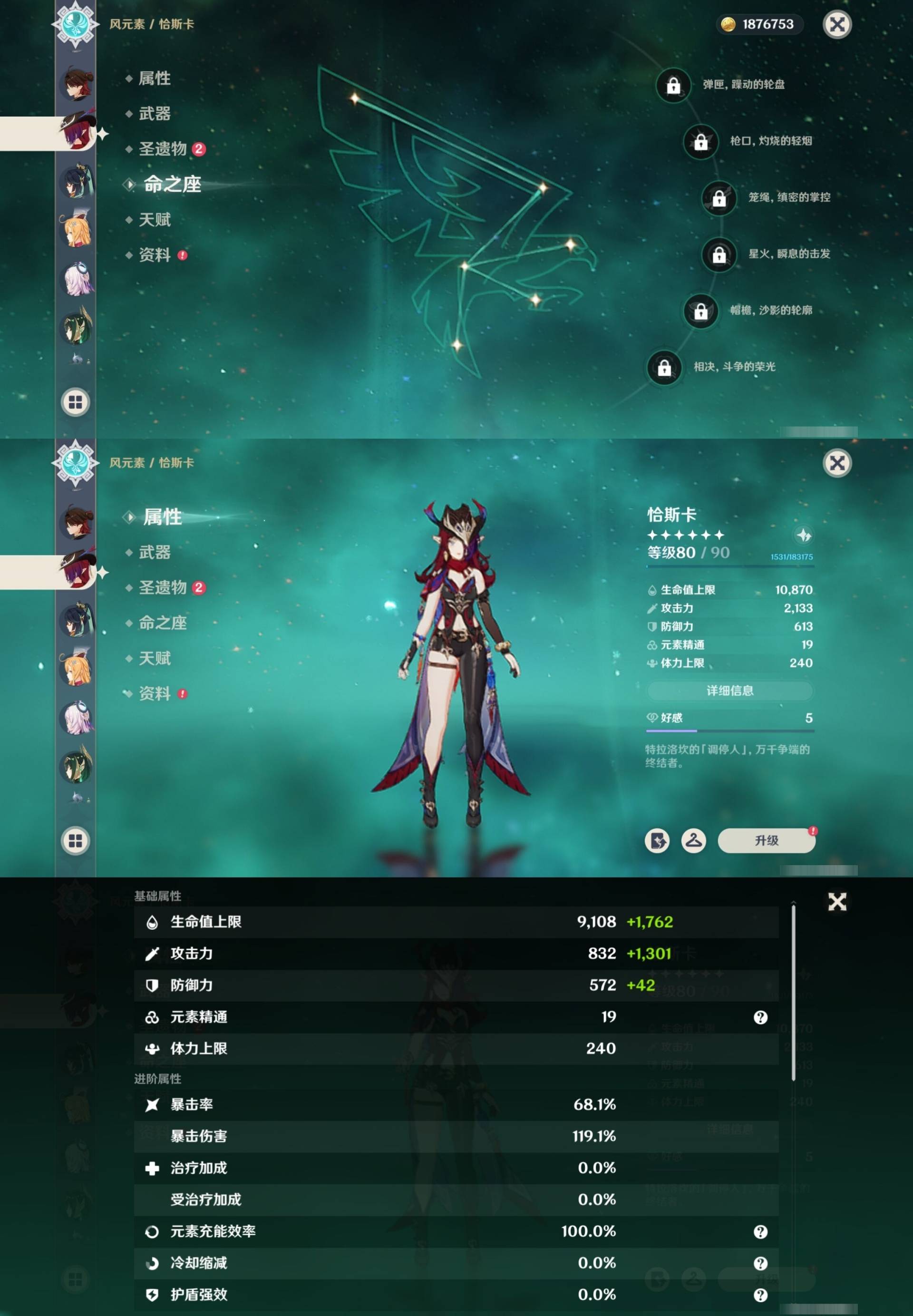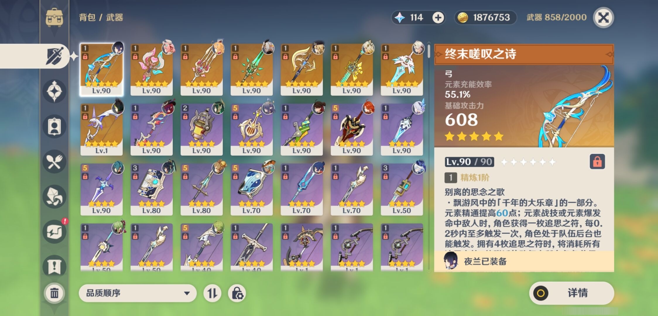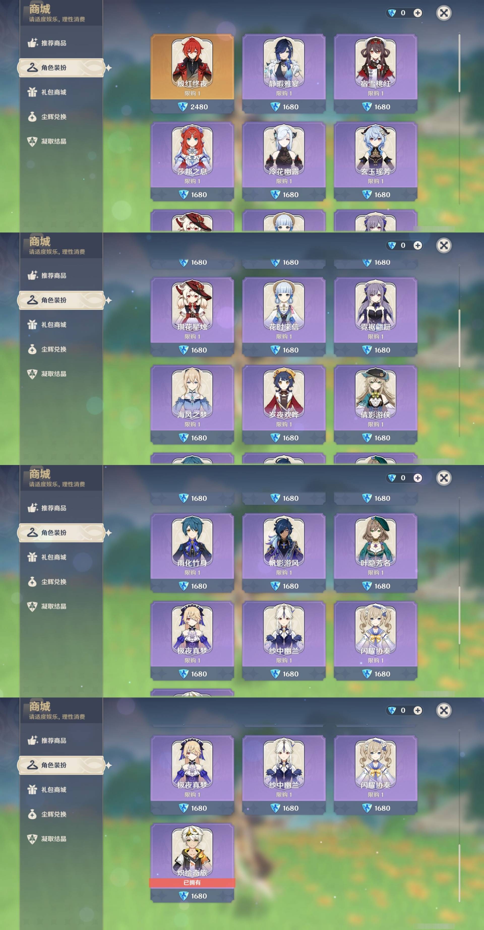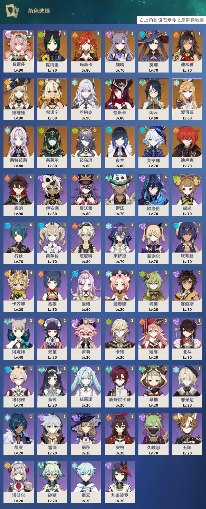 [14011858]40黄 风:0命恰斯卡,0命闲云 火:2命玛薇卡,1命迪希雅,0命迪卢克 水:0命夜兰,0命芙宁娜,1命莫娜 冰:0命丝柯克,0命爱可菲,0命茜特菈莉 岩:0命娜维娅,0命希诺宁 雷:6命瓦雷莎,1命刻晴 草:0命奈芙尔,0命菈乌玛,3命提纳里 弓:精1终末嗟叹之诗,精1阿莫斯之弓 法器:精1溢彩心念 单手剑:精1岩峰巡歌,精1天空之刃 双手剑:精1裁断 长柄武器:精1香韵奏者,精1和璞鸢 【角色皮肤】 四星角色:班尼特-炽绘奇旅