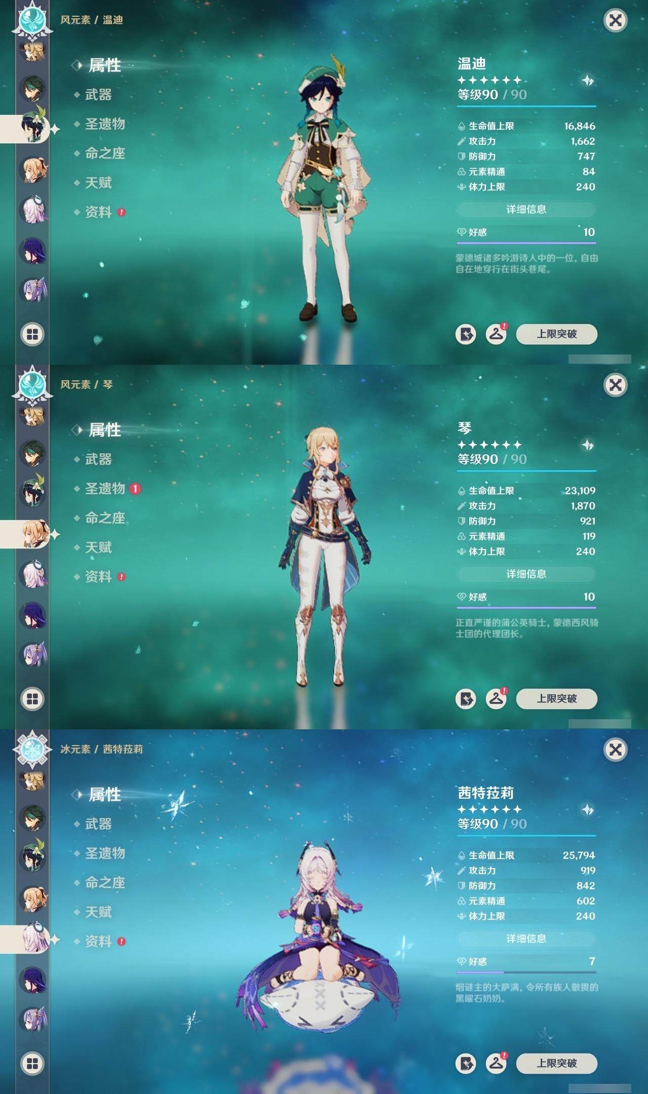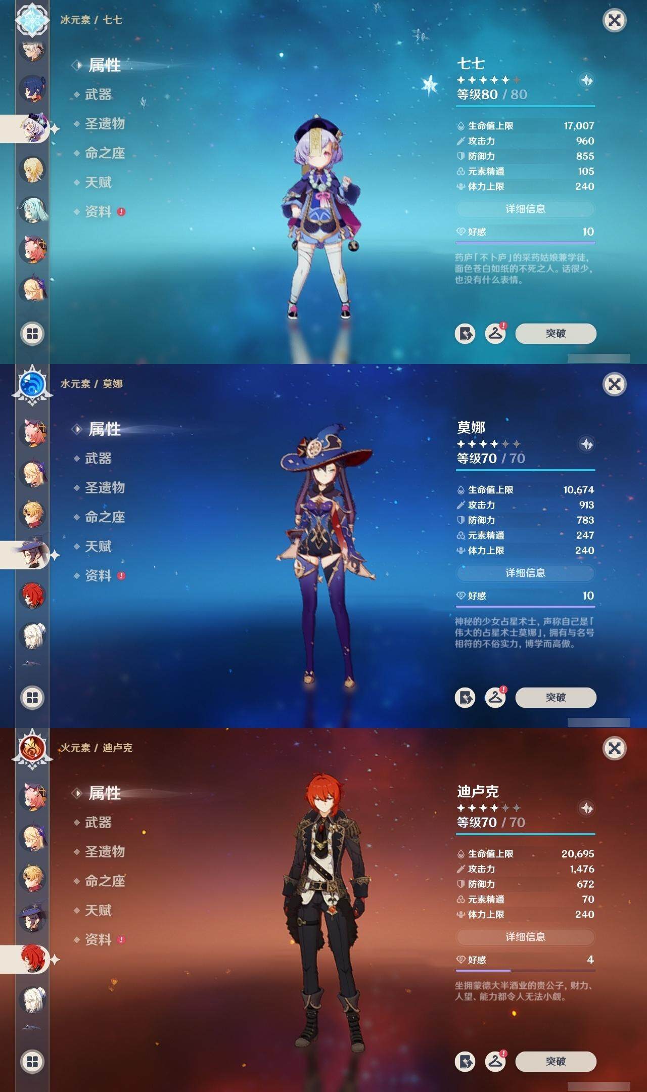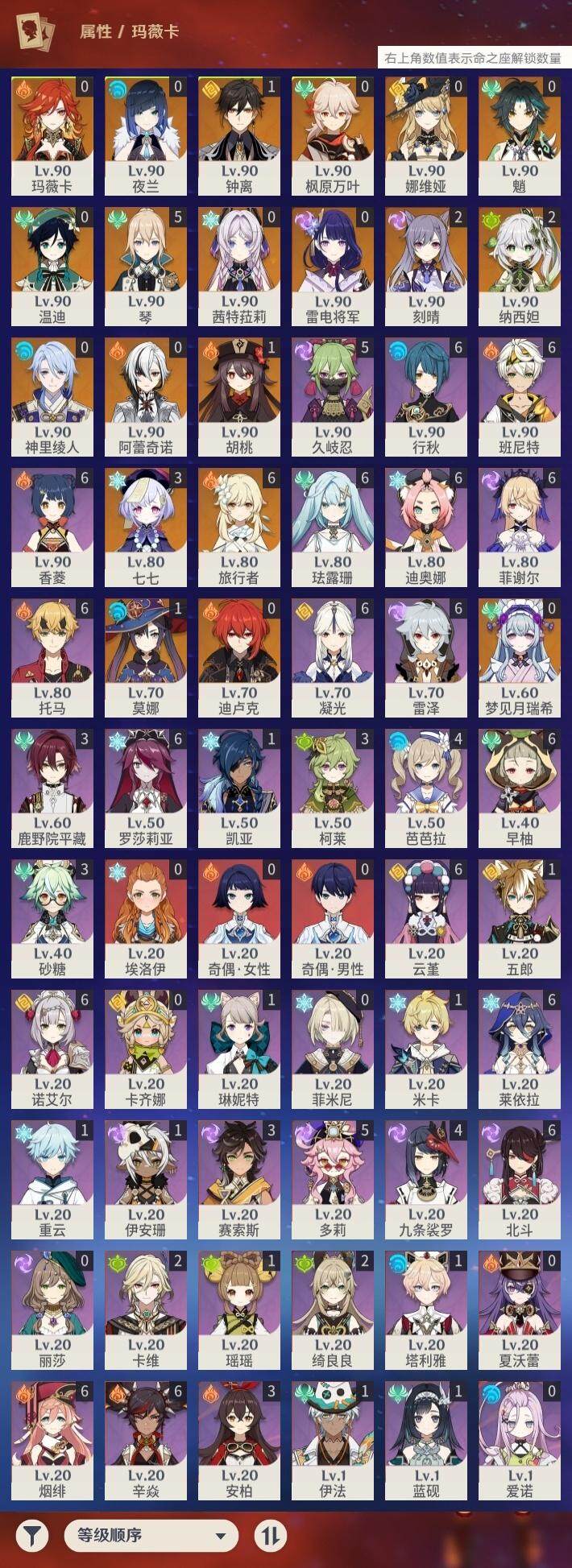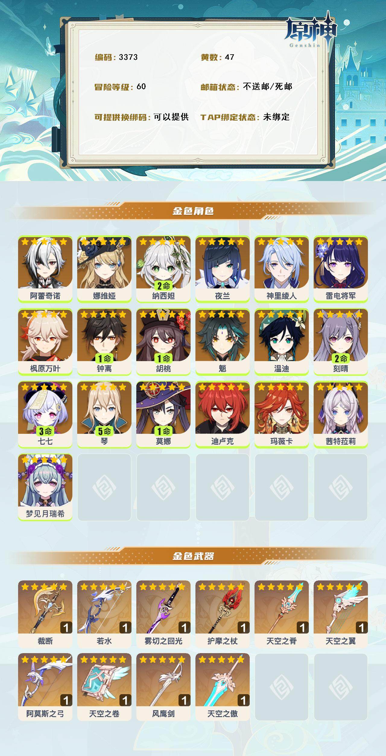 60级/47黄/女主/19个五星角色/13个五星武器 0命阿蕾奇诺0命娜维娅2命纳西妲0命夜兰0命神里绫人0命雷电将军0命枫原万叶1命钟离1命胡桃0命魈0命温迪2命刻晴3命七七5命琴1命莫娜0命迪卢克0命玛薇卡0命茜特菈莉0命梦见月瑞希精1裁断精1若水精1雾切之回光精1护摩之杖精1天空之脊精1天空之翼精1阿莫斯之弓精1天空之卷精1风鹰剑精1天空之傲
