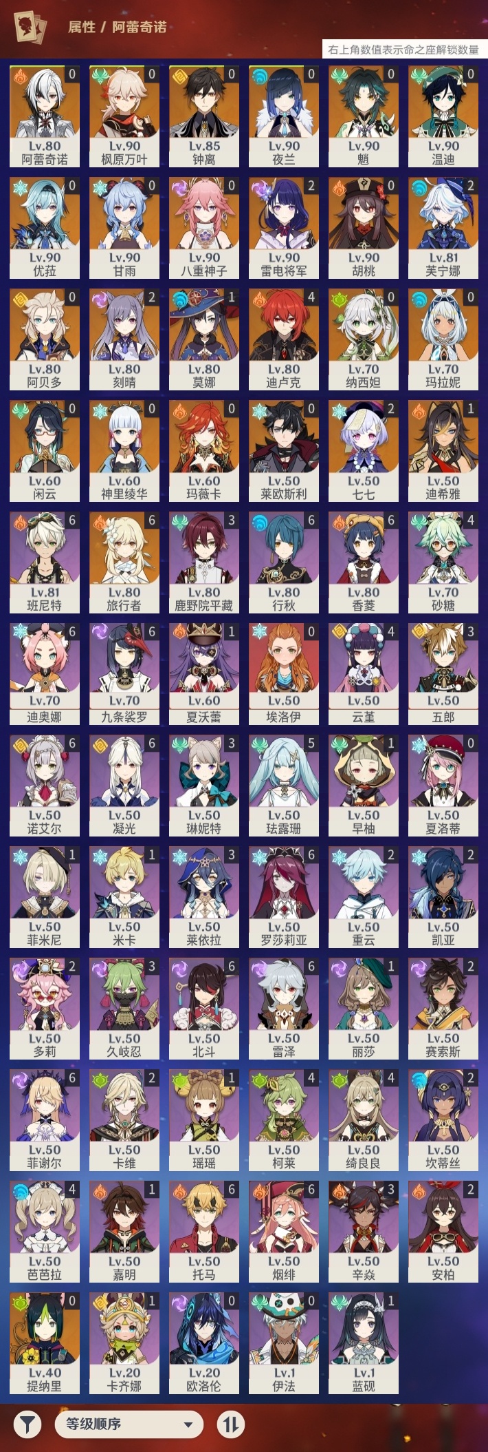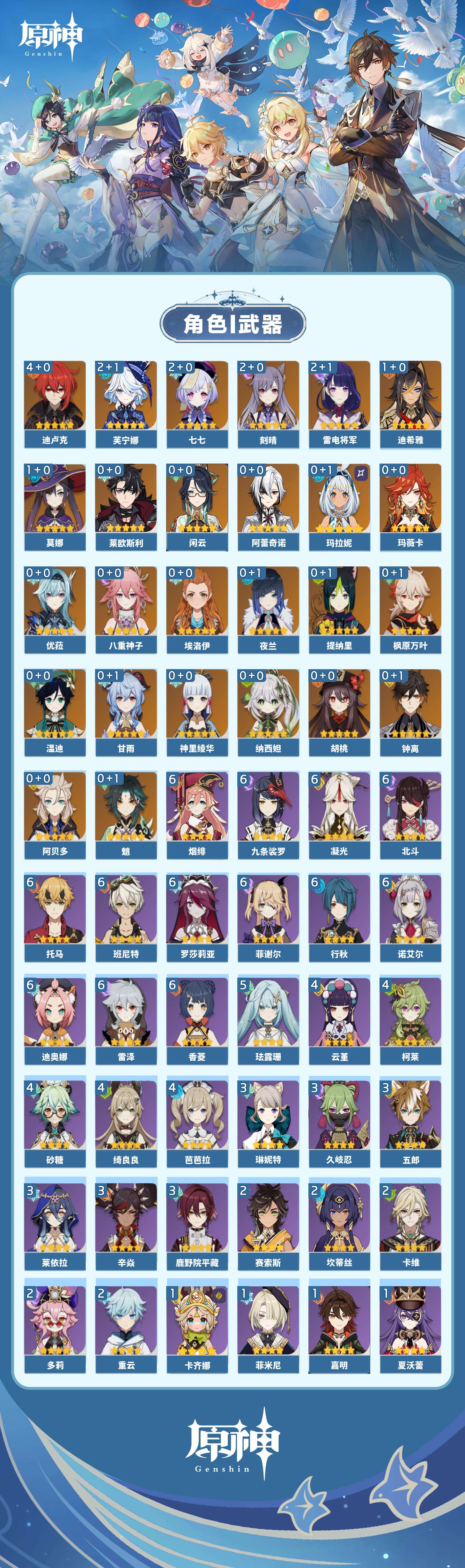 【原神】【lyys8275】冒险等级:59,五星数量:39,五星角色:迪卢克 4命芙宁娜 2命刻晴 2命雷电将军 2命七七 2命迪希雅 1命莫娜 1命玛拉妮神里绫华温迪玛薇卡优菈钟离八重神子阿贝多莱欧斯利夜兰提纳里闲云阿蕾奇诺纳西妲枫原万叶甘雨魈胡桃__五星武器:冲浪时光静水流涌之辉裁叶萃光阿莫斯之弓苍古自由之誓和璞鸢天空之脊天空之卷天空之翼薙草之稻光贯虹之槊若水猎人之径__四星角色:班尼特 6命行秋 6命九条裟罗 6命香菱 6命凝光 6命迪奥娜 6命托马 6命烟绯 6命诺艾尔 6命罗莎莉亚 6命雷泽 6命菲谢尔 6命北斗 6命珐露珊 5命砂糖 4命绮良良 4命柯莱 4命芭芭拉 4命云堇 4命久岐忍 3命鹿野院平藏 3命莱依拉 3命五郎 3命辛焱 3命琳妮特 3命坎蒂丝 2命多莉 2命卡维 2命重云 2命赛索斯 2命卡齐娜 1命瑶瑶 1命米卡 1命蓝砚 1命早柚 1命菲米尼 1命夏沃蕾 1命嘉明 1命埃洛伊欧洛伦夏洛蒂伊法