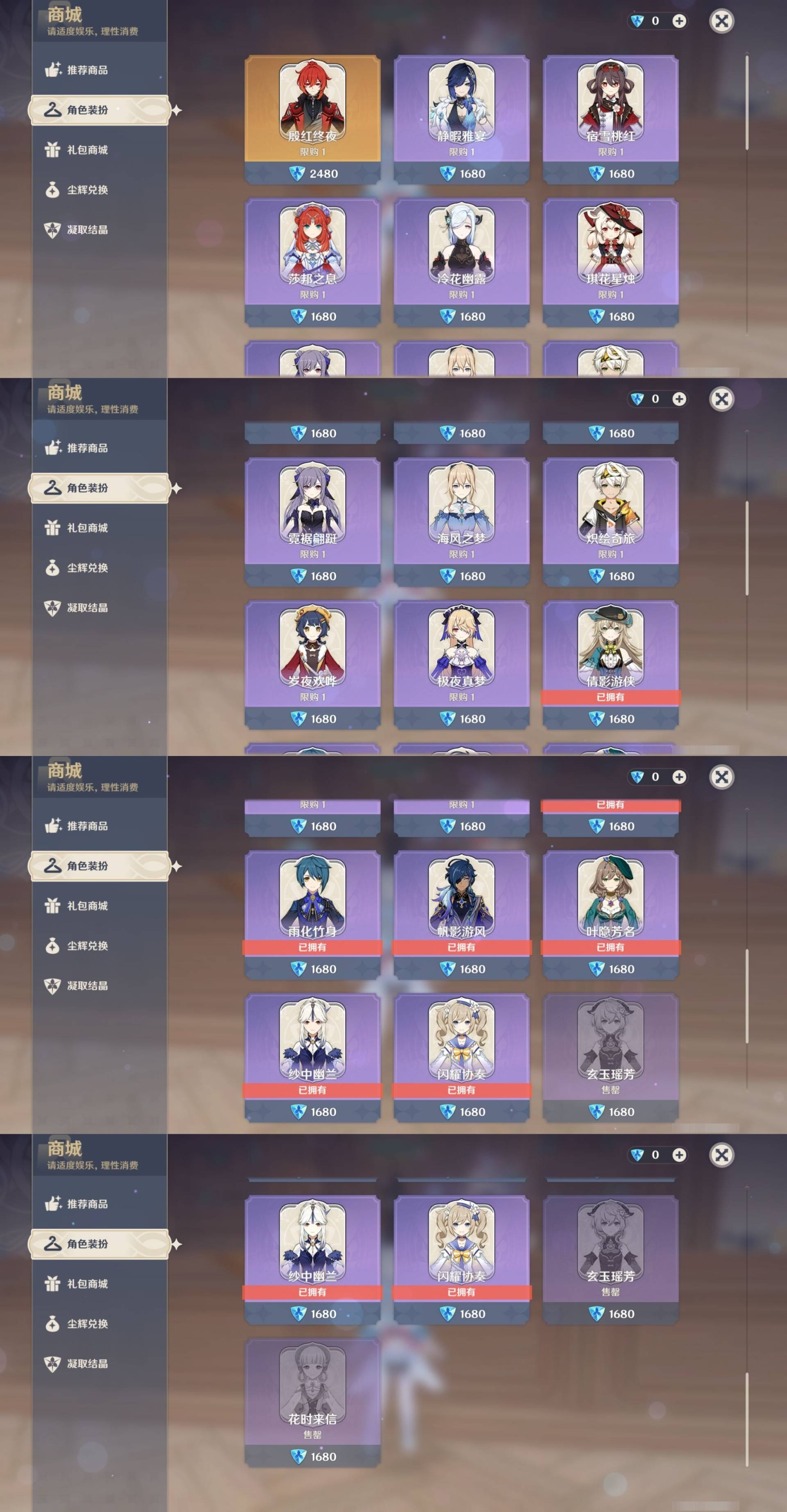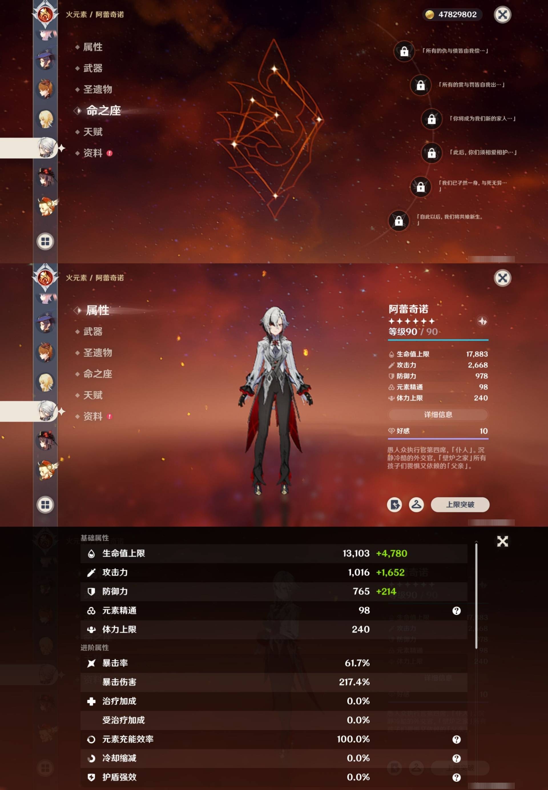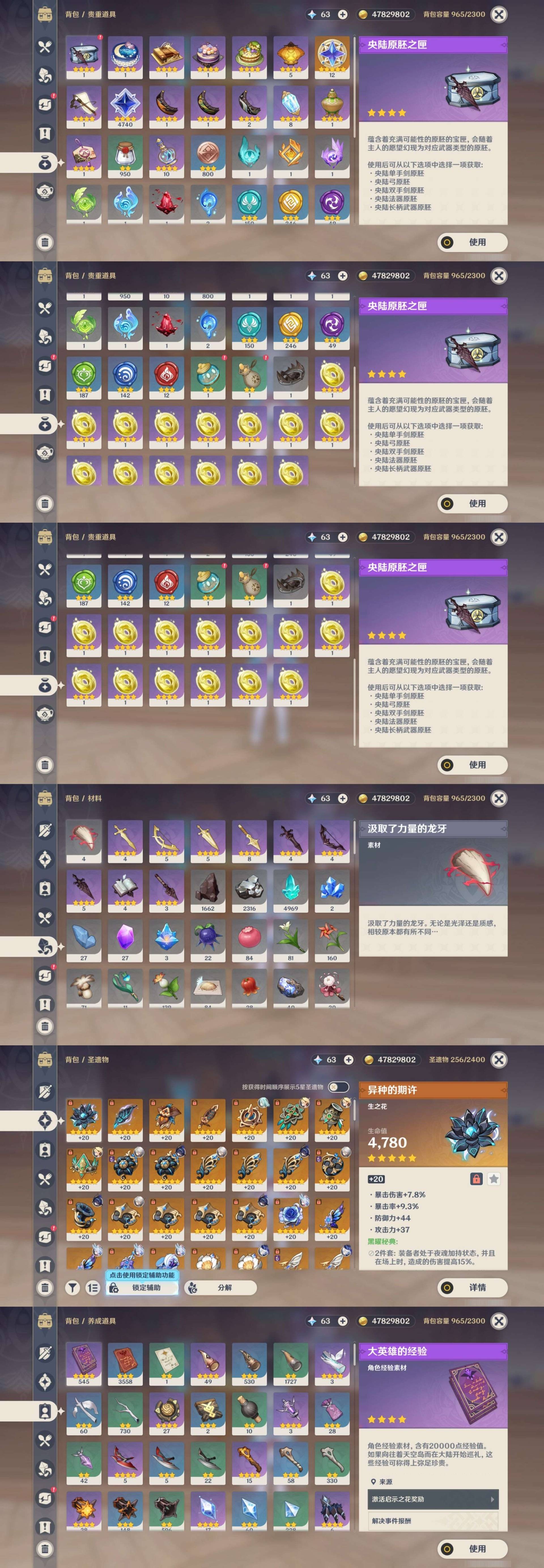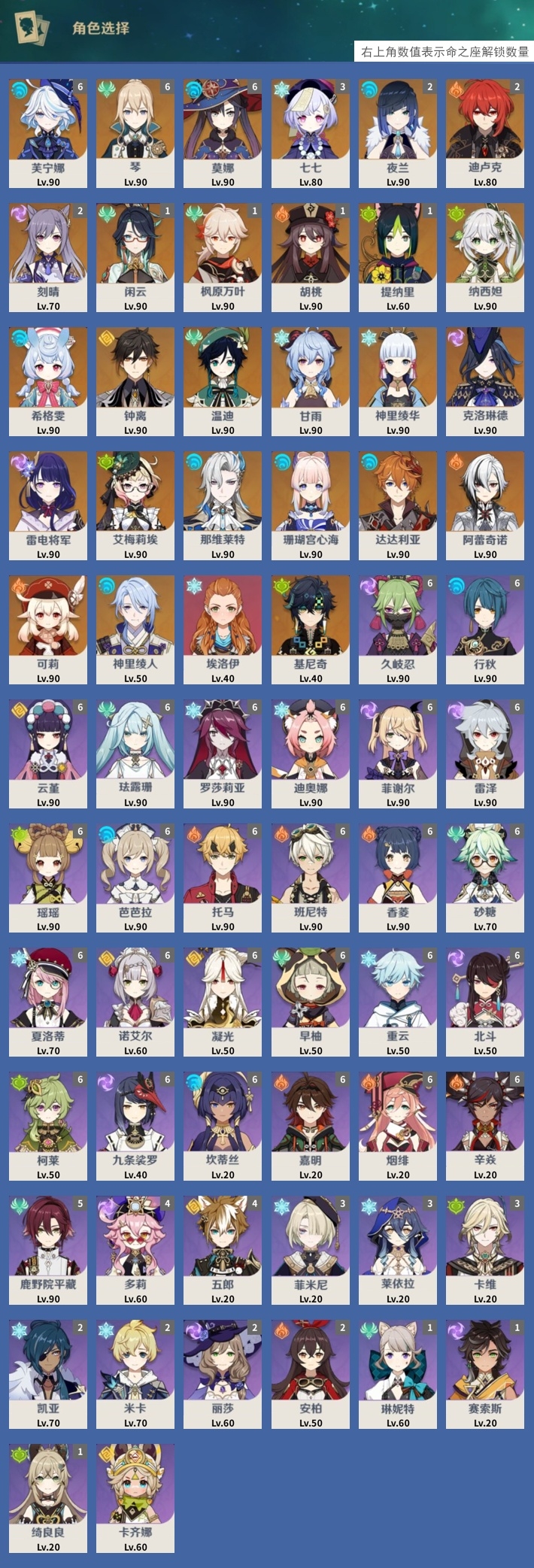 [14030490]83黄 风系:1命闲云/1命枫原万叶/0命温迪/6命琴 火系:0命阿蕾奇诺/1命胡桃/0命可莉/2命迪卢克 水系:0命希格雯/6命芙宁娜/0命那维莱特/2命夜兰/0命珊瑚宫心海/6命莫娜/0命达达利亚/0命神里绫人 冰系:0命甘雨/0命神里绫华/3命七七/0命埃洛伊 岩系:0命钟离 雷系:0命克洛琳德/0命雷电将军/2命刻晴 草系:0命艾梅莉埃/1命提纳里/0命基尼奇/0命纳西妲 [四星角色等级及命座] 风系: 6命珐露珊/5命鹿野院平藏/6命砂糖/1命琳妮特/6命早柚 火系: 6命托马/6命班尼特/6命香菱/2命安柏/6命嘉明/6命烟绯/6命辛焱 水系:6命芭芭拉/6命坎蒂丝/6命行秋 冰系:6命罗莎莉亚/6命迪奥娜/2命凯亚/6命夏洛蒂/2命米卡/6命重云/3命菲米尼/3命莱依拉 岩系:6命云堇/6命诺艾尔/6命凝光/4命五郎 雷系:6命菲谢尔/6命雷泽/4命多莉/2命丽莎/6命北斗/6命九条裟罗/1命赛索斯/6命久岐忍 草系:6命瑶瑶/6命柯莱/3命卡维/1命绮良良 [角色经验书] 紫色545/蓝色3558/绿色1 [小物品] 异梦溶媒8/嬗变之尘950 [特殊材料] 东风之翎19/东风之爪11/东风的吐息33/北风之尾1/北风之环22/北风的魂匣37/吞天之鲸·只角27 魔王之刃·残片15/武炼之魂·孤影29/龙王之冕10/血玉之枝12/鎏金之鳞10/智识之冕19