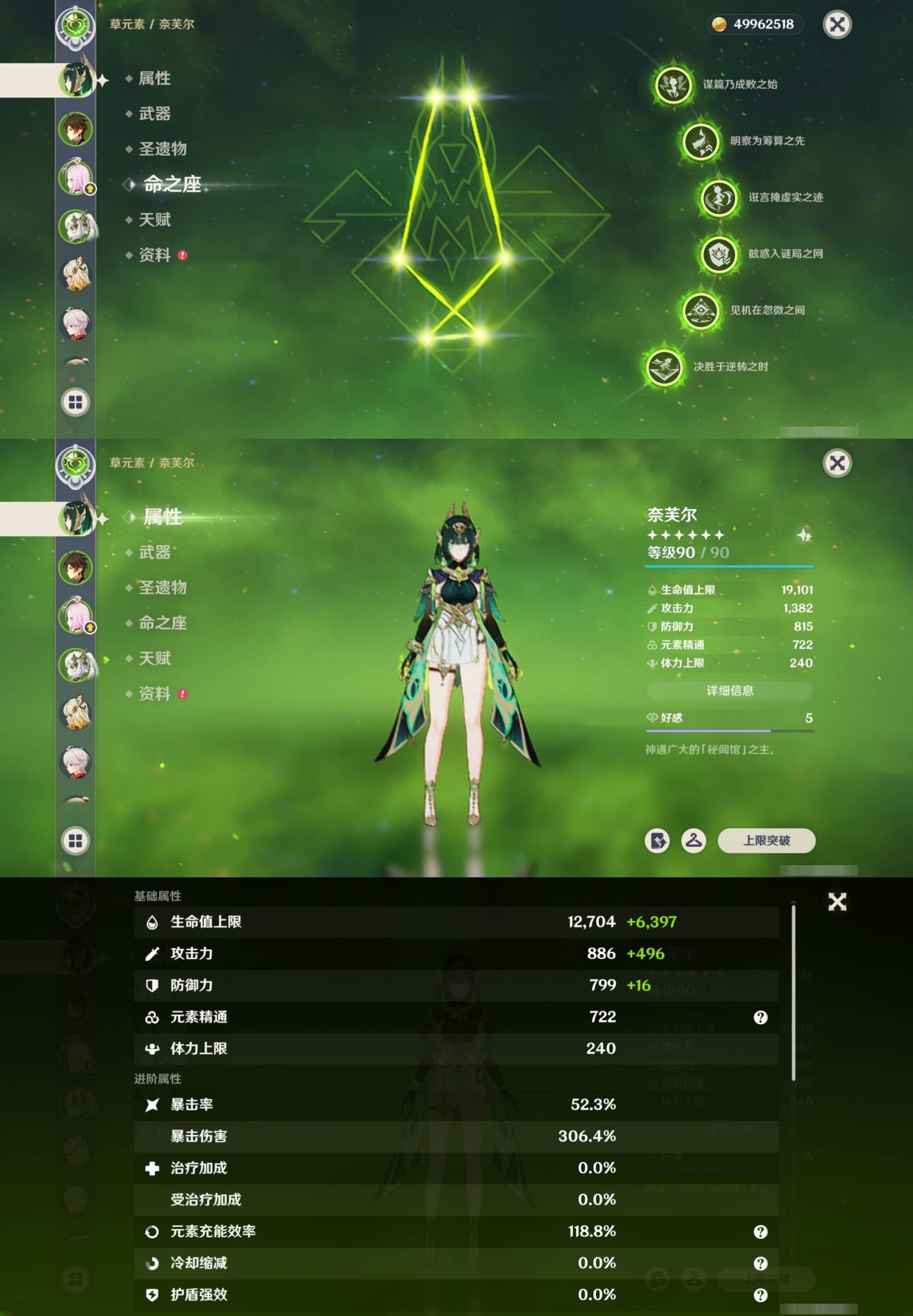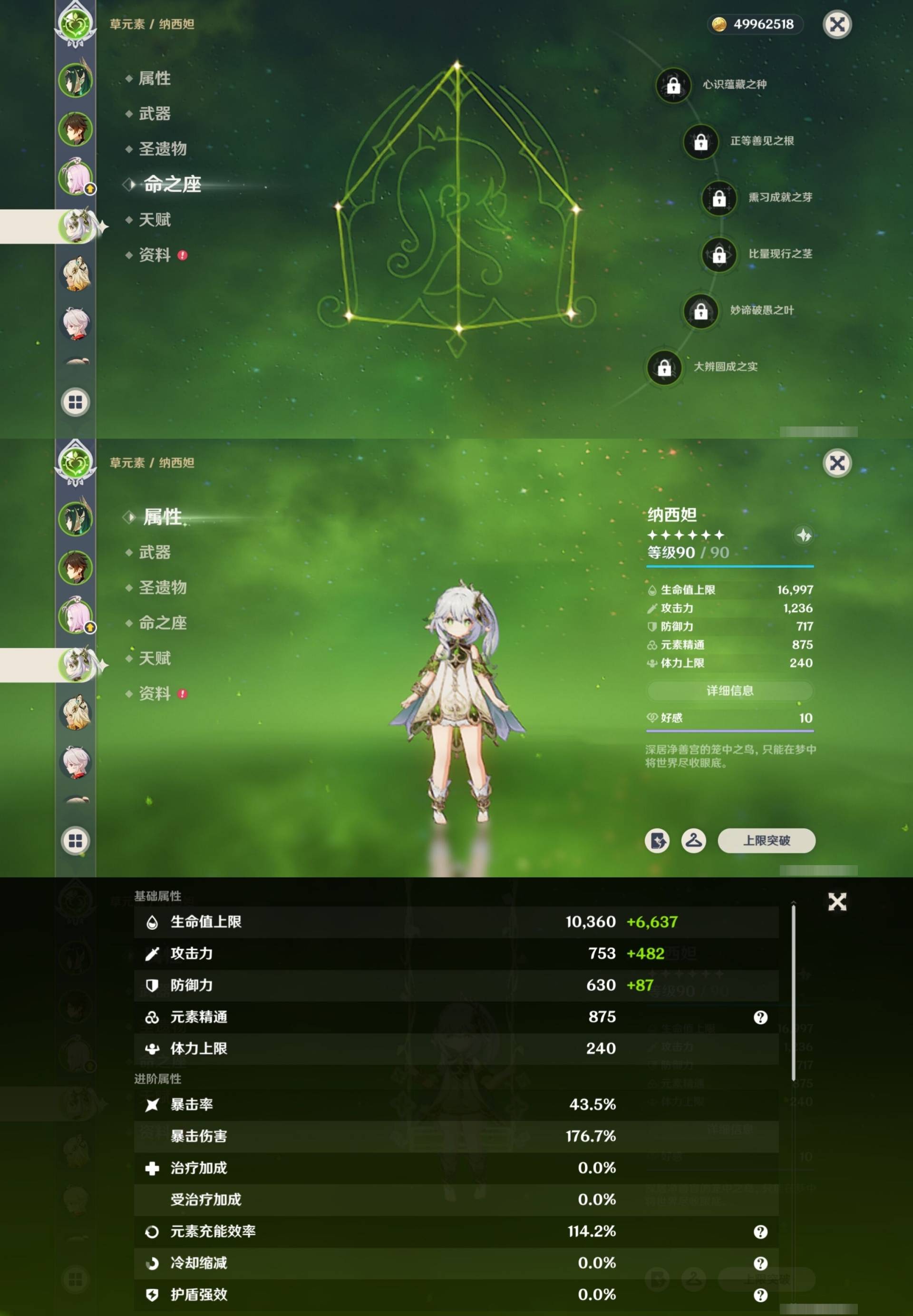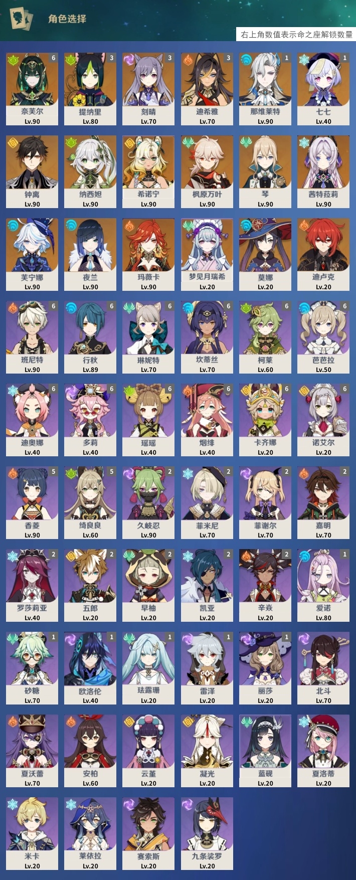 [14030501]43黄 风:0命枫原万叶,0命琴,0命梦见月瑞希 火:0命玛薇卡,3命迪希雅,0命迪卢克 水:0命芙宁娜,1命那维莱特,0命夜兰,0命莫娜 冰:0命茜特菈莉,1命七七 岩:0命钟离,0命希诺宁 雷:3命刻晴 草:6命奈芙尔,0命纳西妲,3命提纳里 法器:精1真语秘匣,精1万世流涌大典 单手剑:精1风鹰剑,精1静水流涌之辉 双手剑:精1焚曜千阳,精1狼的末路 长柄武器:精1和璞鸢,精1和璞鸢 【角色皮肤】 四星角色:班尼特-炽绘奇旅,香菱-岁夜欢哗,绮良良-倩影游侠,行秋-雨化竹身