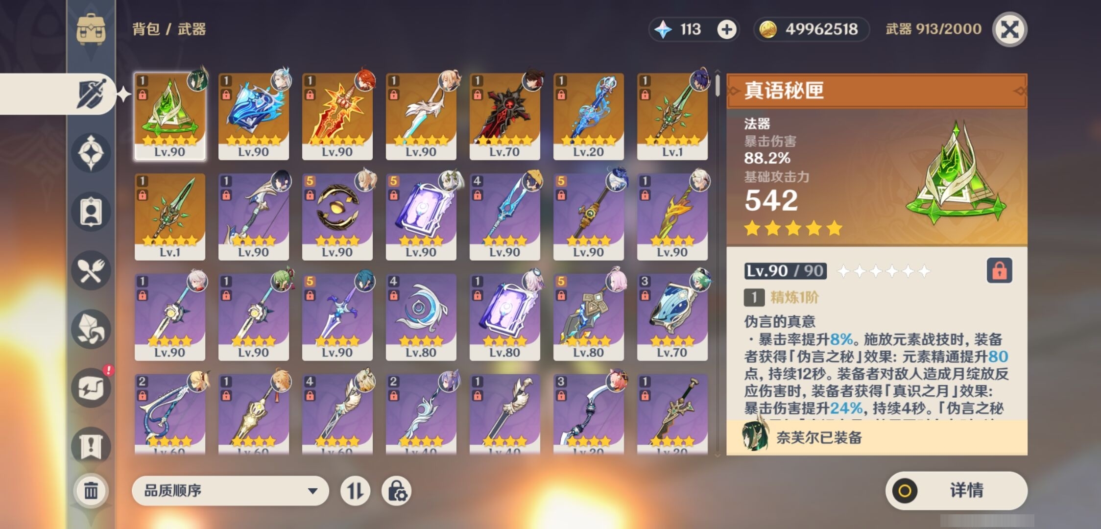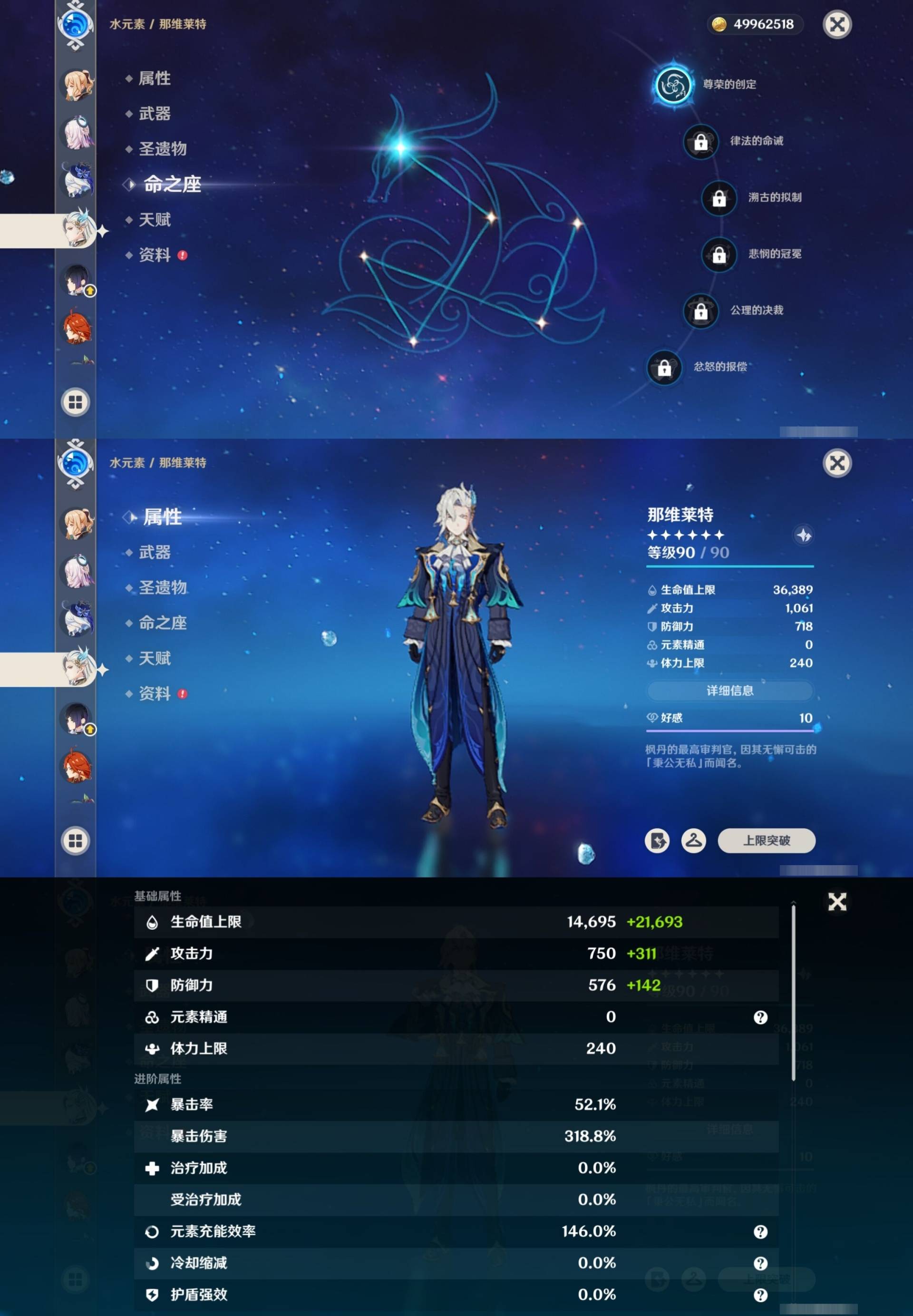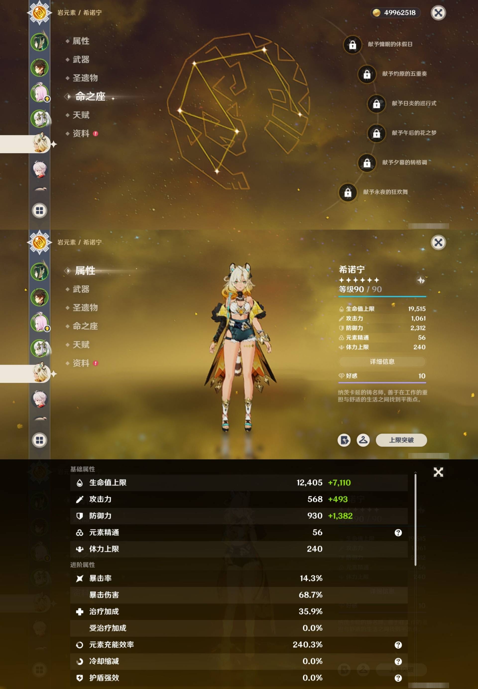 [14030501]43黄 风:0命枫原万叶,0命琴,0命梦见月瑞希 火:0命玛薇卡,3命迪希雅,0命迪卢克 水:0命芙宁娜,1命那维莱特,0命夜兰,0命莫娜 冰:0命茜特菈莉,1命七七 岩:0命钟离,0命希诺宁 雷:3命刻晴 草:6命奈芙尔,0命纳西妲,3命提纳里 法器:精1真语秘匣,精1万世流涌大典 单手剑:精1风鹰剑,精1静水流涌之辉 双手剑:精1焚曜千阳,精1狼的末路 长柄武器:精1和璞鸢,精1和璞鸢 【角色皮肤】 四星角色:班尼特-炽绘奇旅,香菱-岁夜欢哗,绮良良-倩影游侠,行秋-雨化竹身