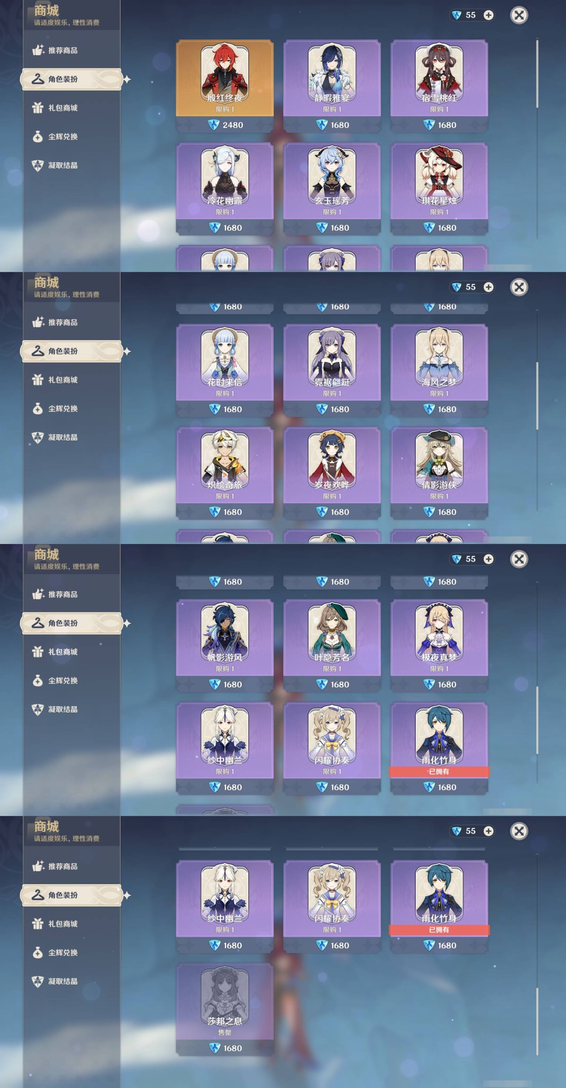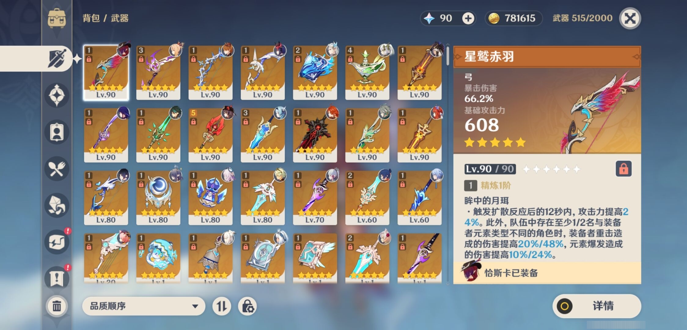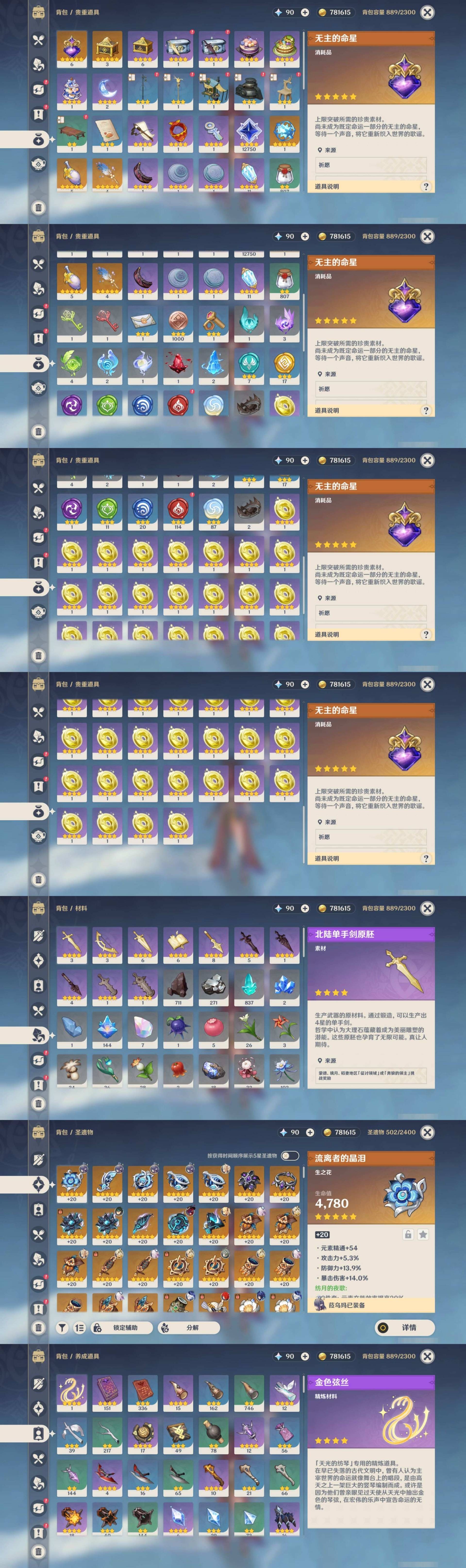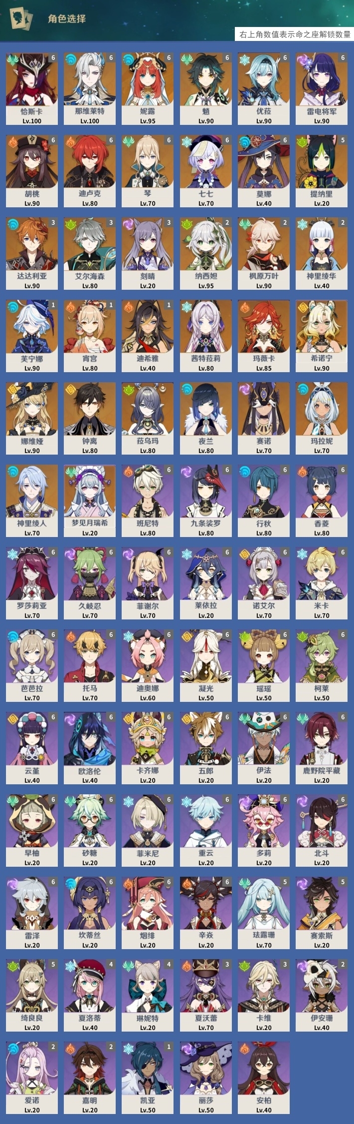 [14030528]164黄 风:6命恰斯卡,2命枫原万叶,6命魈,6命琴,0命梦见月瑞希 火:0命玛薇卡,6命胡桃,1命宵宫,6命迪卢克,1命迪希雅 水:6命那维莱特,6命妮露,1命芙宁娜,3命达达利亚,0命夜兰,0命玛拉妮,0命神里绫人,6命莫娜 冰:0命茜特菈莉,6命优菈,2命神里绫华,6命七七 岩:0命希诺宁,0命娜维娅,0命钟离 雷:6命雷电将军,0命赛诺,3命刻晴 草:2命纳西妲,0命菈乌玛,3命艾尔海森,5命提纳里 弓:精1星鹫赤羽,精3飞雷之弦振,精1冬极白星,精1阿莫斯之弓,精1若水,精1天空之翼 法器:精2万世流涌大典,精4千夜浮梦,精1纺夜天镜,精1祭星者之望,精1冲浪时光,精1图莱杜拉的回忆,精1四风原典,精1天空之卷 单手剑:精1裁叶萃光,精1圣显之钥,精1天空之刃,精1雾切之回光,精1雾切之回光,精1波乱月白经津,精1风鹰剑 双手剑:精3松籁响起之时,精1狼的末路,精2天空之傲 长柄武器:精1赤沙之杖,精1薙草之稻光,精1和璞鸢,精5护摩之杖,精2天空之脊 【角色皮肤】 五星角色:妮露-莎邦之息 四星角色:行秋-雨化竹身