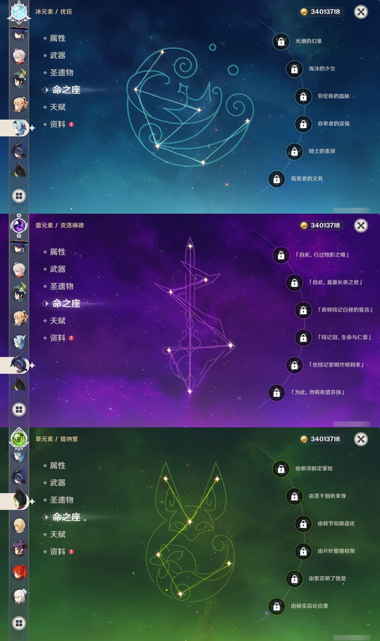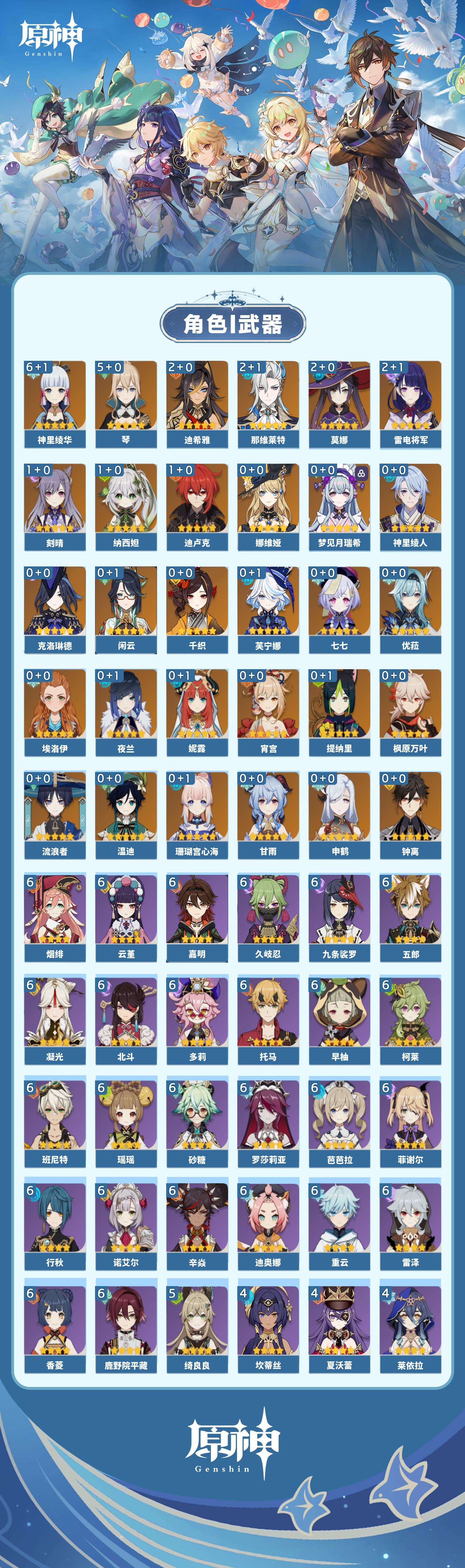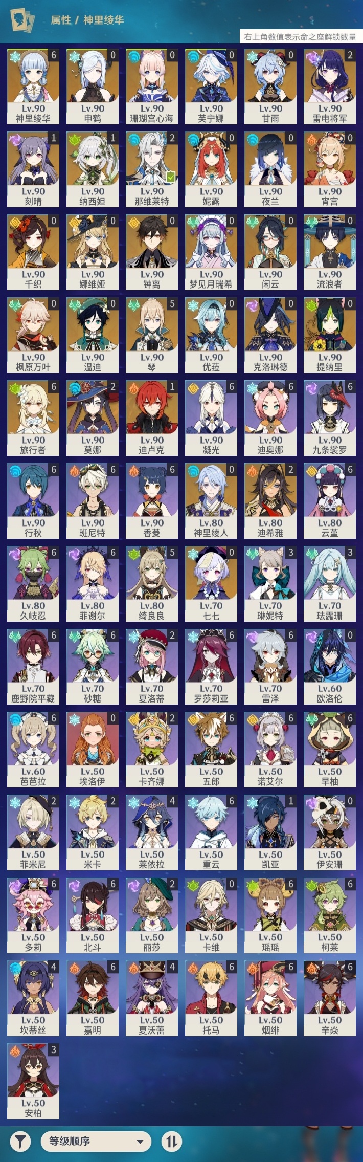 【原神】【lyys8279】冒险等级:60,五星数量:47,五星角色:神里绫华 6命琴 5命迪希雅 2命那维莱特 2命雷电将军 2命莫娜 2命迪卢克 1命刻晴 1命纳西妲 1命七七珊瑚宫心海温迪宵宫优菈钟离梦见月瑞希申鹤神里绫人夜兰芙宁娜娜维娅提纳里闲云千织妮露流浪者枫原万叶甘雨克洛琳德__五星武器:天空之傲 3精天空之卷 2精天空之刃 2精万世流涌大典静水流涌之辉鹤鸣余音不灭月华和璞鸢护摩之杖四风原典天空之脊天空之翼雾切之回光薙草之稻光若水猎人之径圣显之钥__四星角色:班尼特 6命行秋 6命九条裟罗 6命香菱 6命久岐忍 6命鹿野院平藏 6命凝光 6命迪奥娜 6命砂糖 6命瑶瑶 6命多莉 6命柯莱 6命芭芭拉 6命云堇 6命早柚 6命托马 6命五郎 6命烟绯 6命重云 6命辛焱 6命诺艾尔 6命罗莎莉亚 6命雷泽 6命菲谢尔 6命北斗 6命嘉明 6命绮良良 5命莱依拉 4命坎蒂丝 4命夏沃蕾 4命珐露珊 3命琳妮特 3命卡齐娜 2命米卡 2命菲米尼 2命夏洛蒂 2命埃洛伊卡维欧洛伦伊安珊
