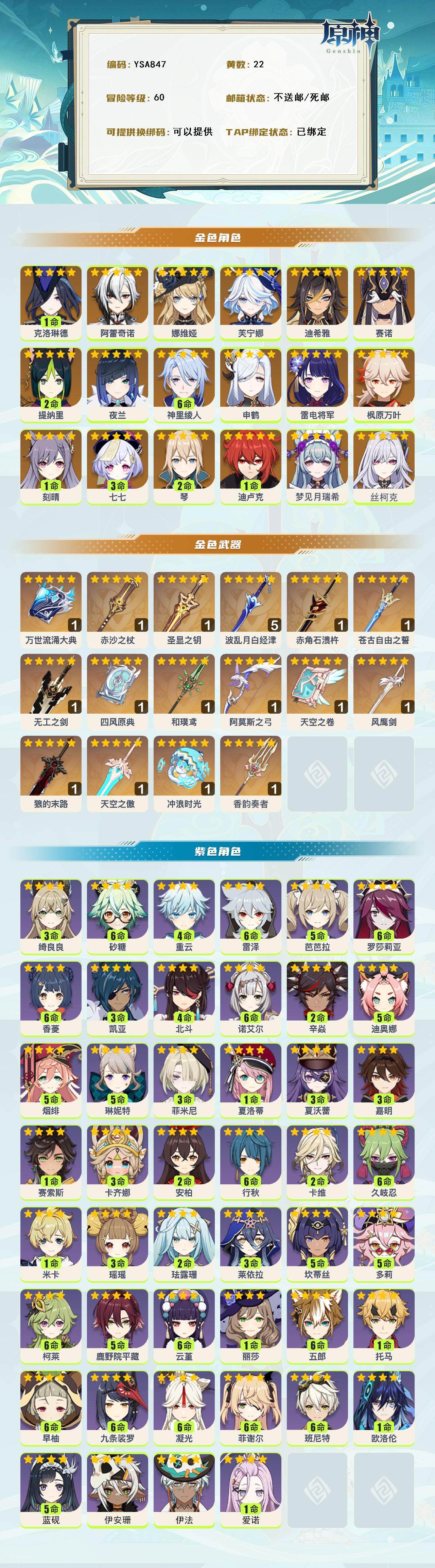 【ysa847】60级/22黄/男主/34个五星角色/0命丝柯克/0命梦见月瑞希/1命克洛琳德/0命阿蕾奇诺/0命娜维娅/0命芙宁娜/0命迪希雅/0命赛诺/2命提纳里/0命夜兰/满命神里绫人/0命申鹤/0命雷电将军/0命枫原万叶/2命琴/1命刻晴/1命迪卢克/3命七七/精1香韵奏者/精1冲浪时光/精1万世流涌大典/精1圣显之钥/精1赤沙之杖/精5波乱月白经津/精1赤角石溃杵/精1苍古自由之誓/精1无工之剑/精1天空之傲/精1和璞鸢/精1天空之卷/精1四风原典/精1狼的末路/精1阿莫斯之弓/精1风鹰剑/1命爱诺/0命伊法/0命伊安珊/5命蓝砚/0命欧洛伦/3命卡齐娜/1命赛索斯/3命嘉明/3命夏沃蕾/0命夏洛蒂/3命菲米尼/5命琳妮特/3命绮良良/2命卡维/1命米卡/3命瑶瑶/2命珐露珊/3命莱依拉/5命坎蒂丝/5命多莉/满命柯莱/5命鹿野院平藏/满命久岐忍/满命云堇/满命五郎/1命托马/满命九条裟罗/满命早柚/5命烟绯/满命罗莎莉亚/2命辛焱/5命迪奥娜/满命砂糖/满命雷泽/满命菲谢尔/0命丽莎/4命北斗/满命香菱/2命安柏/满命班尼特/满命行秋/5命芭芭拉/满命凝光/满命诺艾尔/3命凯亚/4命重云